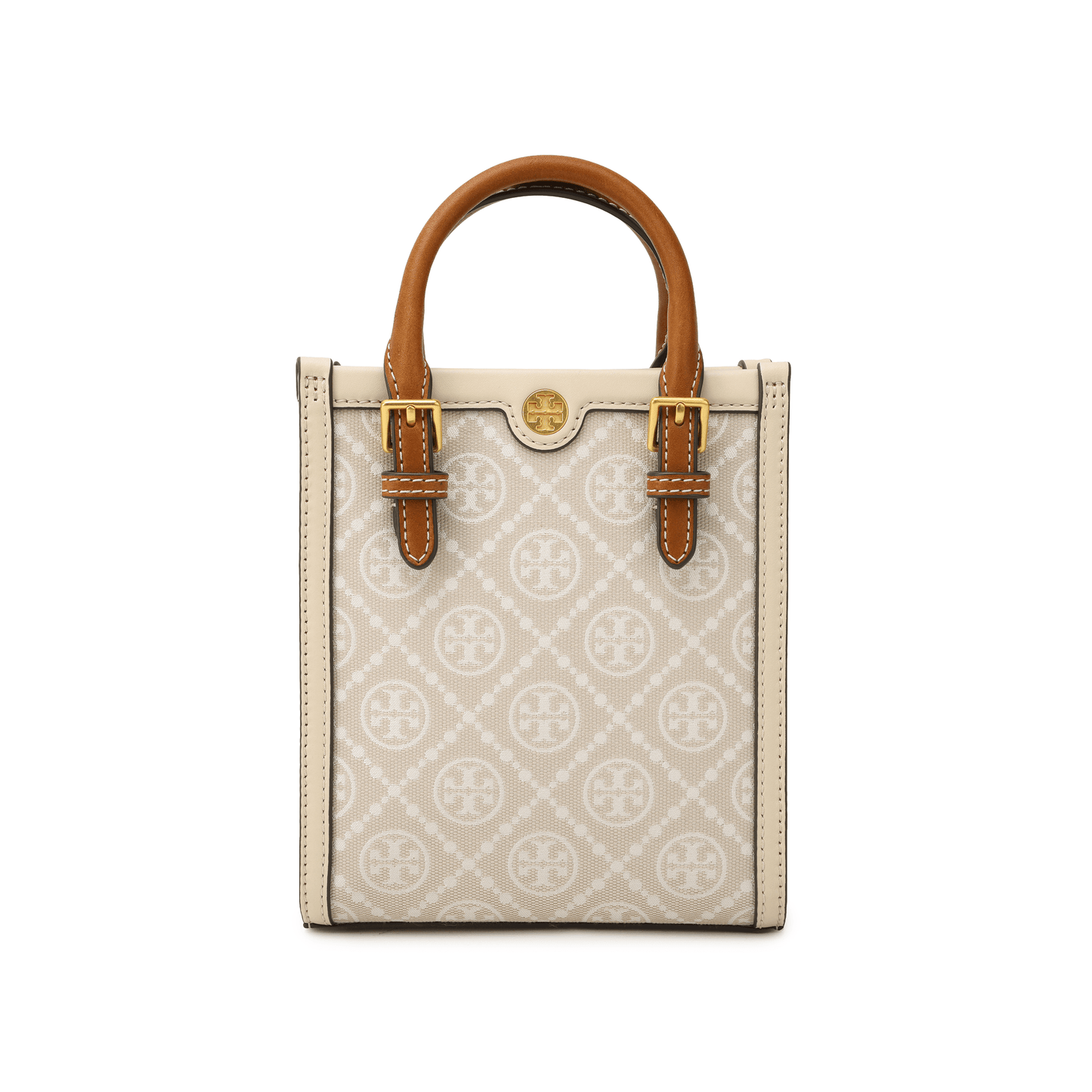 Мини-сумка с полным принтом старого цветочного узора и логотипом "T", выполненная из жаккардовой ткани и телячьей кожи в цвете миндального белого. Оснащена съемным плечевым ремнем, эта универсальная сумка подходит для носки через плечо или в руках. Идеальна для повседневного использования, добавляя стиль и элегантность в любой образ.
