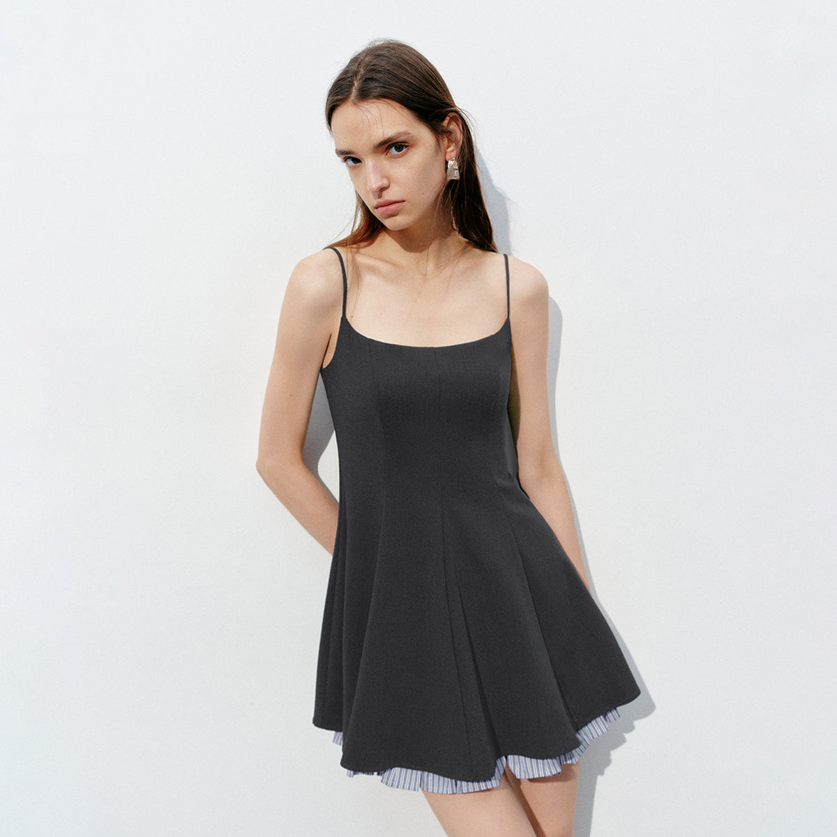 Элегантное облегающее платье без рукавов с контрастной отделкой, складками и квадратным вырезом. Модель из лёгкой смесовой ткани создаёт изысканный и стильный образ, подходящий для прохладной погоды.