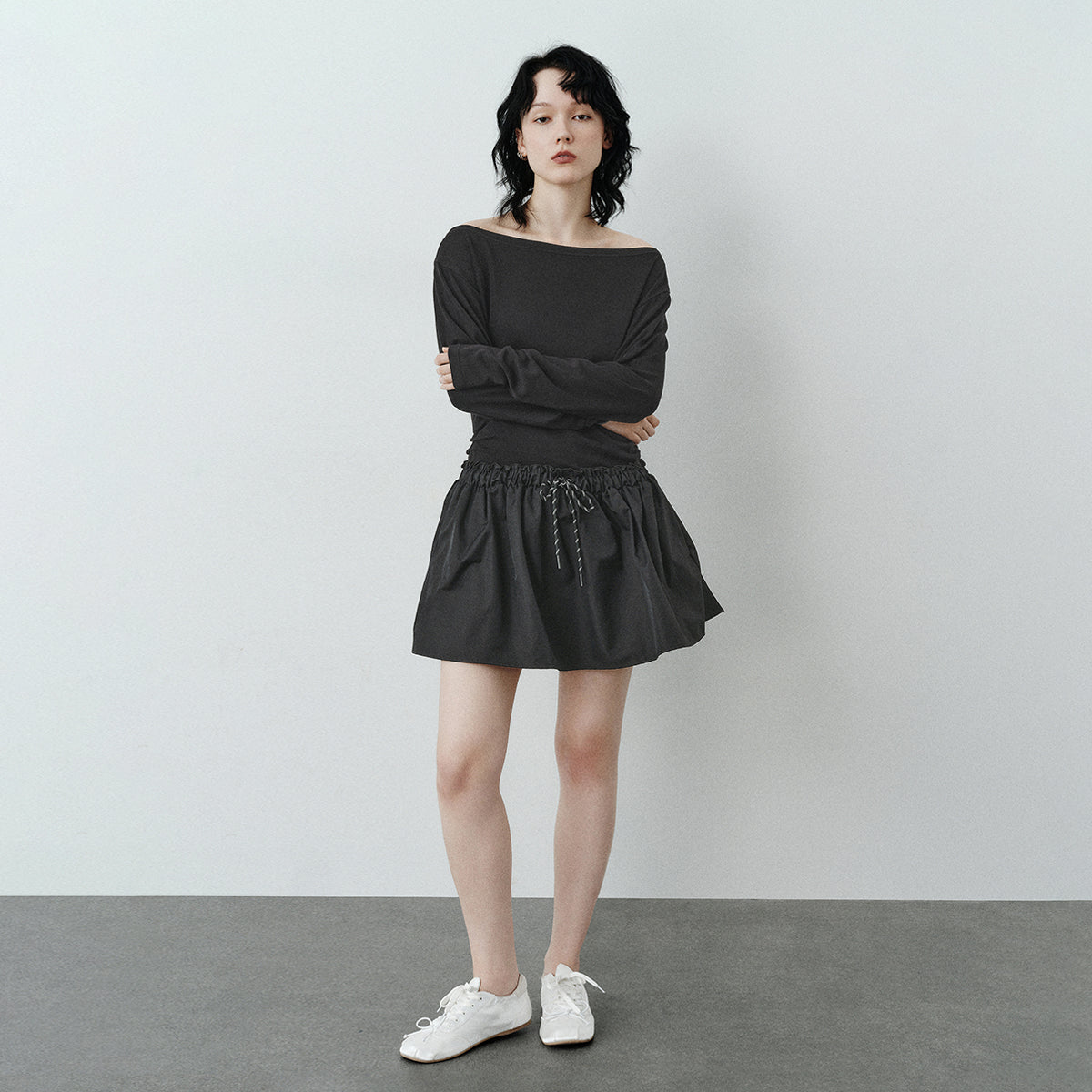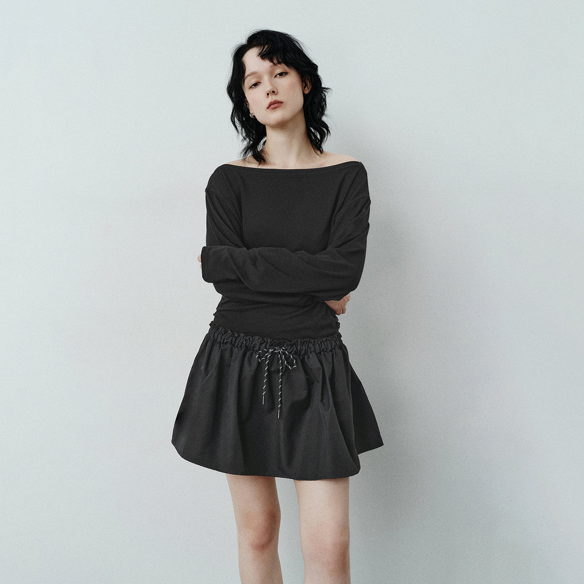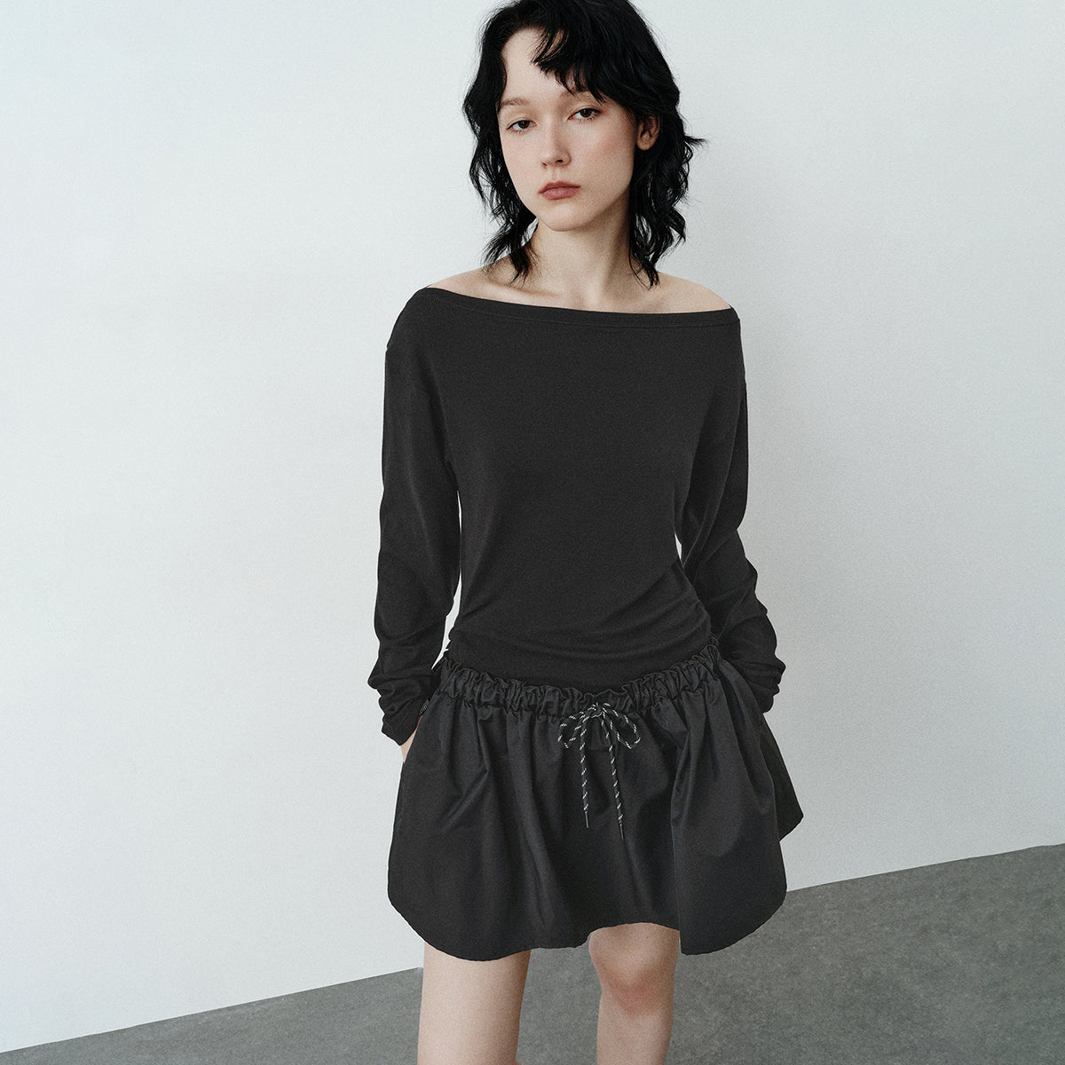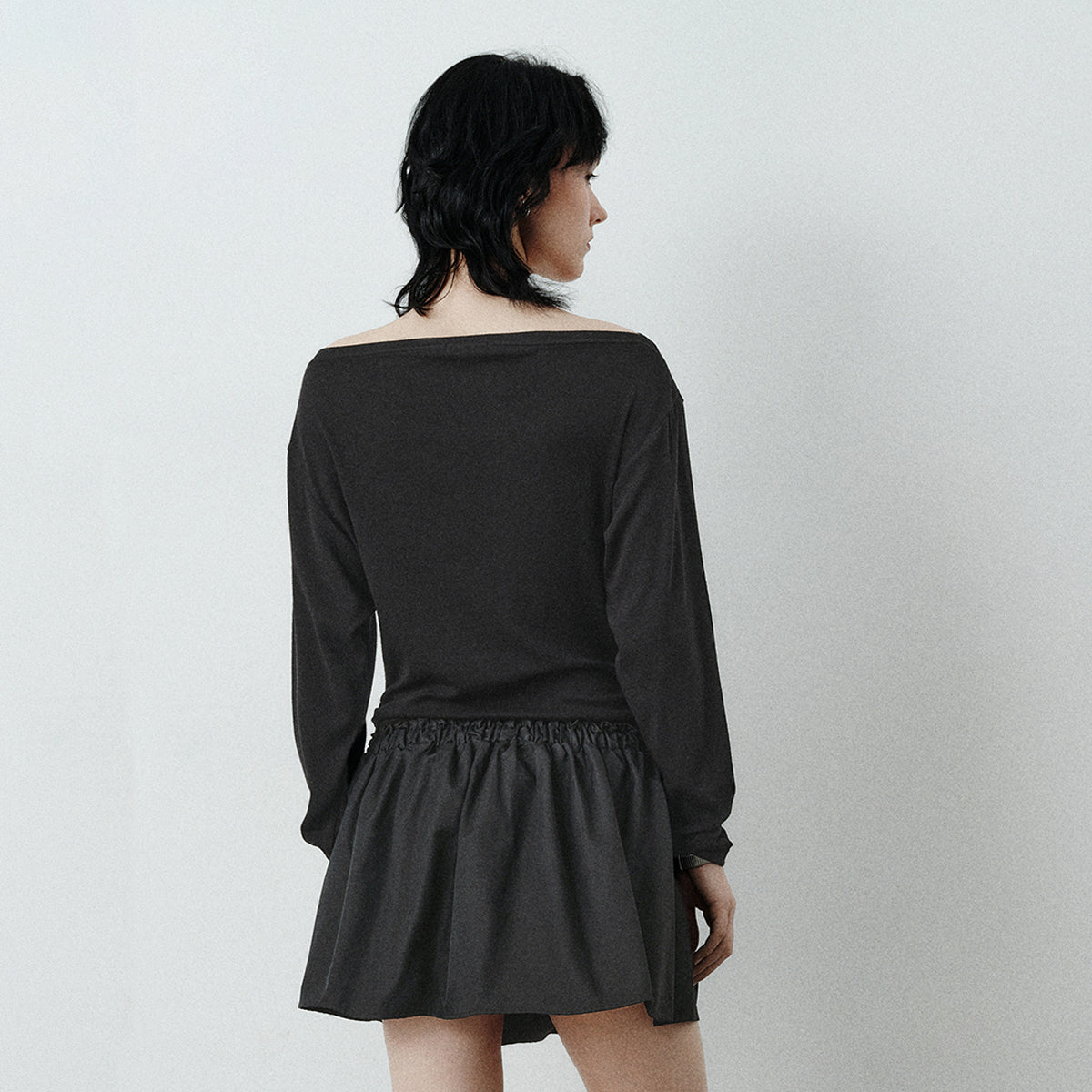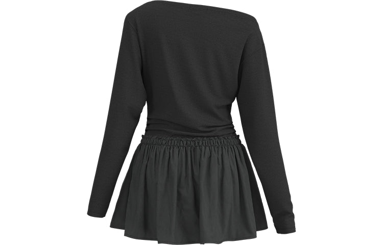 Элегантное платье с асимметричным вырезом и комбинированной отделкой, подчеркивающее фигуру. Модель с длинными рукавами и укороченным силуэтом создает стильный образ для особых случаев.
