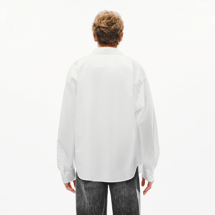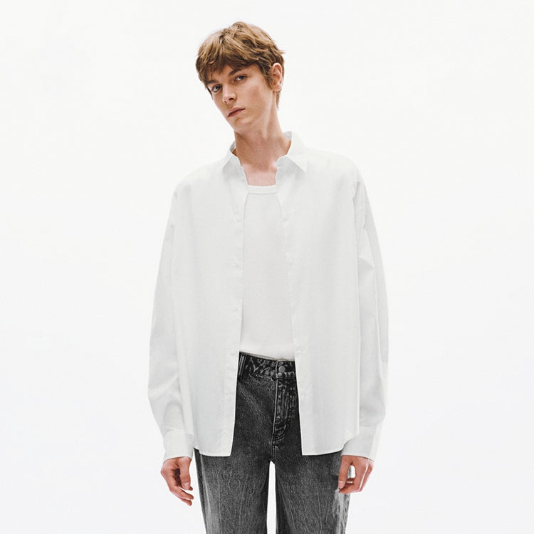 Рубашка свободного кроя с воротником-стойкой и заниженной линией плеча, выполненная из дышащего хлопка. Модель с застежкой на пуговицах представляет собой универсальный базовый элемент для умного кэжуал-стиля.