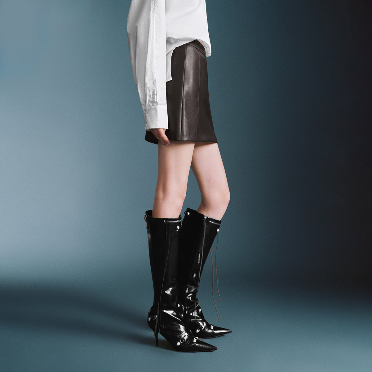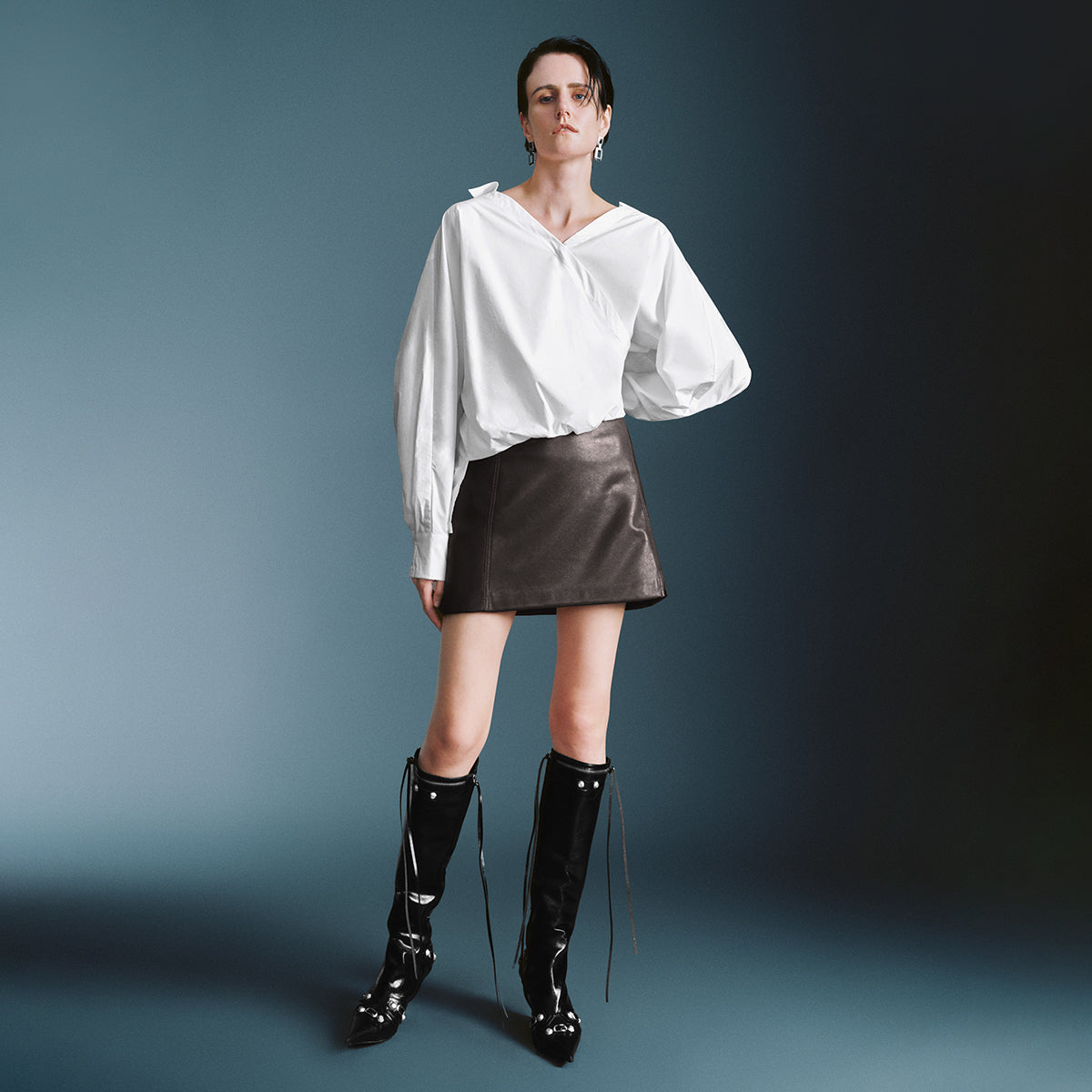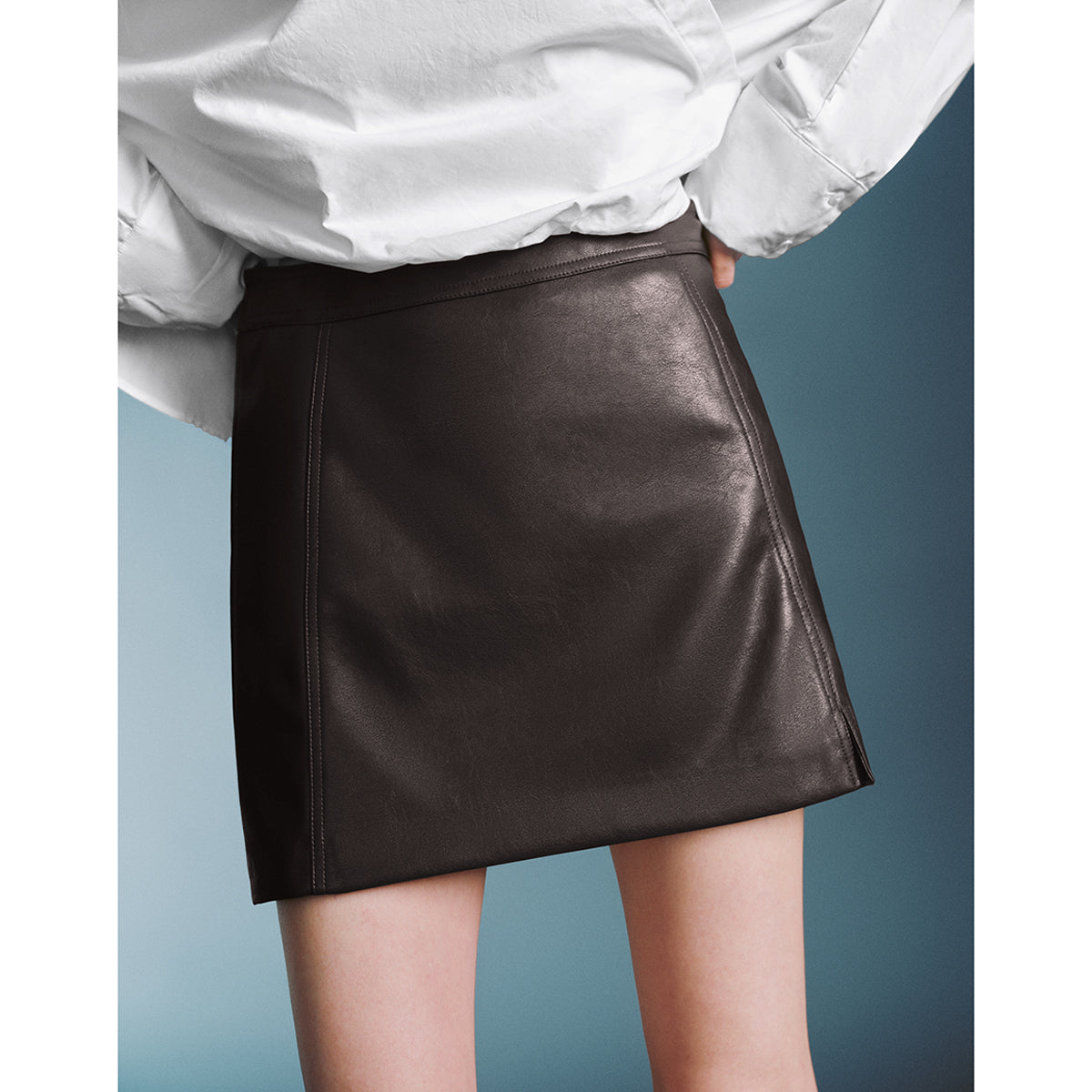 Модная облегающая юбка-мини из ткани с покрытием и высоким поясом. Универсальная и стильная модель создаёт современный летний образ.