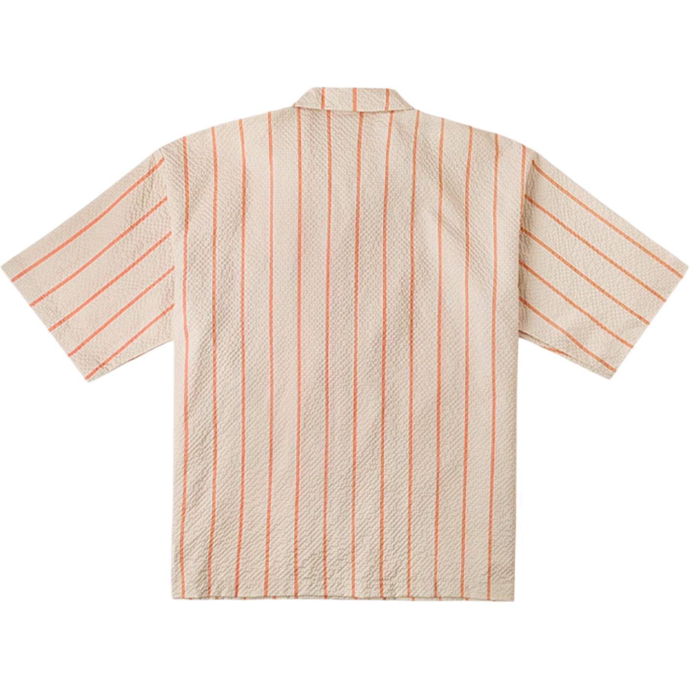 Рубашка с воротником-стойкой и застежкой на пуговицах, украшенная оранжевыми полосками и графикой. Модель представляет собой яркий элемент летнего гардероба.