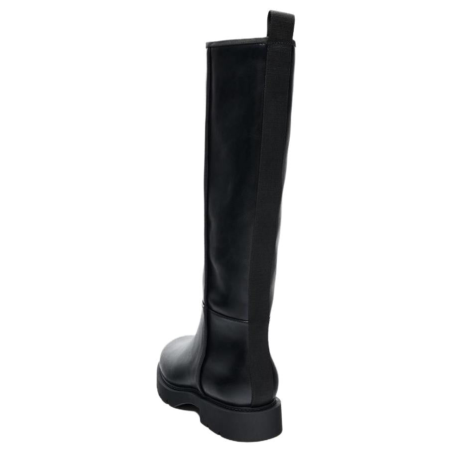 Удобные высокие ботинки‑сапоги без шнурков и застёжек (slip‑on), с низким каблуком ~3 см, выполненные из искусственной кожи (PU), в чёрном цвете. Подходят для повседневной носки и хорошо сочетаются с разными стилями.