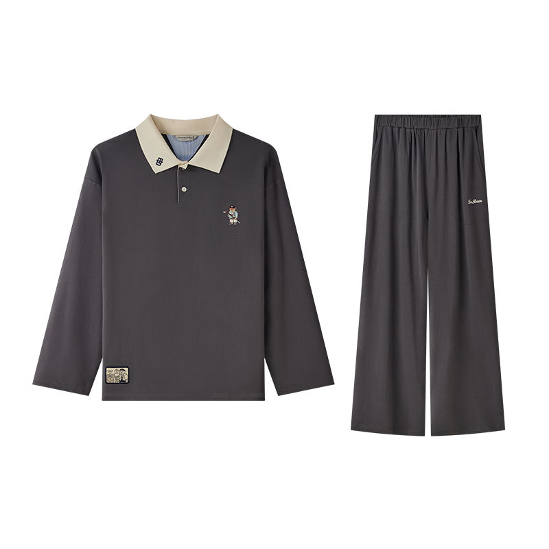 Yumshoq, qulay matodan tikilgan issiq dam olish kiyimlari to'plami, shu jumladan kaputli kardigan va uzun shim. Ushbu erkaklar to'plami uyda...