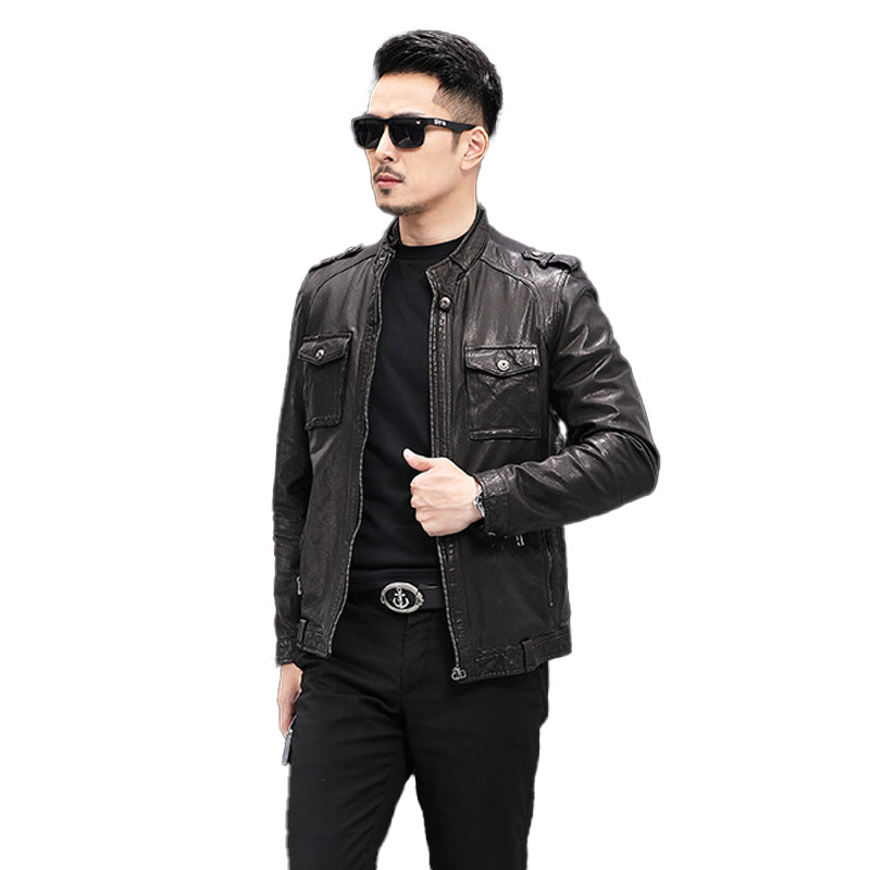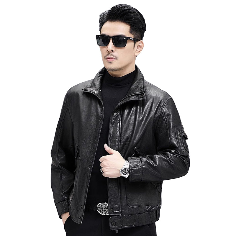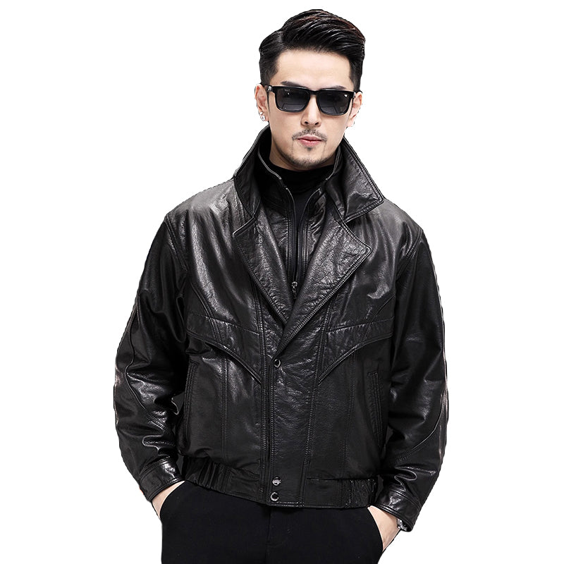 Yumshoq baraban qirqqichidan tikilgan va pastga tushadigan yoqali klassik erkaklar uchun tekis bichimli charm kurtka. Kundalik va kundalik ko'rinish uchun...