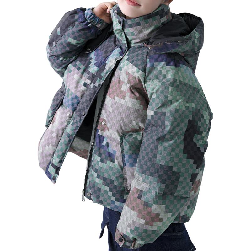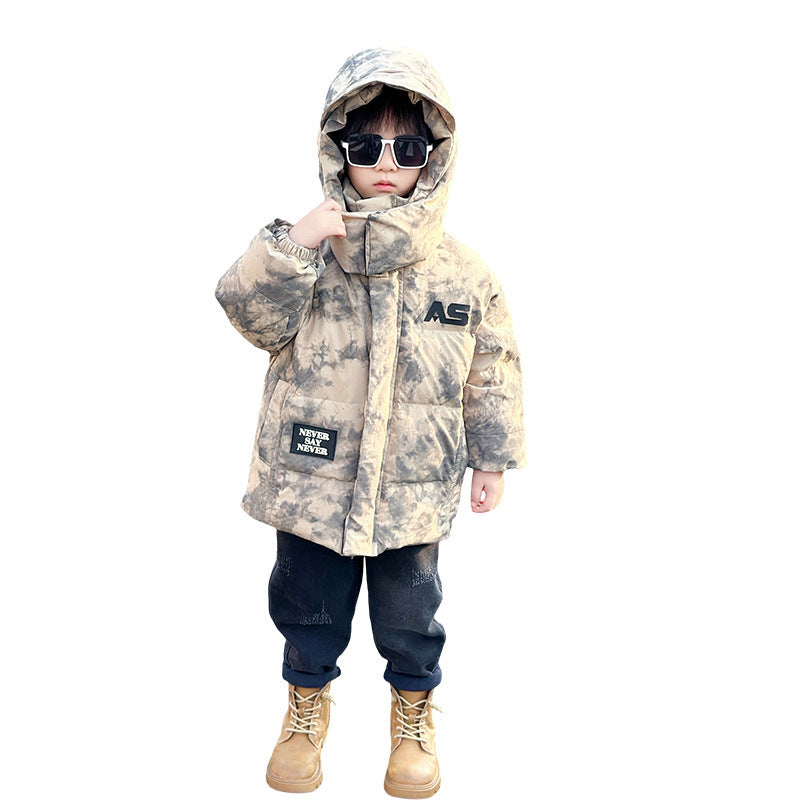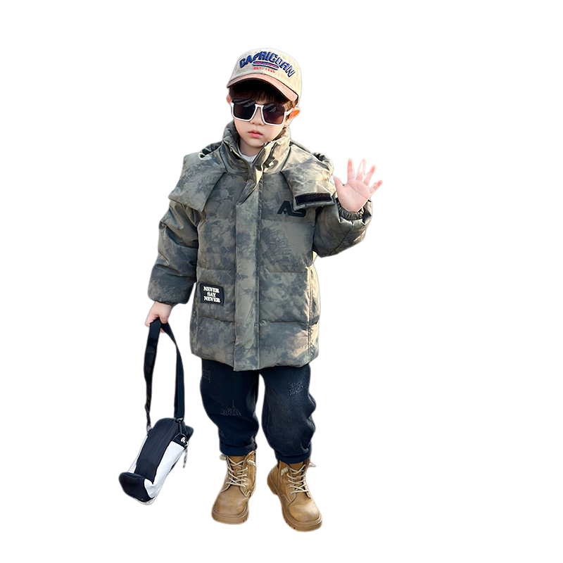 Детский пуховик для мальчиков с камуфляжным принтом и съемным капюшоном, наполненный белым утиным пухом с высоким наполнением. Модель свободного кроя...