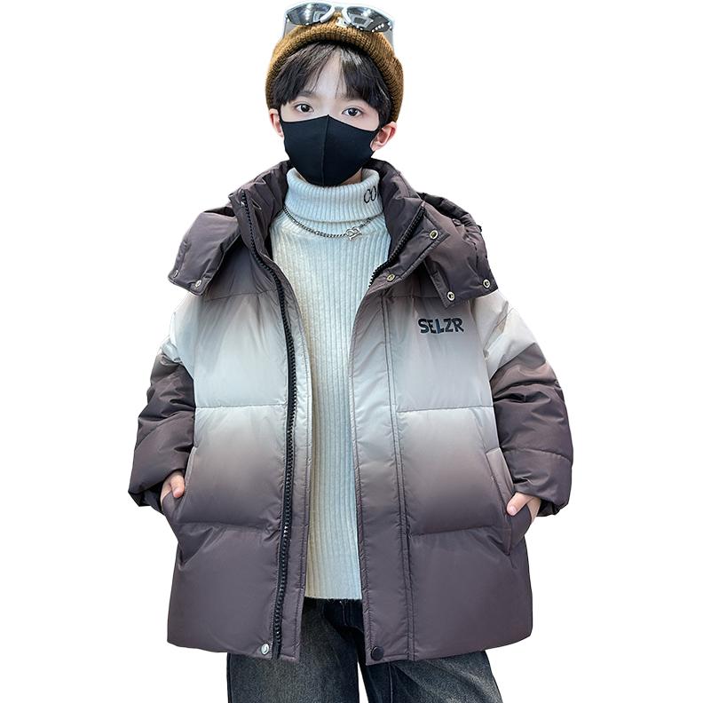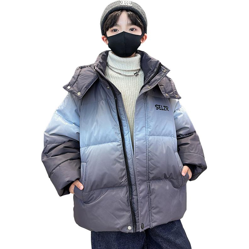 Пуховик для мальчиков в стиле «пуховик» с капюшоном и градиентным эффектом, наполненный белым утиным пухом. Модель свободного кроя обеспечивает тепло,...