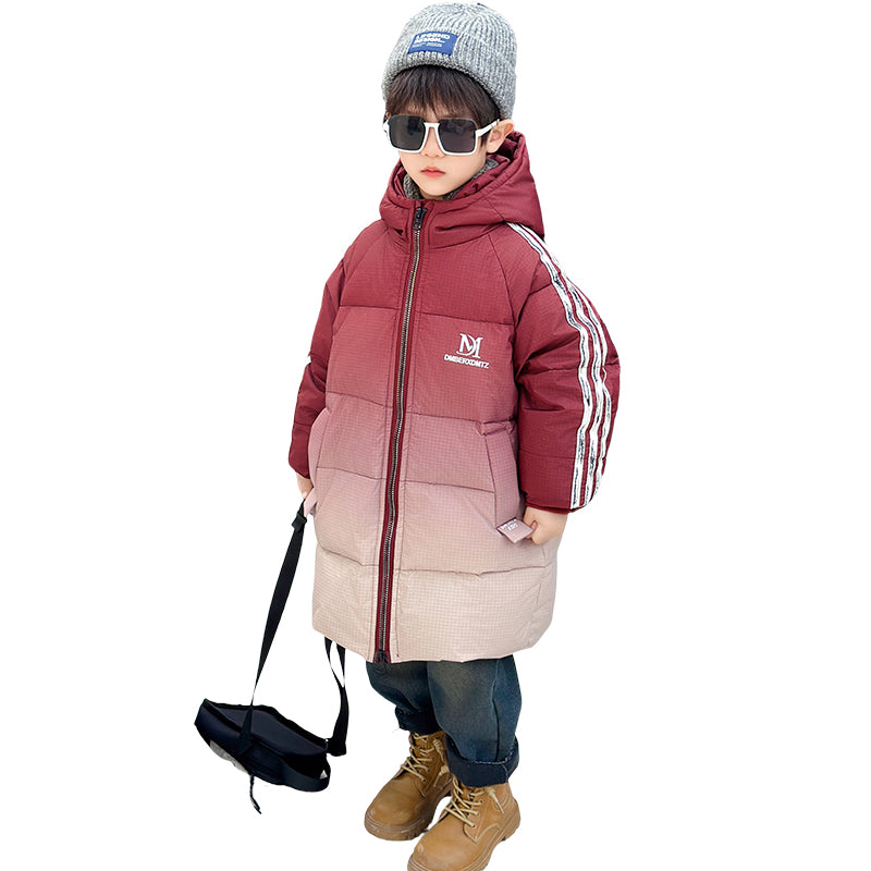 Длинный детский пуховик с капюшоном и декоративной тесьмой, украшенный градиентным принтом в виде букв. Модель свободного кроя в ретро-спортивном стиле...
