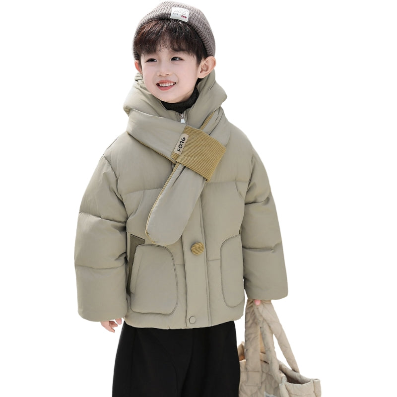 Bolalar uchun bu issiq qishki kombinezon sovuq mavsumda qulaylik va issiqlikni ta'minlovchi kontrastli qalpoq va yumshoq astarga ega.