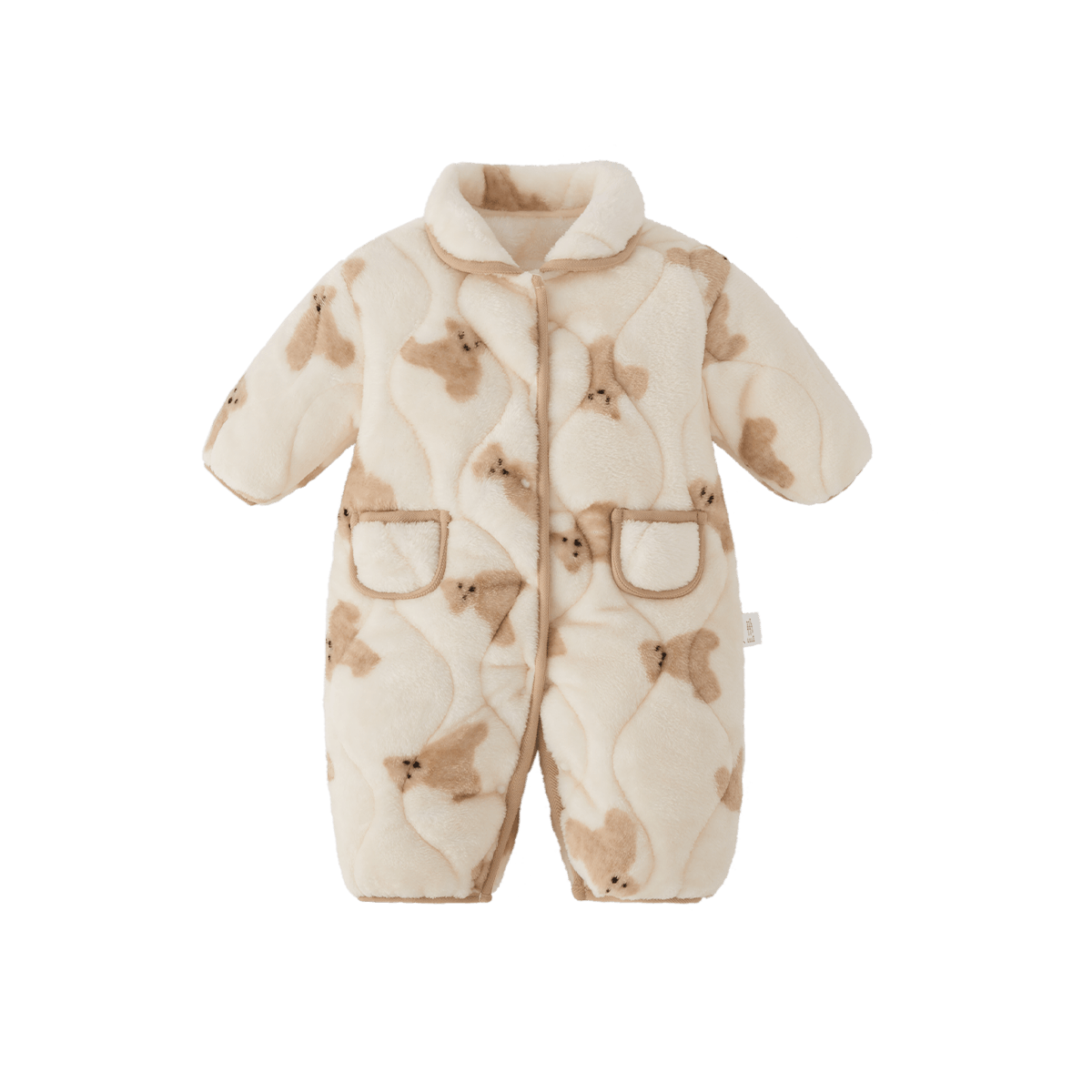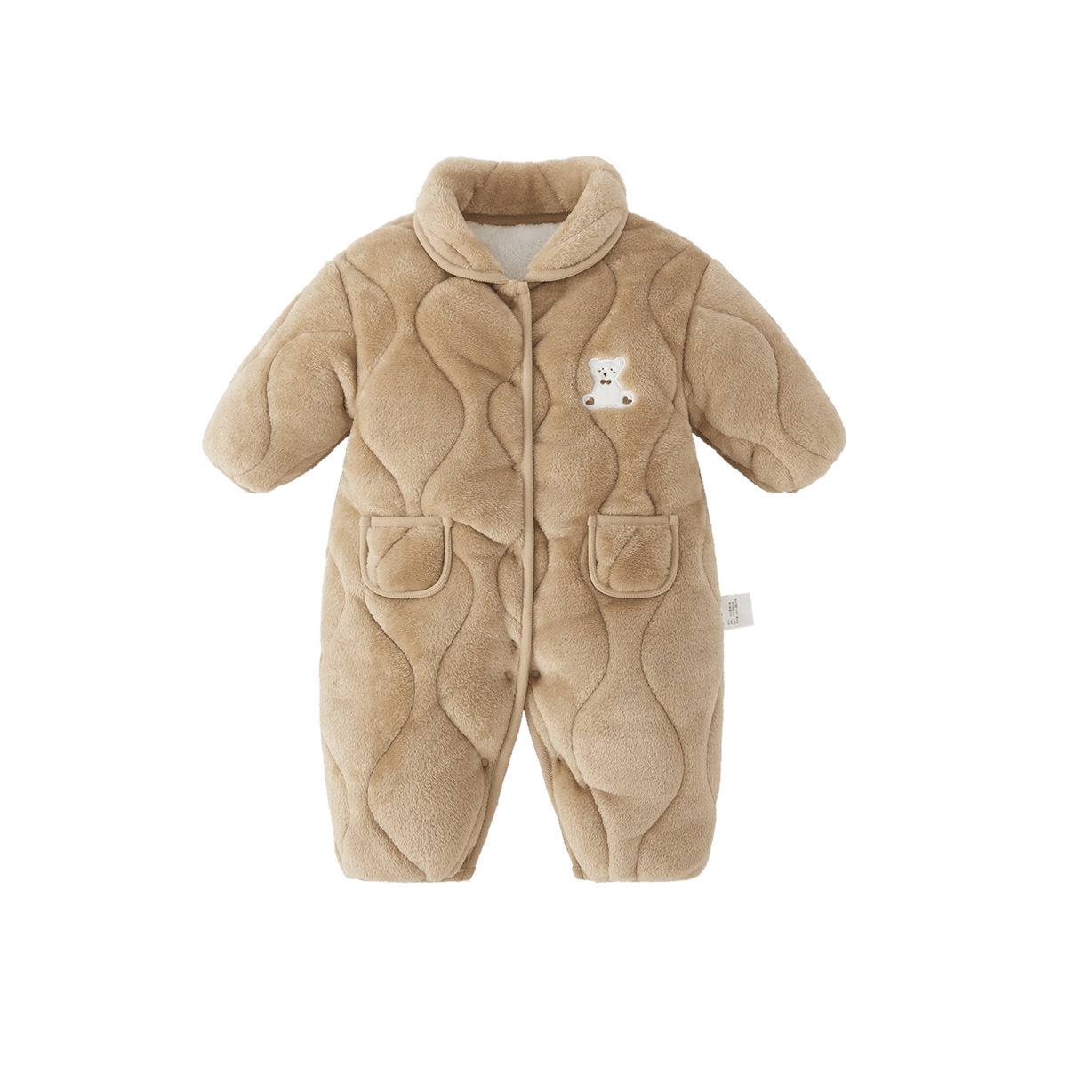 Yumshoq jun matodan tikilgan bu issiq, uzun yengli bolalar kombinezoni kuz faslida chaqalog'ingizni issiq va qulay saqlaydi. Tarkibi: 100% polyester.