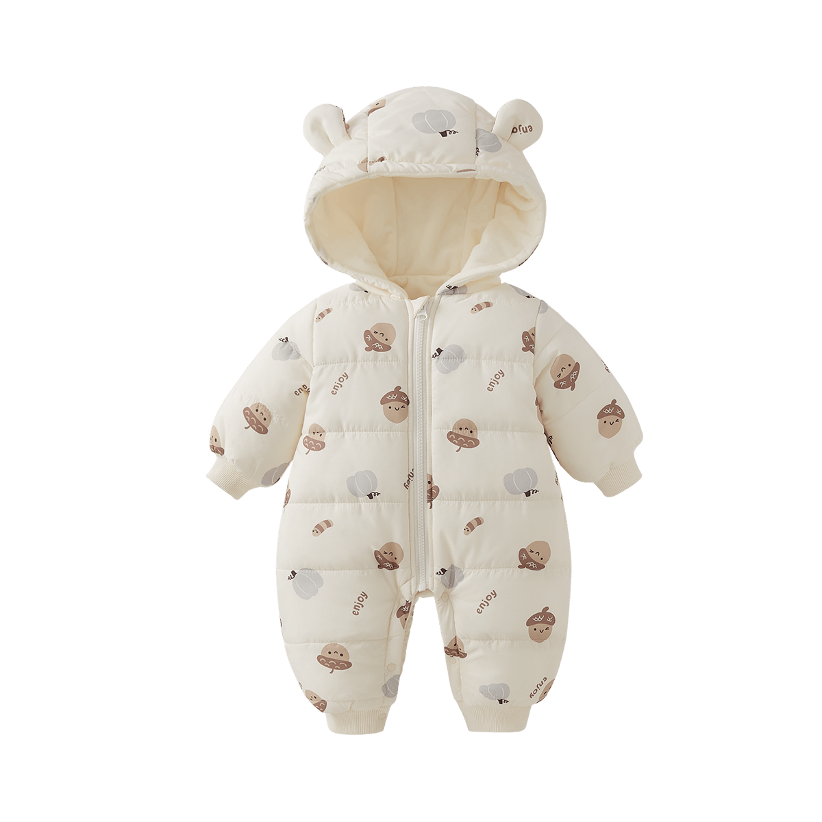 Bolalar uchun qalpoqli, tanaga qulay va yoqimli, sovuq mavsumda kundalik kiyishga mos keladigan yumshoq va issiq kombinezon.