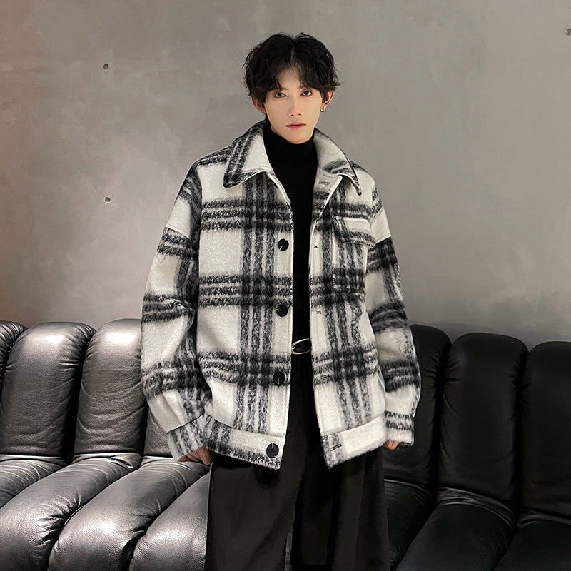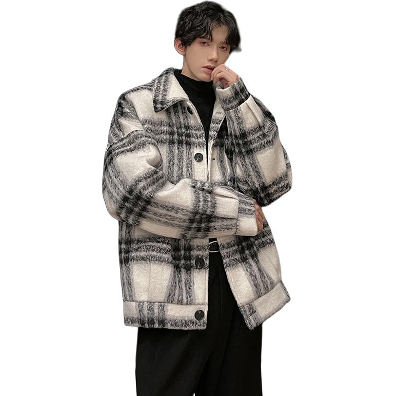Мужское пальто в американском стиле с винтажным твидовым дизайном и однобортной застежкой. Модель с длинными рукавами и отложным воротником выполнена из шерстяной ткани с клетчатым узором, сочетает тепло и стиль для весны, осени и зимы.