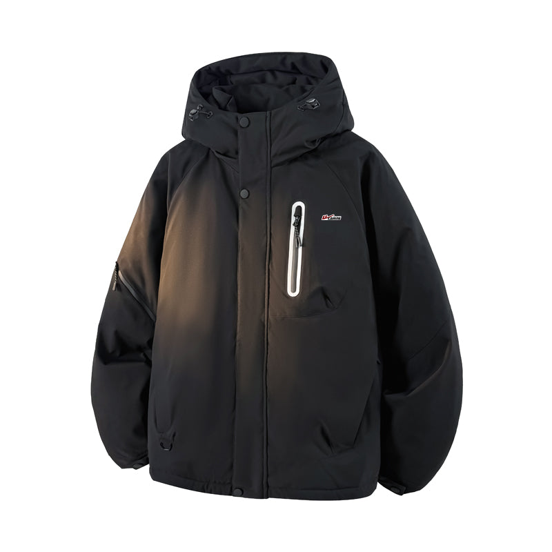 Пуховик для активного отдыха с капюшоном, выполненный из водоотталкивающей ткани с утепленной подкладкой. Модель свободного кроя наполнена утиным пухом, обеспечивая защиту от холода, ветра и влаги в городских условиях.