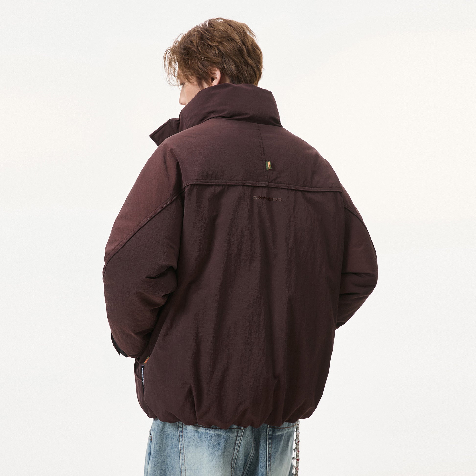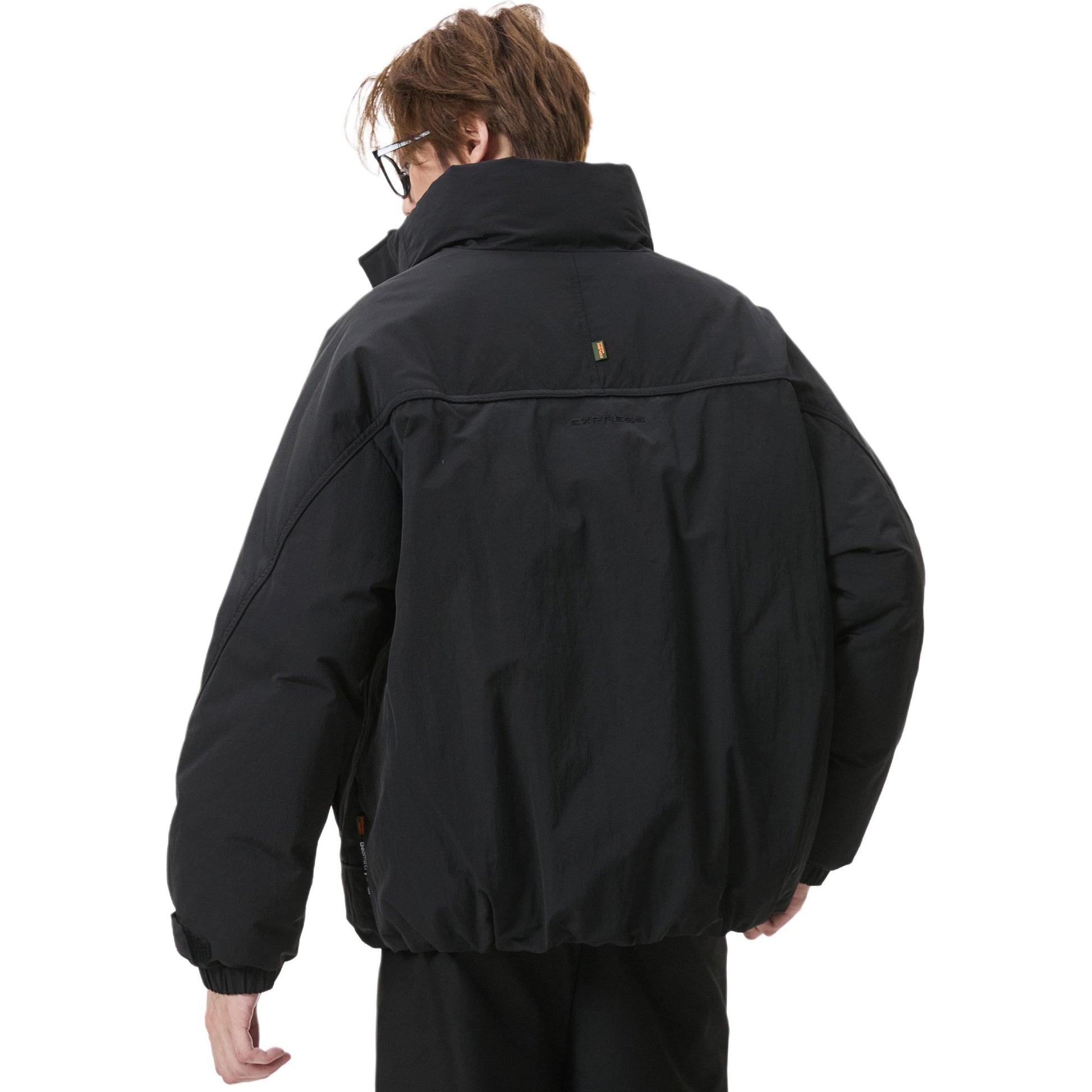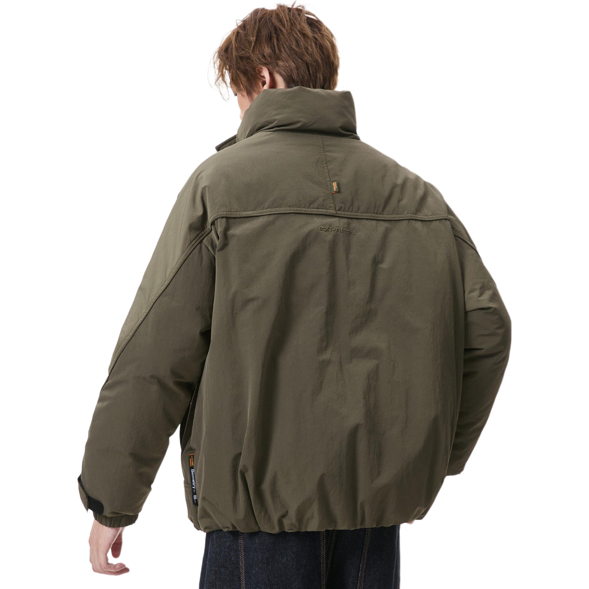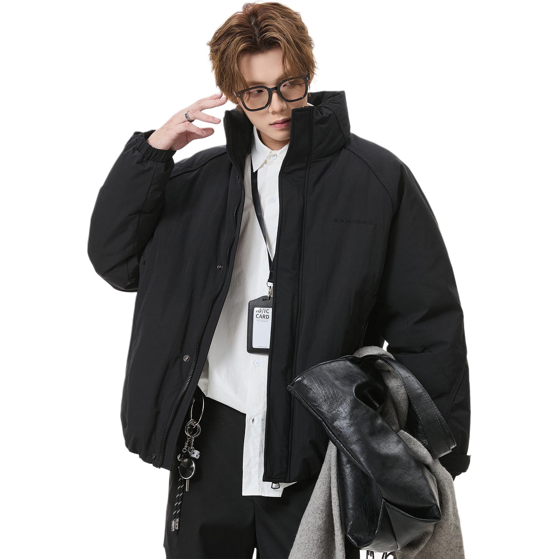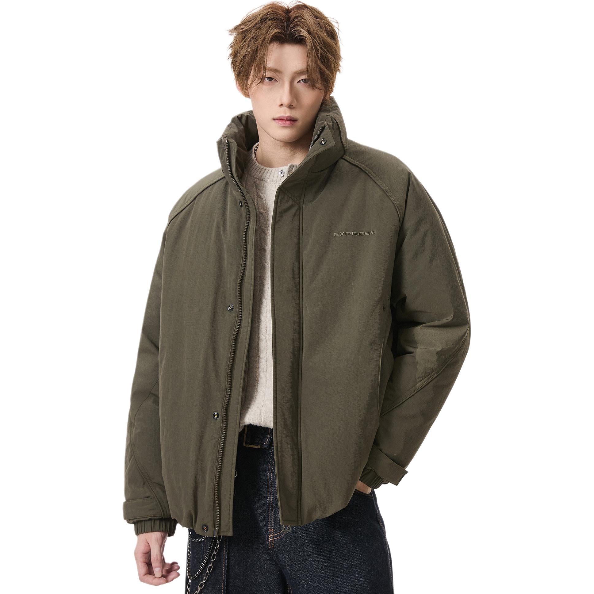 Короткий пуховик в американском стиле с воротником-стойкой и тематическим принтом «горы», наполненный утиным пухом. Модель свободного кроя из смесовой ткани обеспечивает тепло и современный уличный образ.