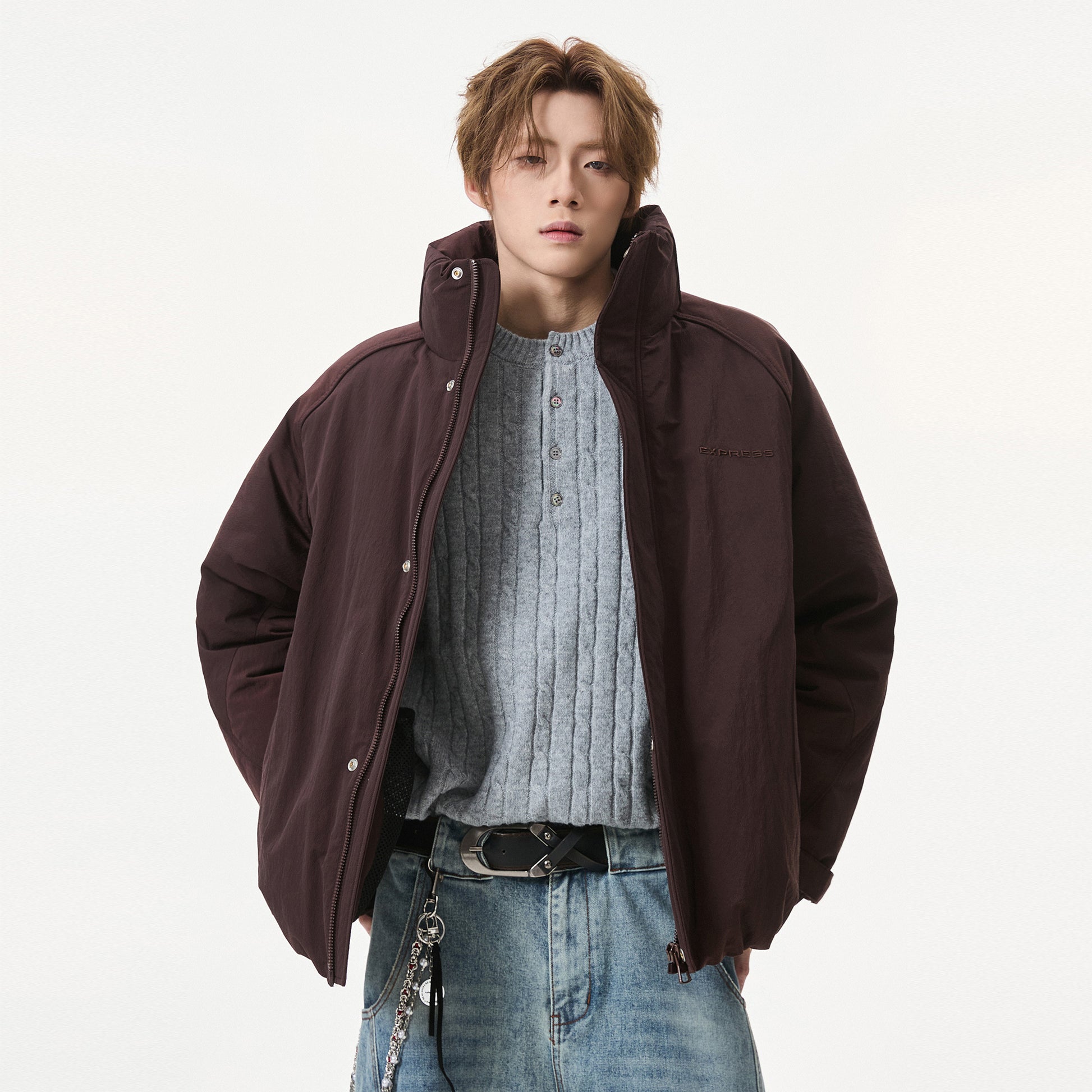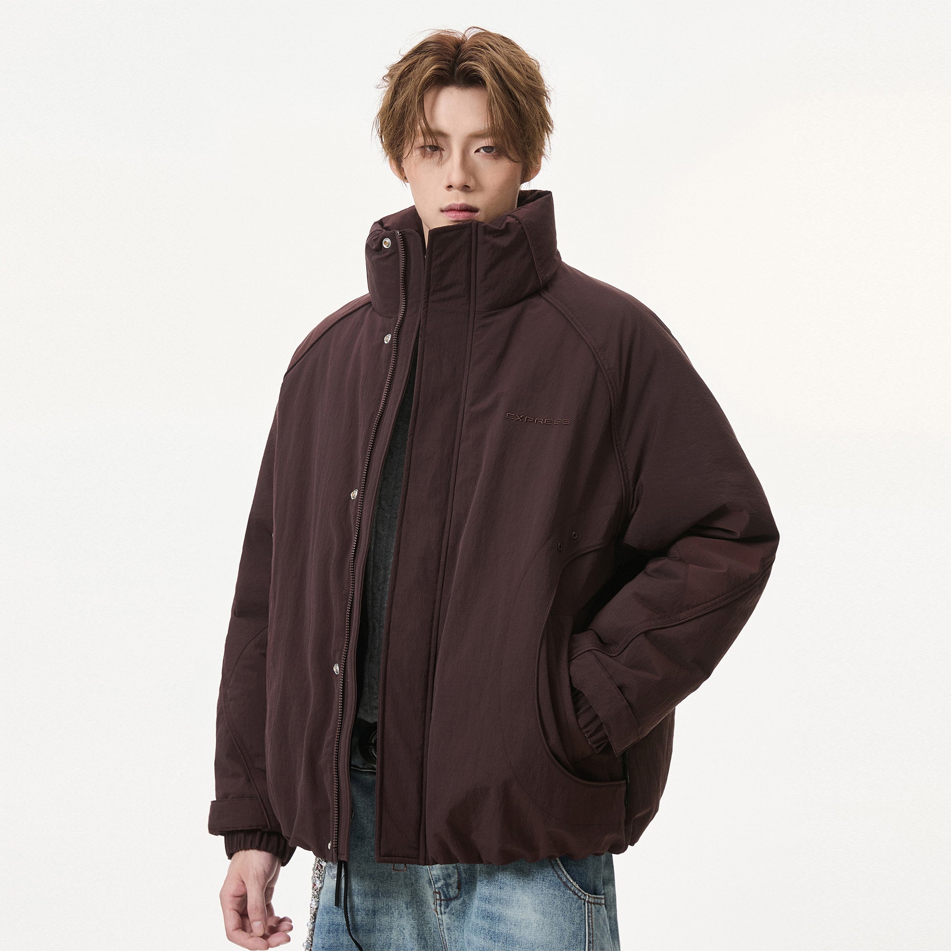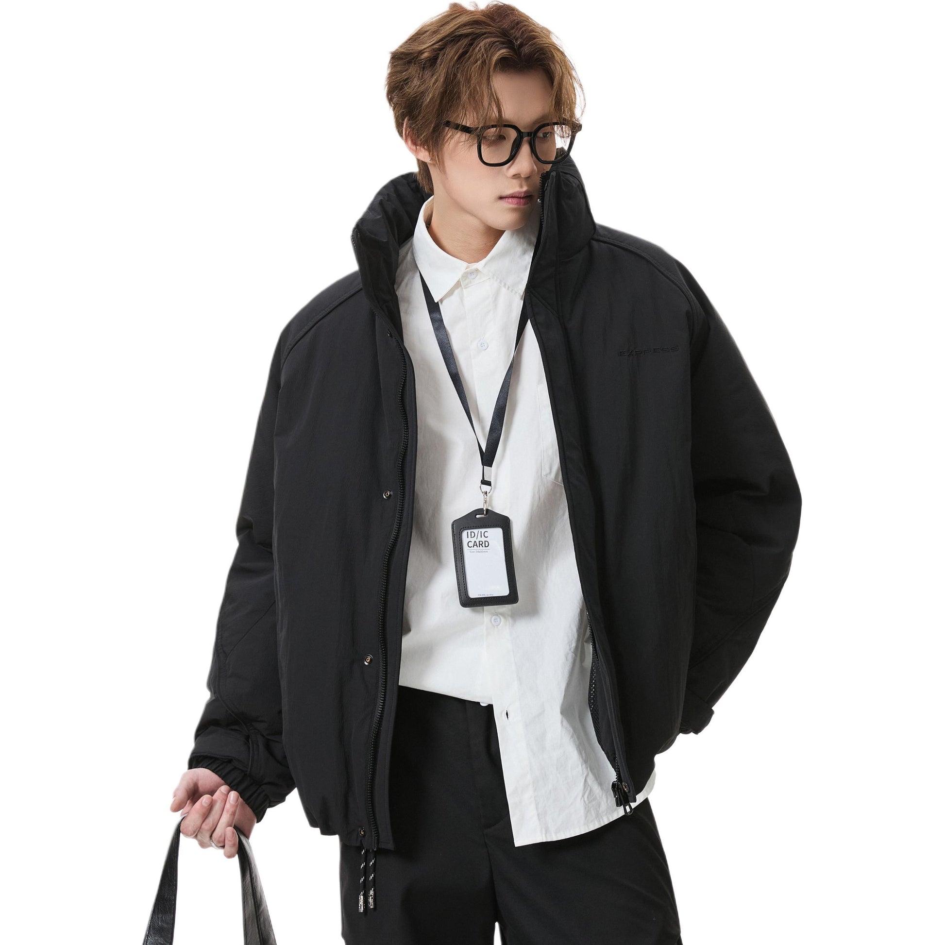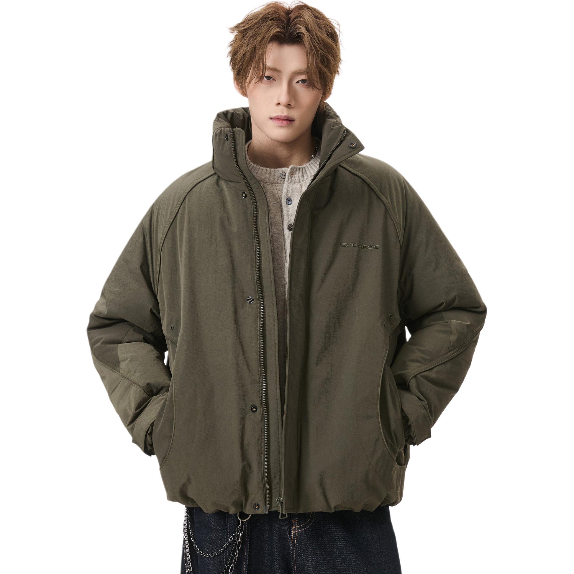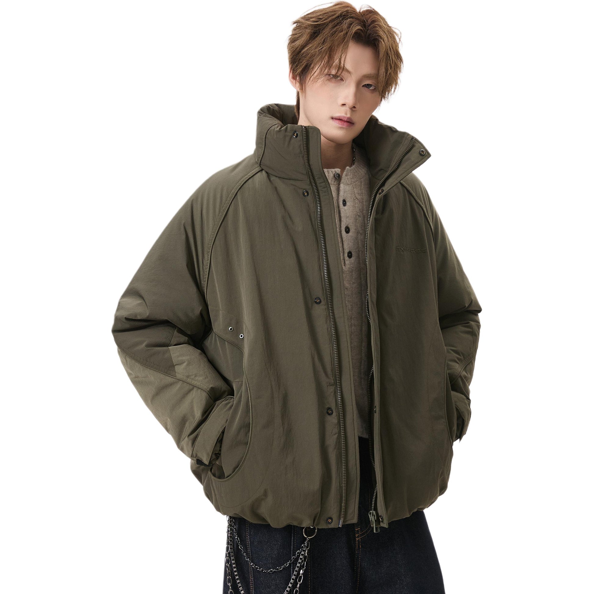 Короткий пуховик в американском стиле с воротником-стойкой и тематическим принтом «горы», наполненный утиным пухом. Модель свободного кроя из смесовой ткани обеспечивает тепло и современный уличный образ.