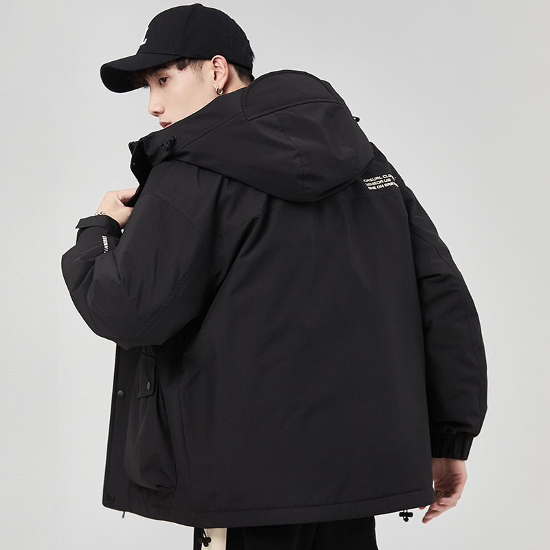 Пуховик в стиле рабочей одежды с капюшоном и большими карманами для активного отдыха и города, выполненный из водоотталкивающей ткани. Модель наполнена утиным пухом, обеспечивая тепло, защиту от ветра и влаги.