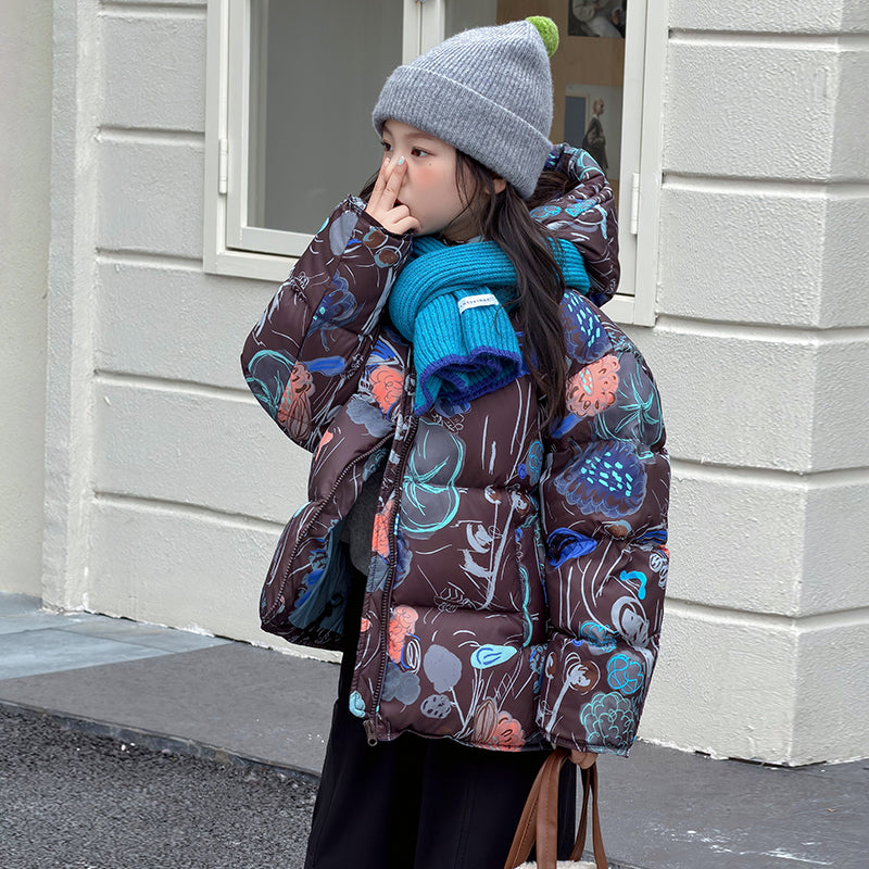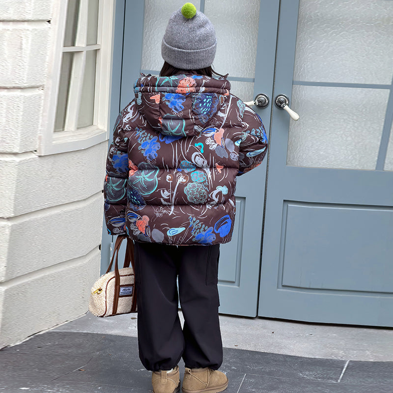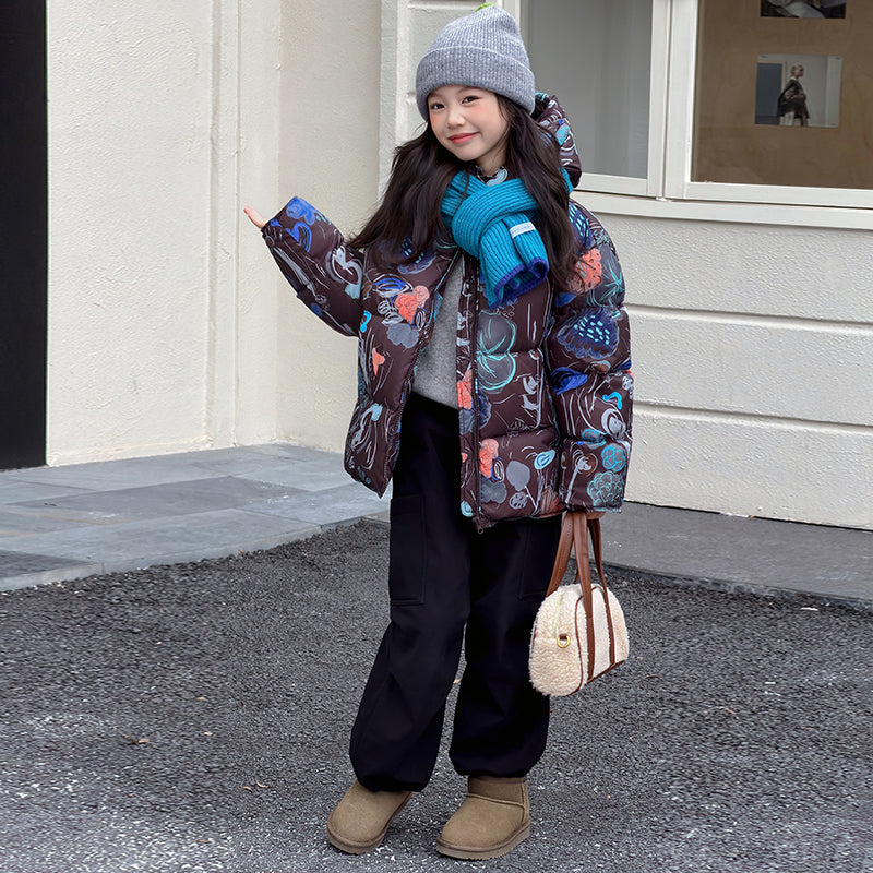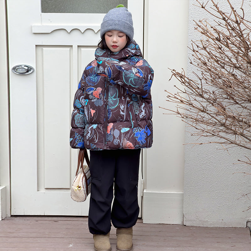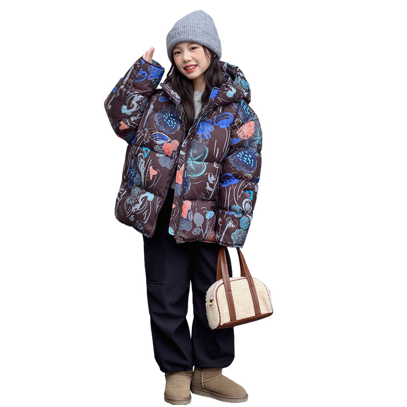 Пуховик для девочек в корейском стиле с капюшоном, выполненный из ткани с цветочным принтом. Модель свободного кроя обеспечивает тепло, комфорт и элегантный внешний вид для холодного зимнего сезона.