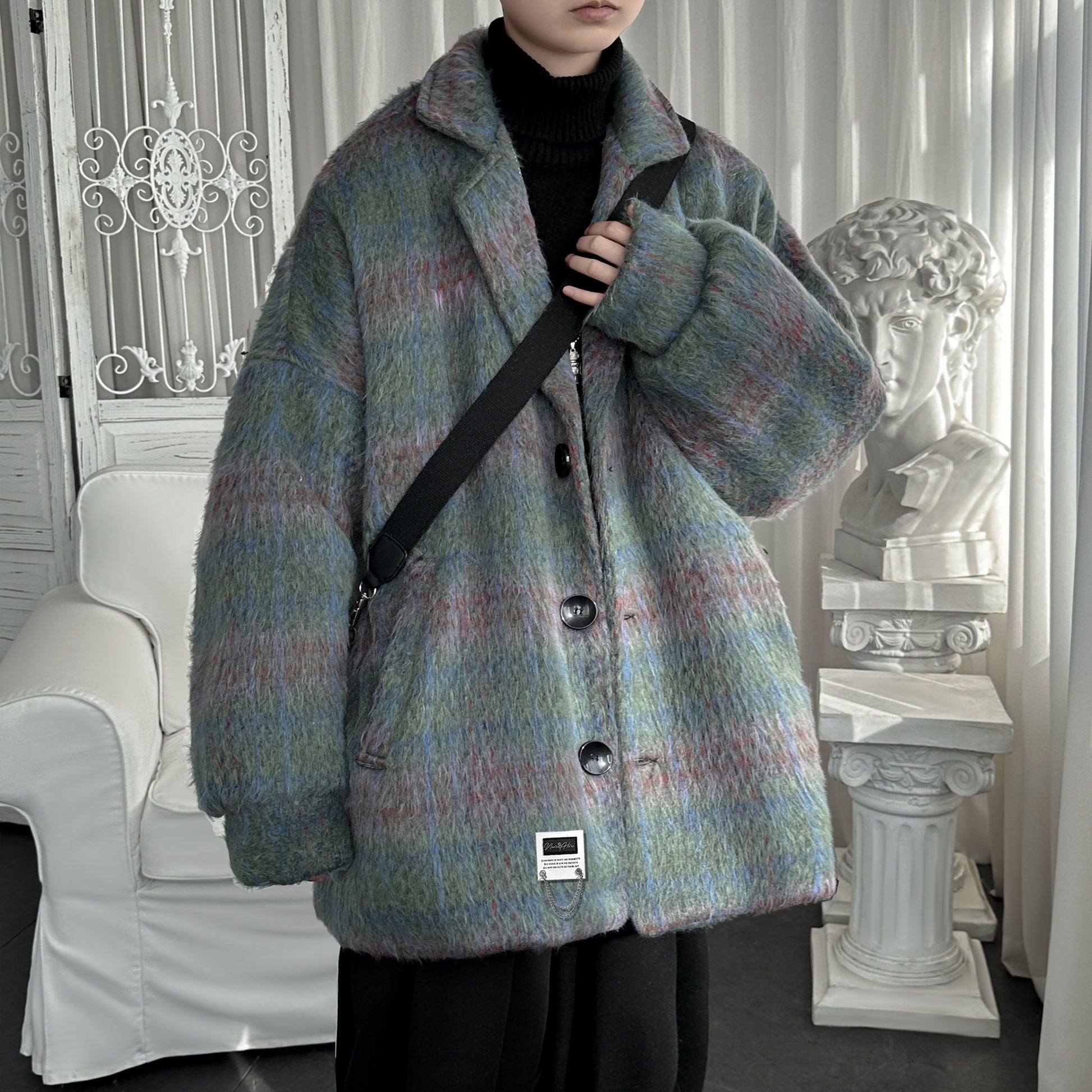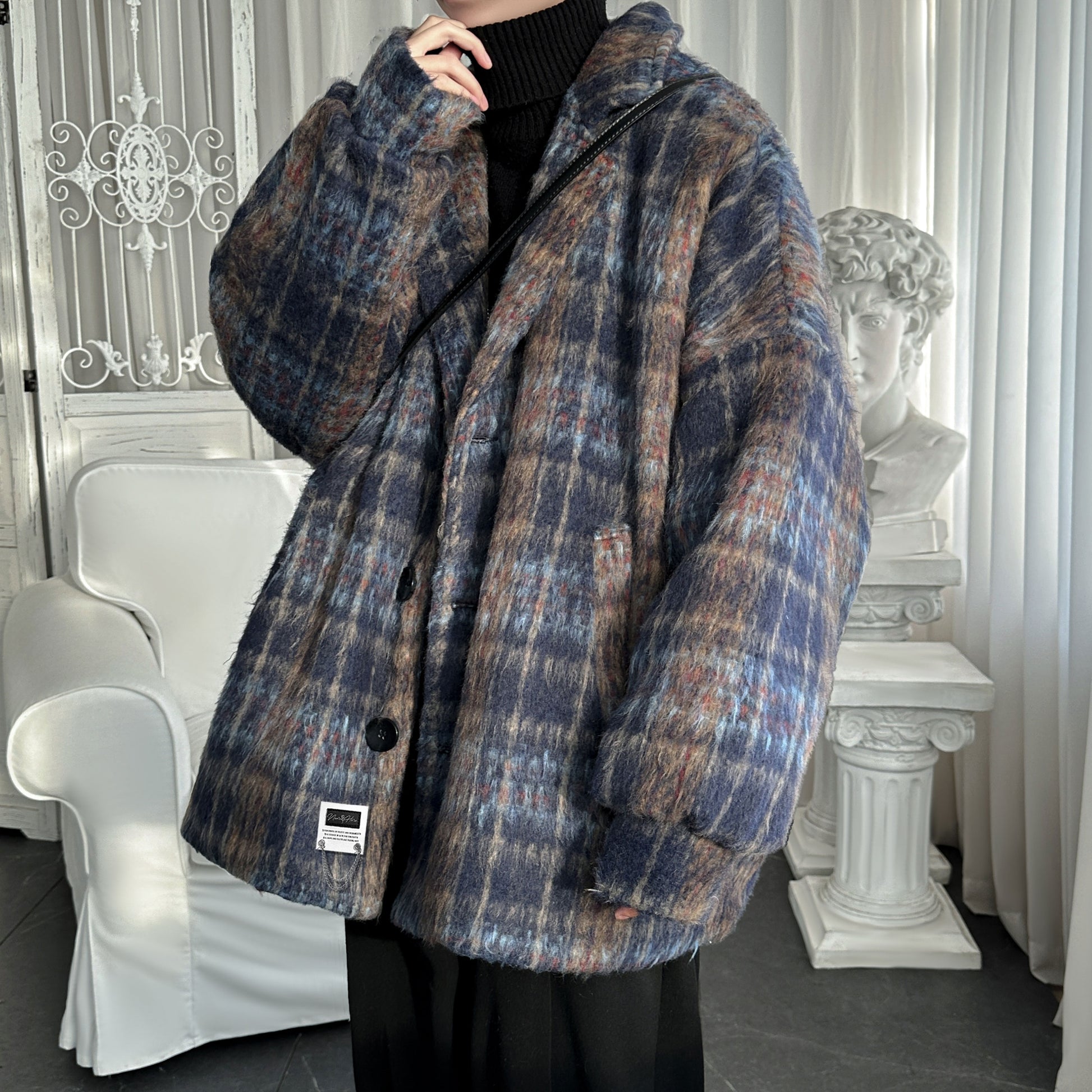Мужское пальто NEAR HERE в американском ретро-стиле с однобортной застежкой и классическим воротником пиджака. Модель с длинными рукавами и свободным силуэтом выполнена из полиэстера с шерстяной тканью в клетчатый узор, сочетает тепло, комфорт и универсальный стиль для повседневной и деловой носки.