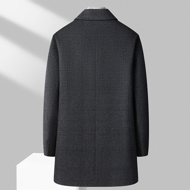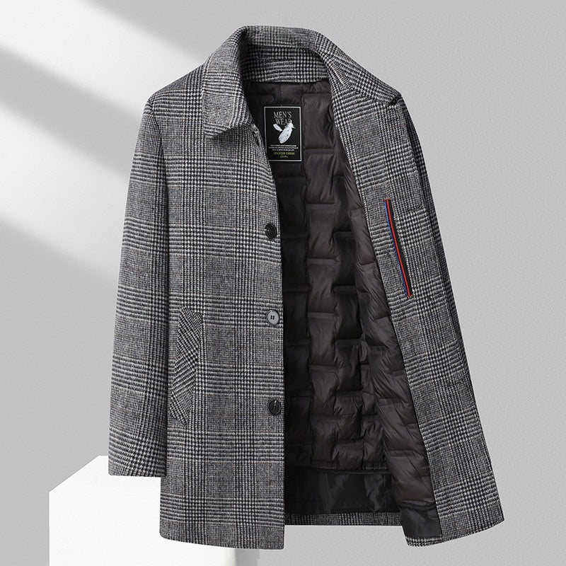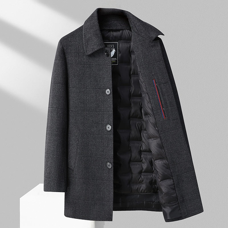 Мужское пальто Yangqi Xiansheng с однобортной застежкой и прямым силуэтом, дополненное съемным пуховым утеплителем. Модель с длинными рукавами и отложным воротником выполнена из смеси полиэстера, овечьей шерсти и других волокон, сочетает тепло, комфорт и стиль для осени и зимы.