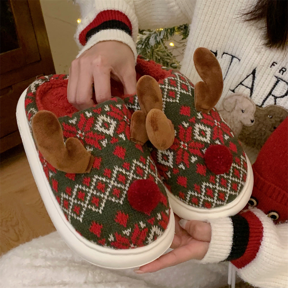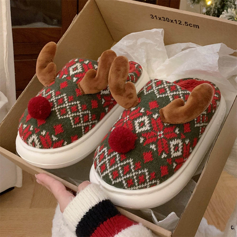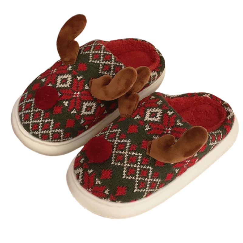 Yoqimli bugʻu tasvirlangan Rojdestvo dizaynidagi shinam qishki shippaklar. Sovuq mavsumda uyda foydalanish uchun juda mos, ular iliqlik va qulaylik bagʻishlaydi.