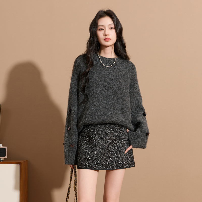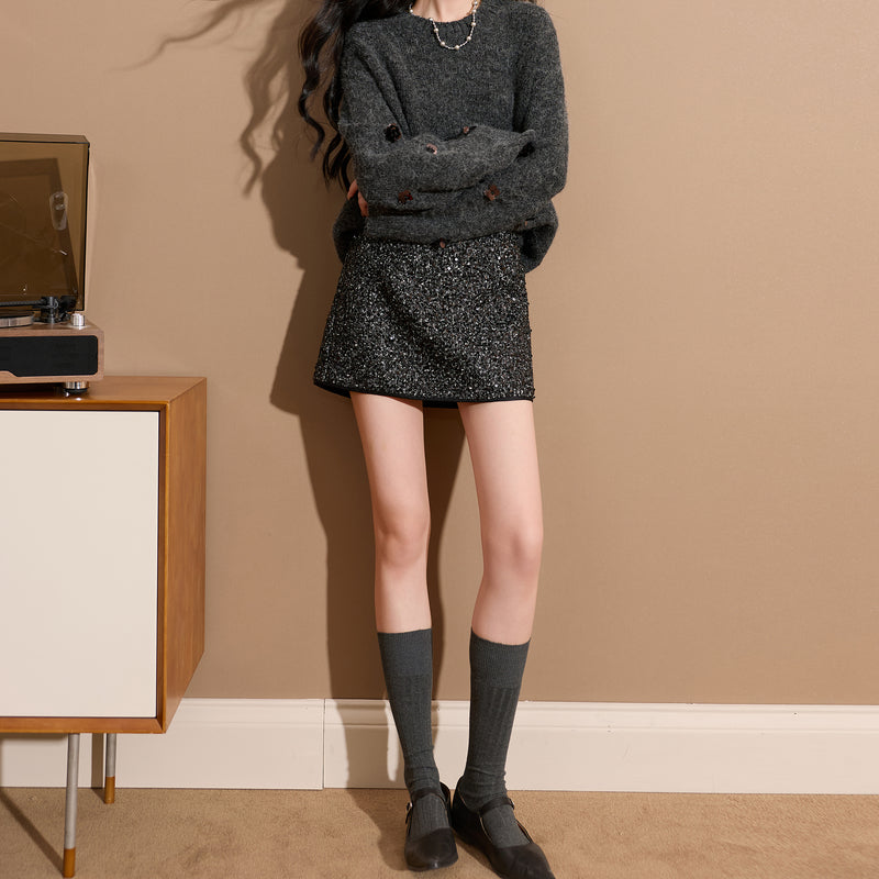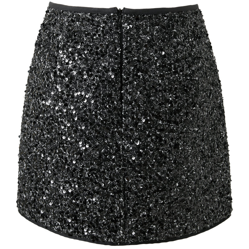 Paletlar bilan bezatilgan kalta, tekis, baland belli yubka. Slim fit va retro uslubi nafis, ammo tasodifiy ko'rinish yaratadi.