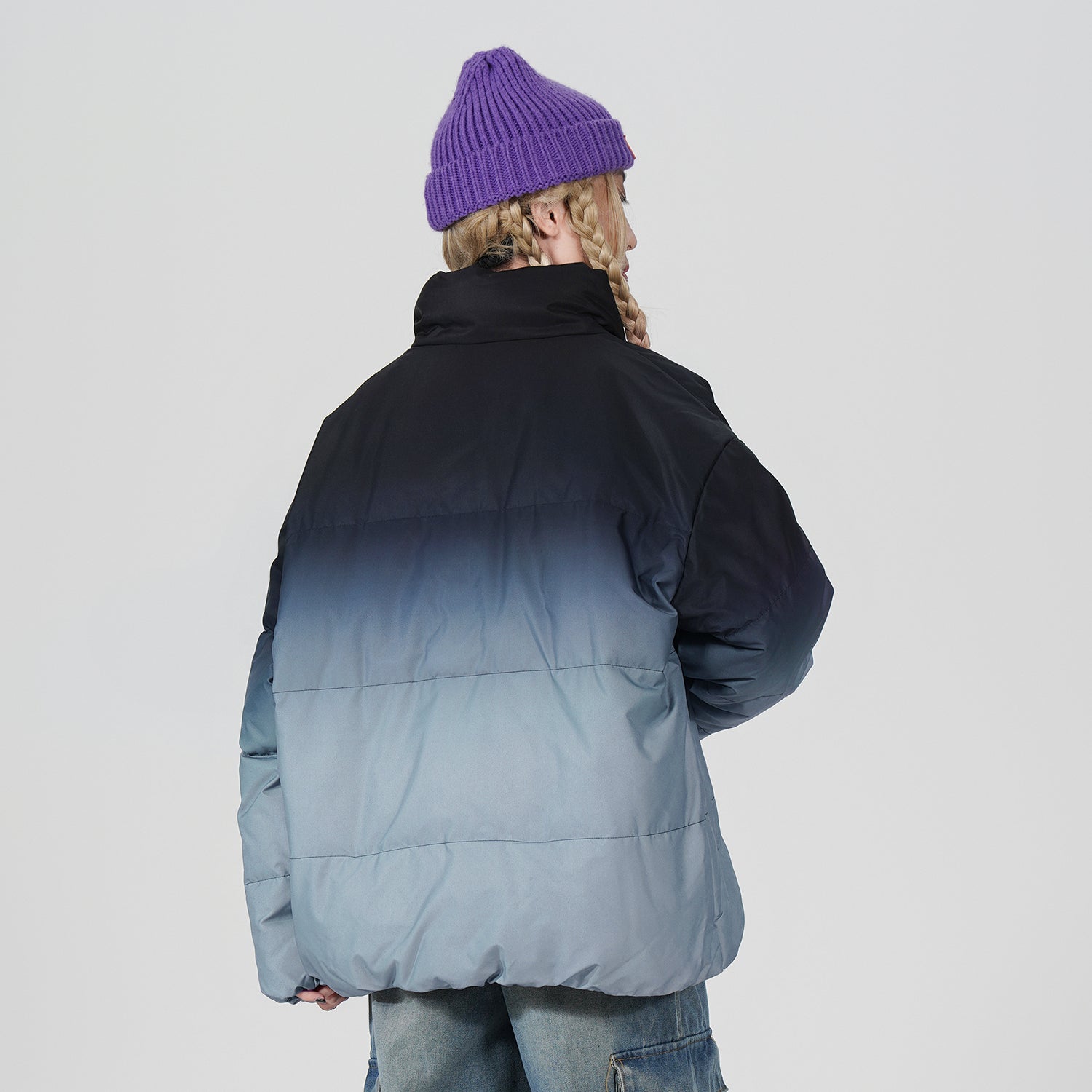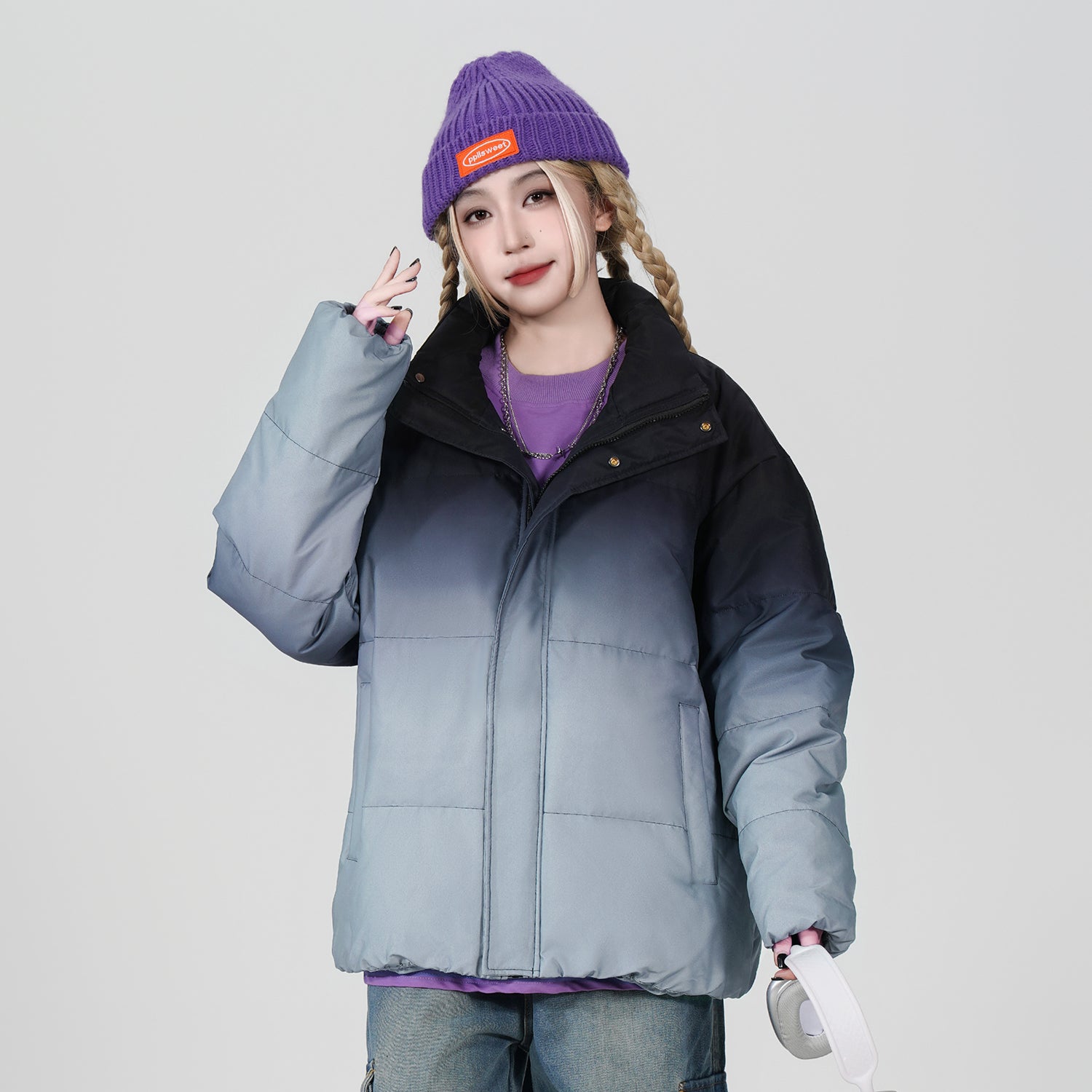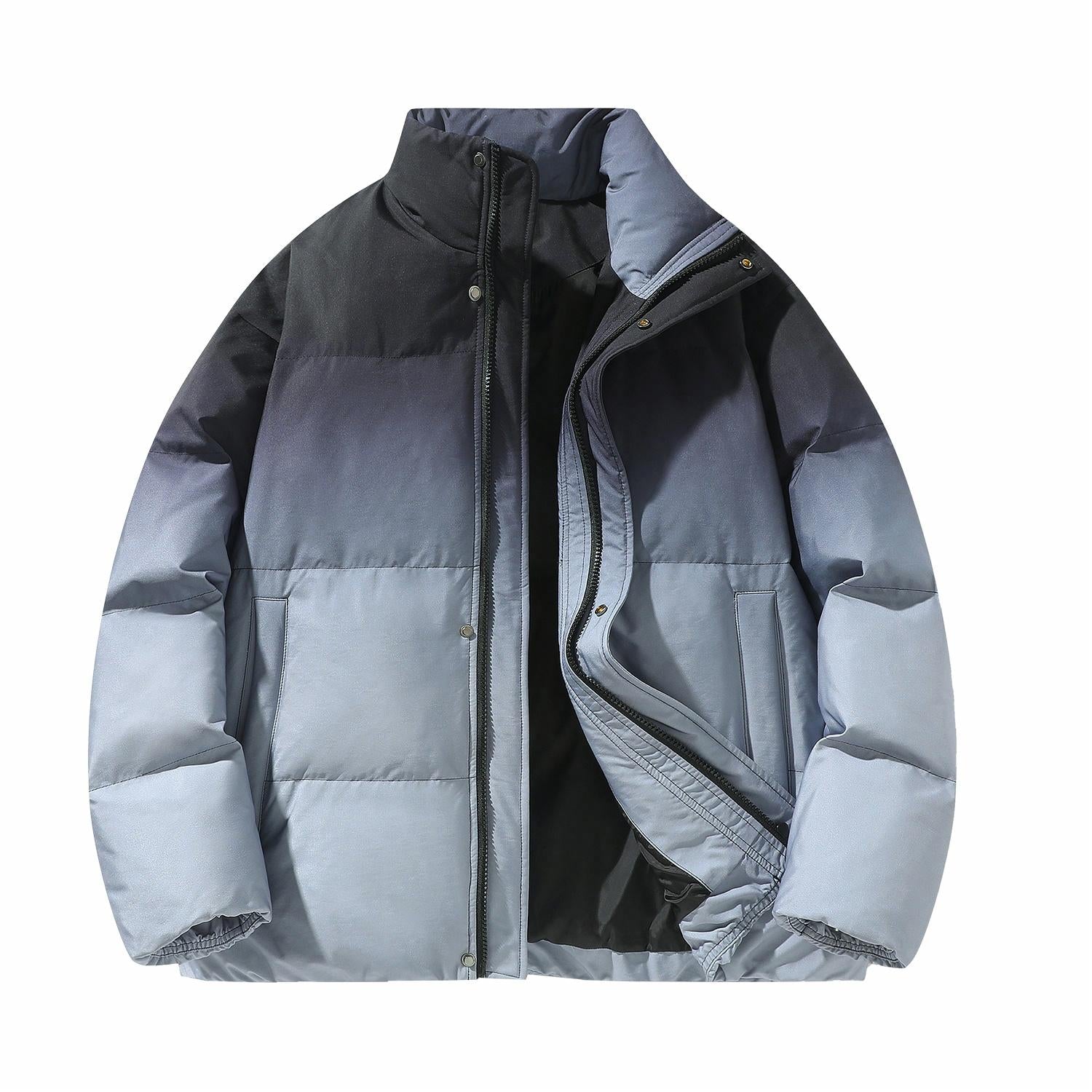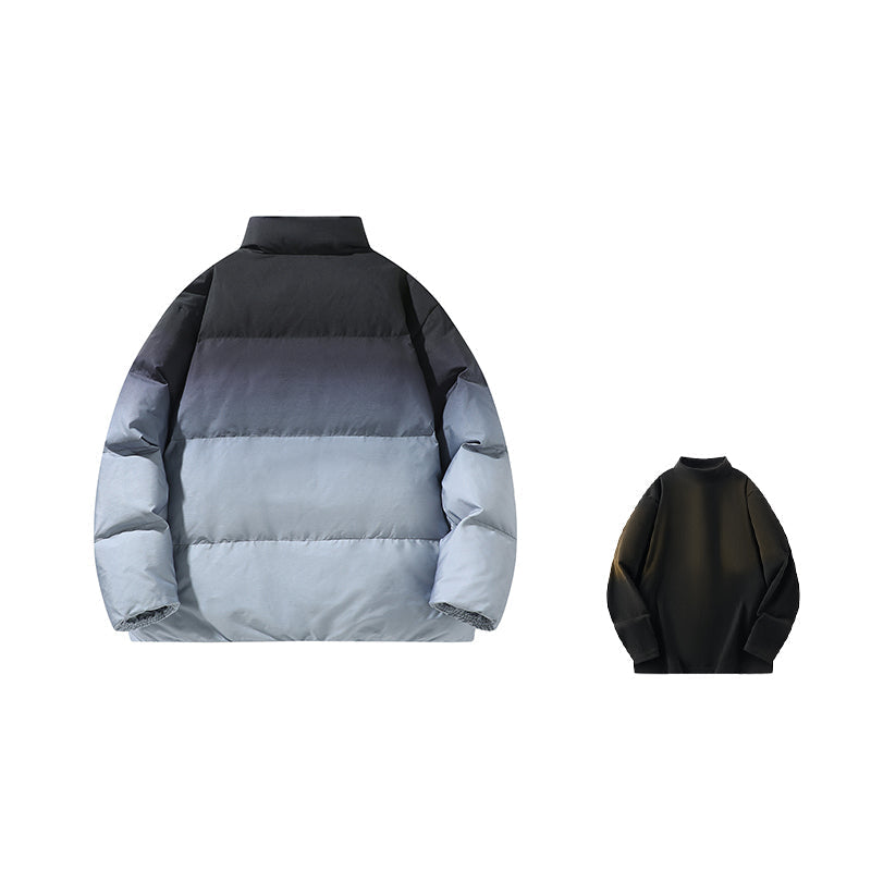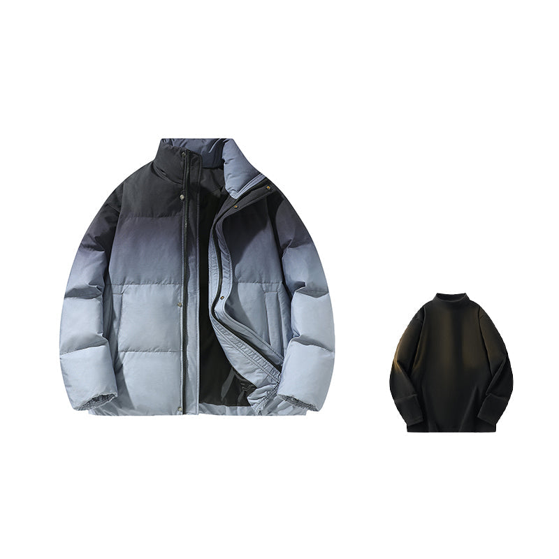 Amerika va Koreya uslublarida, gradient dizaynli, tik turgan yoqali, tushirilgan yelkali va yuqori texnologiyali membranali kalta pufli kurtka. Ushbu keng model o'rdak pufli mato bilan to'ldirilgan bo'lib, zamonaviy, zamonaviy ko'rinish yaratadi va shahar kiyimlari uchun sovuqdan samarali himoya qiladi.