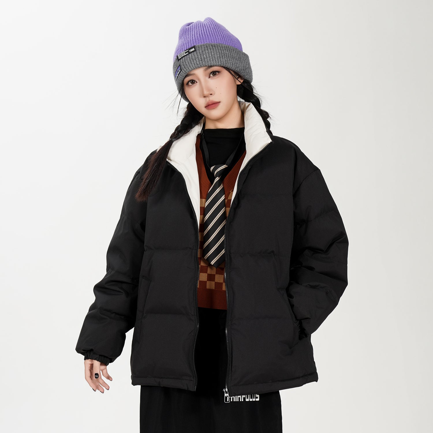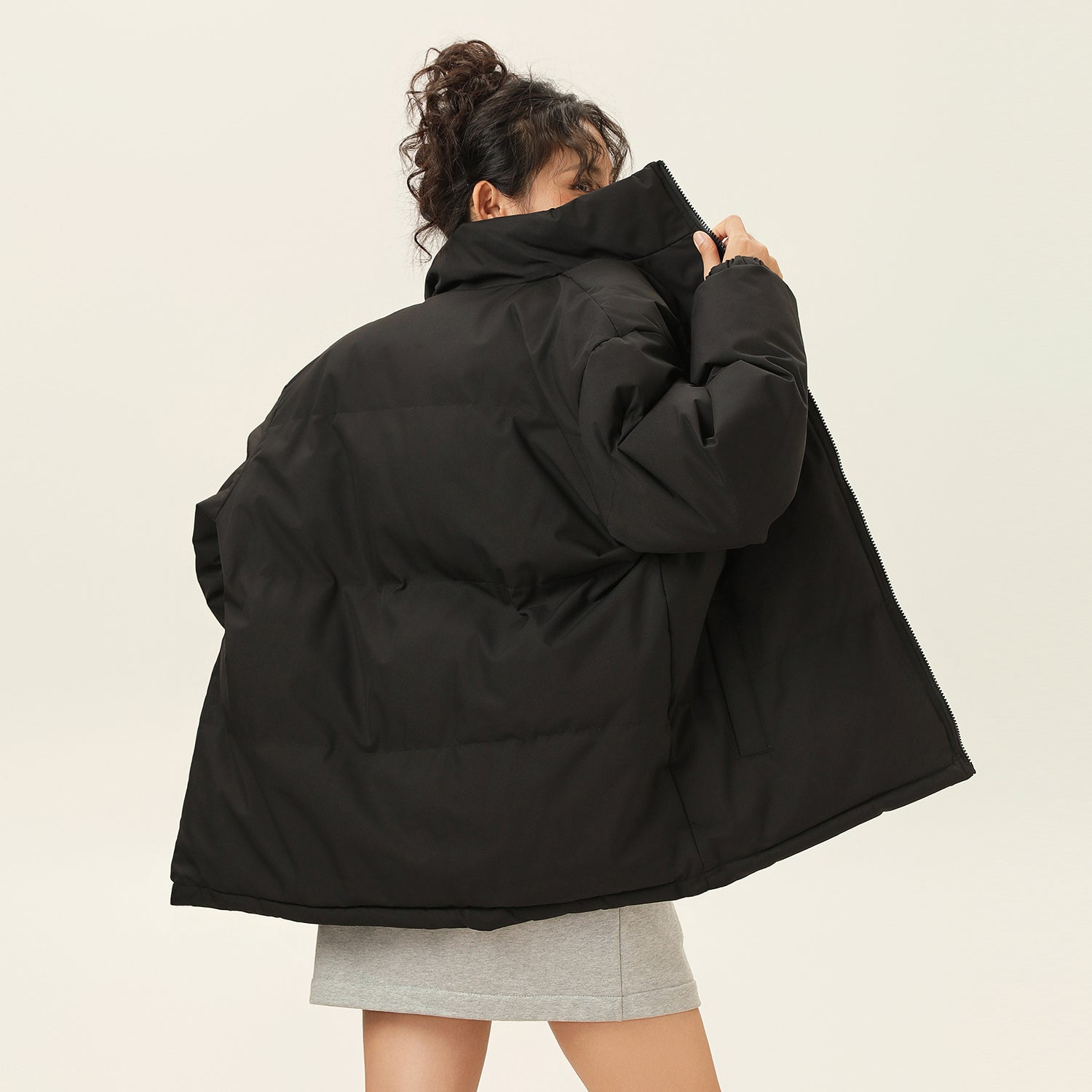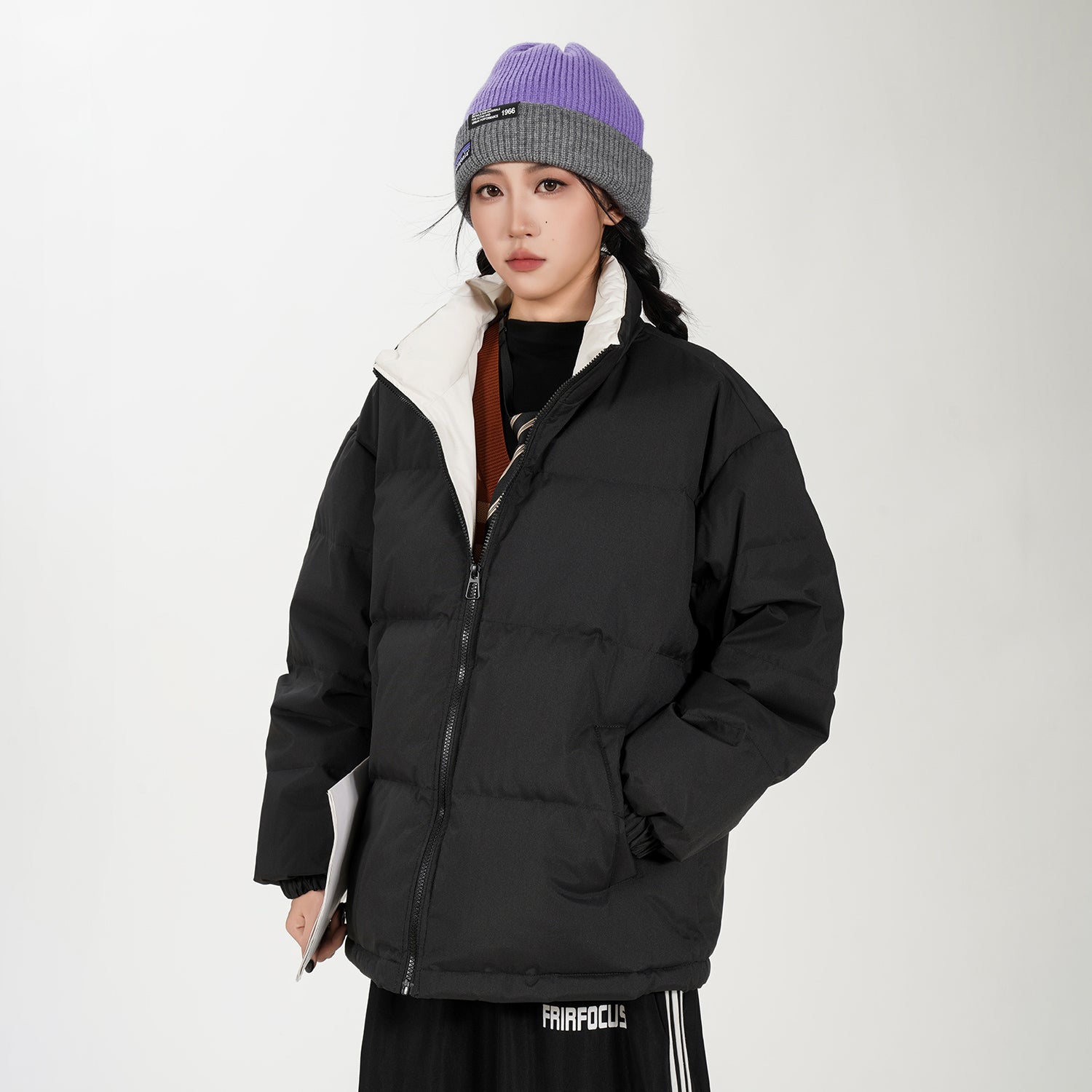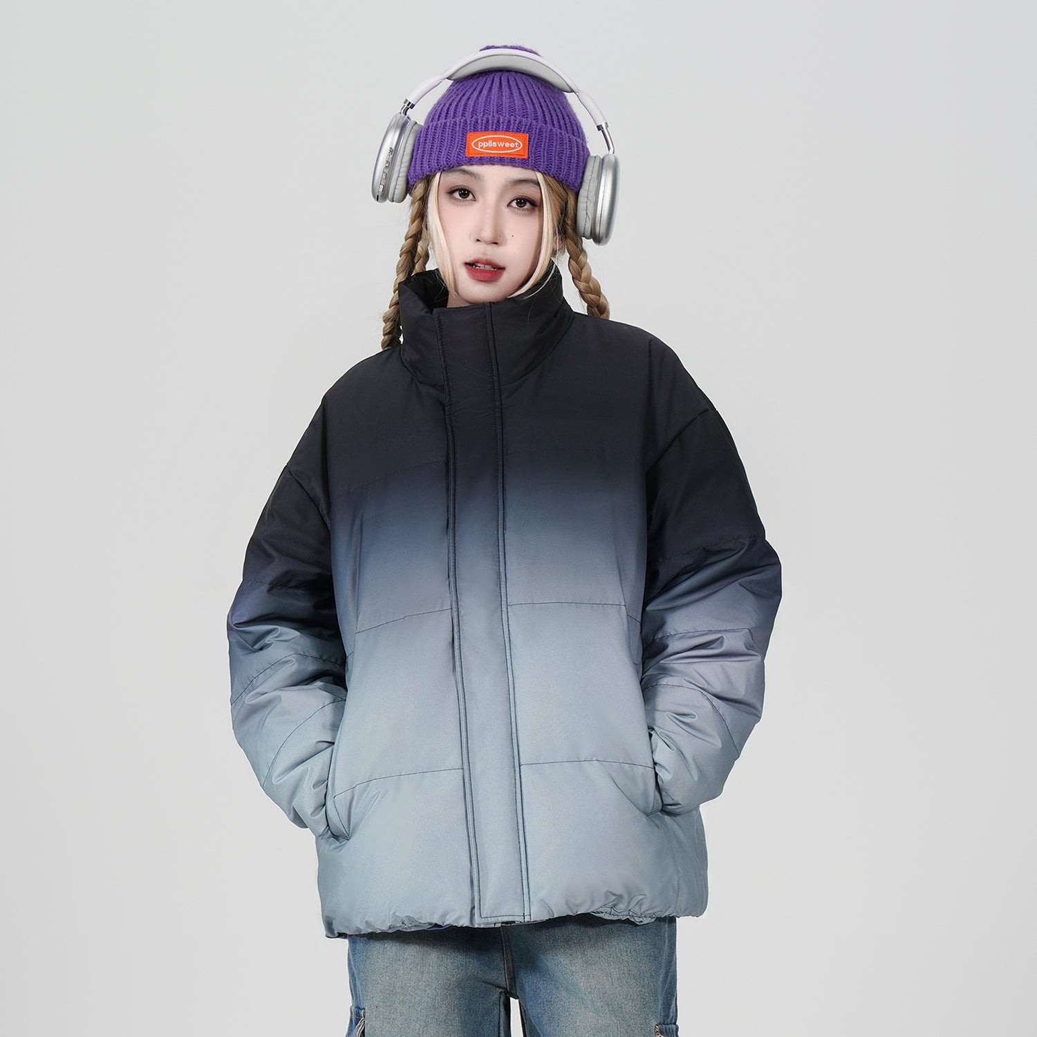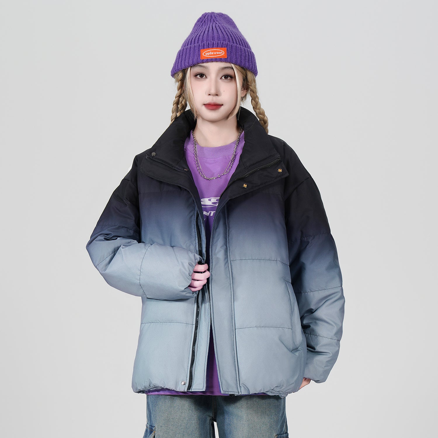 Amerika va Koreya uslublarida, gradient dizaynli, tik turgan yoqali, tushirilgan yelkali va yuqori texnologiyali membranali kalta pufli kurtka. Ushbu keng model o'rdak pufli mato bilan to'ldirilgan bo'lib, zamonaviy, zamonaviy ko'rinish yaratadi va shahar kiyimlari uchun sovuqdan samarali himoya qiladi.