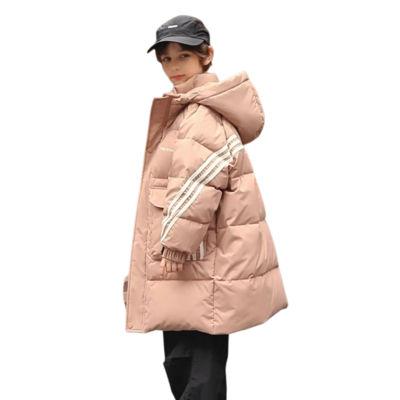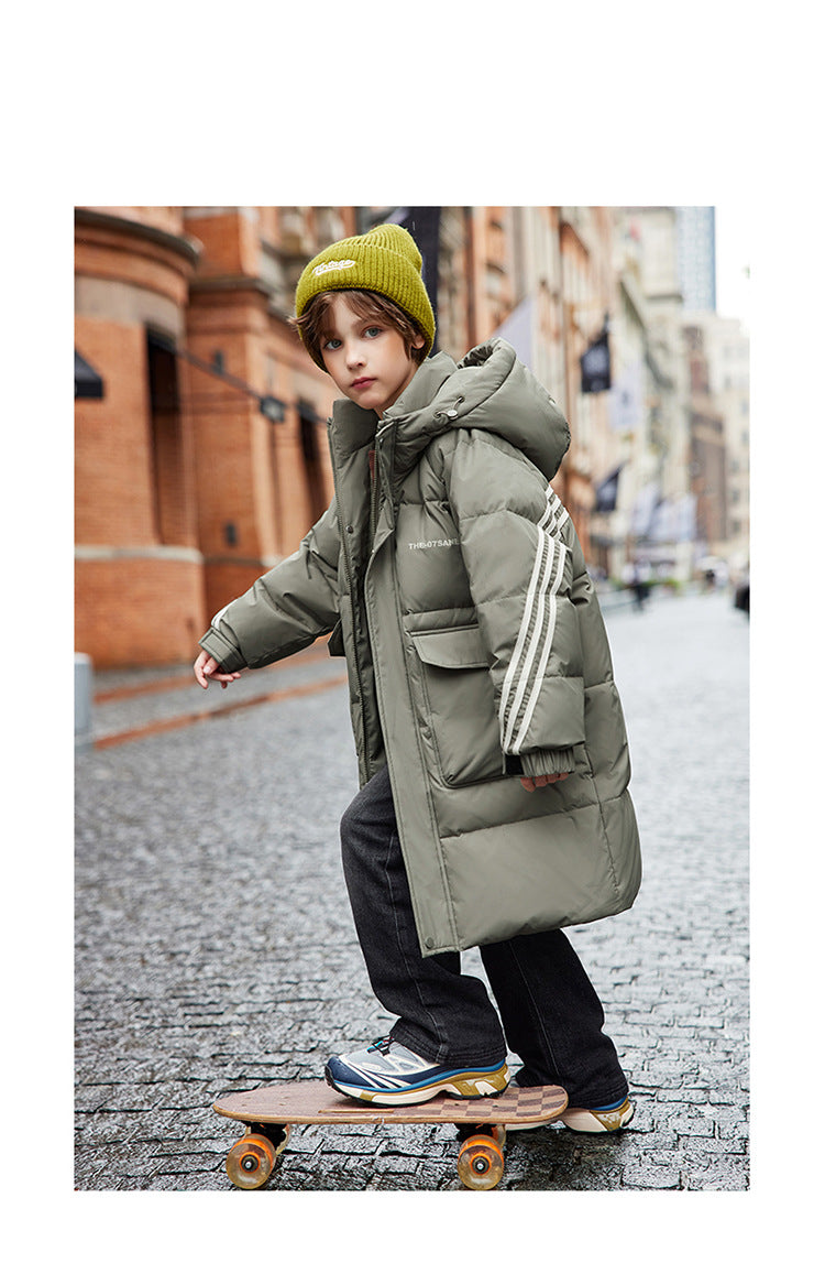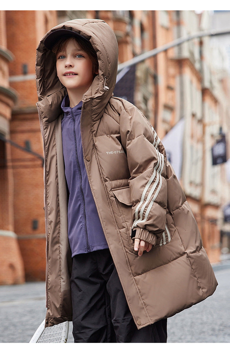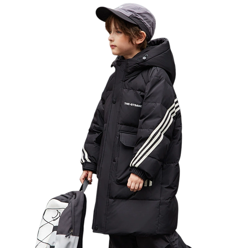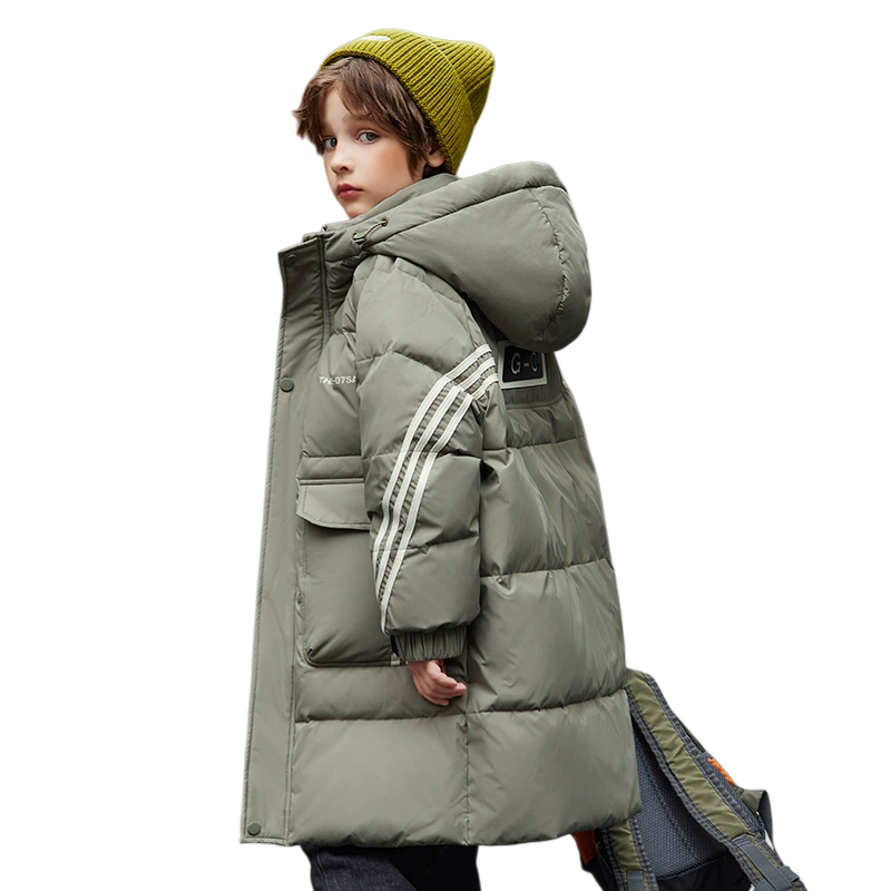 Длинный пуховик для мальчиков в корейском стиле с капюшоном и складчатыми деталями, наполненный белым утиным пухом высокой очистки. Модель обеспечивает тепло, защиту от ветра и уличный дизайн для повседневного использования.