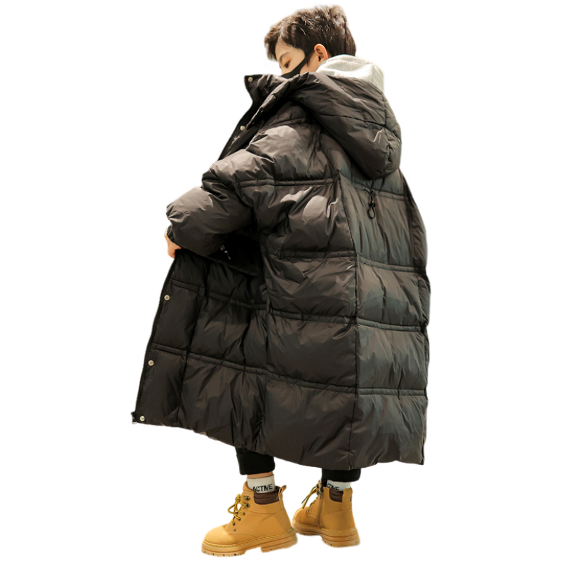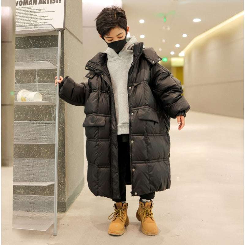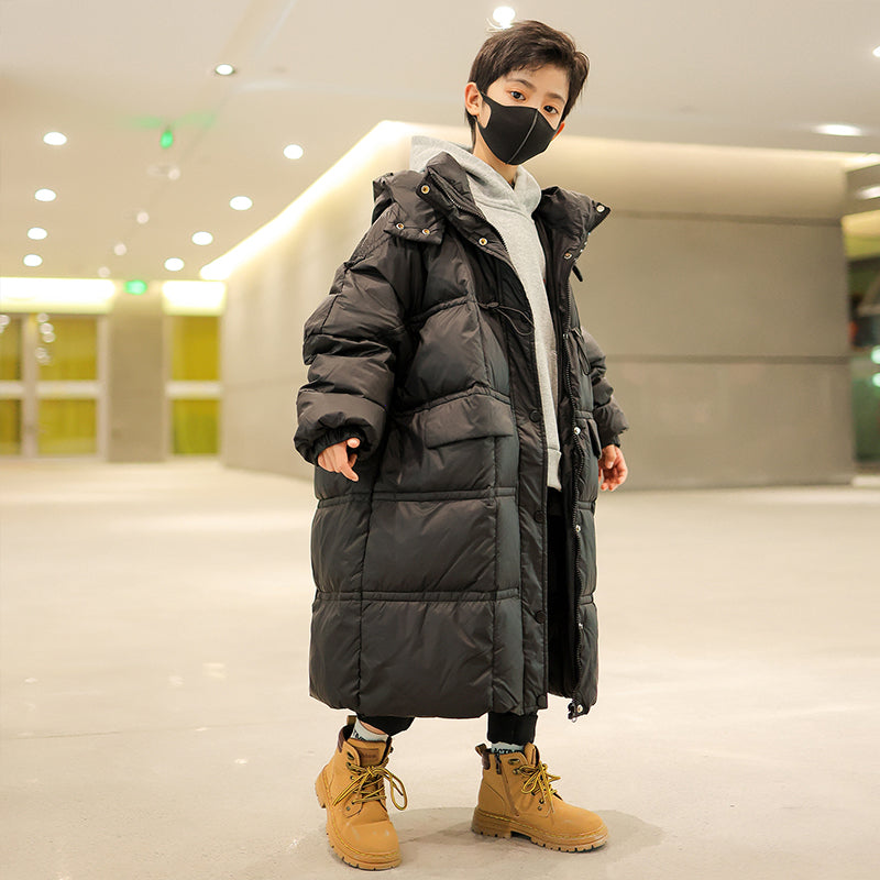 Длинный пуховик для мальчиков с капюшоном в минималистичном стиле, наполненный белым утиным пухом. Модель свободного кроя обеспечивает тепло, комфорт и универсальность для повседневной носки и активного отдыха.