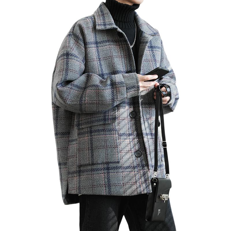 Мужское пальто AWAO в американском стиле с однобортной застежкой и отложным воротником. Модель с длинными рукавами и прямым силуэтом выполнена из полиэстера с шерстяной тканью, обеспечивает тепло, комфорт и стильный образ для осени и зимы.