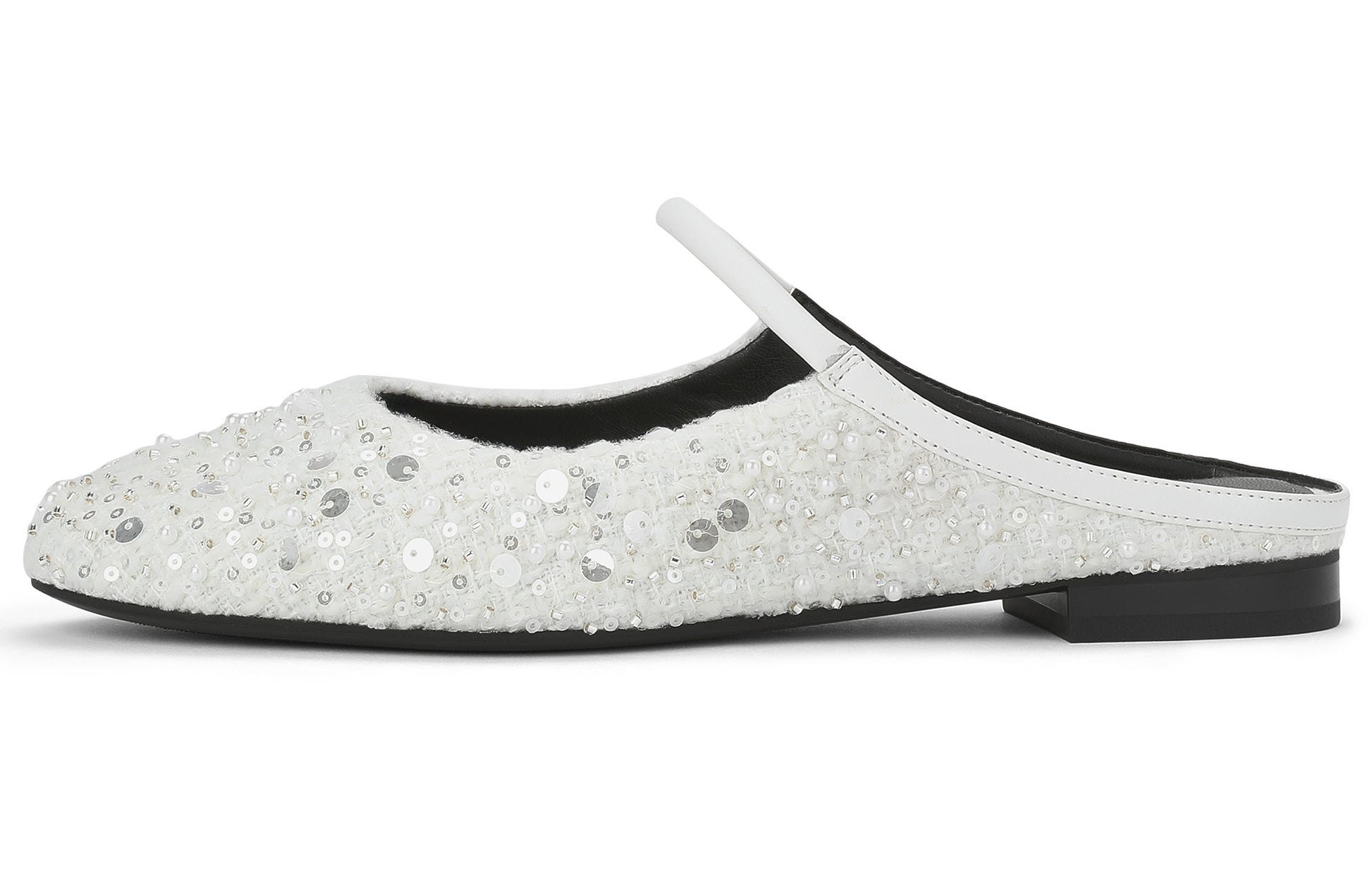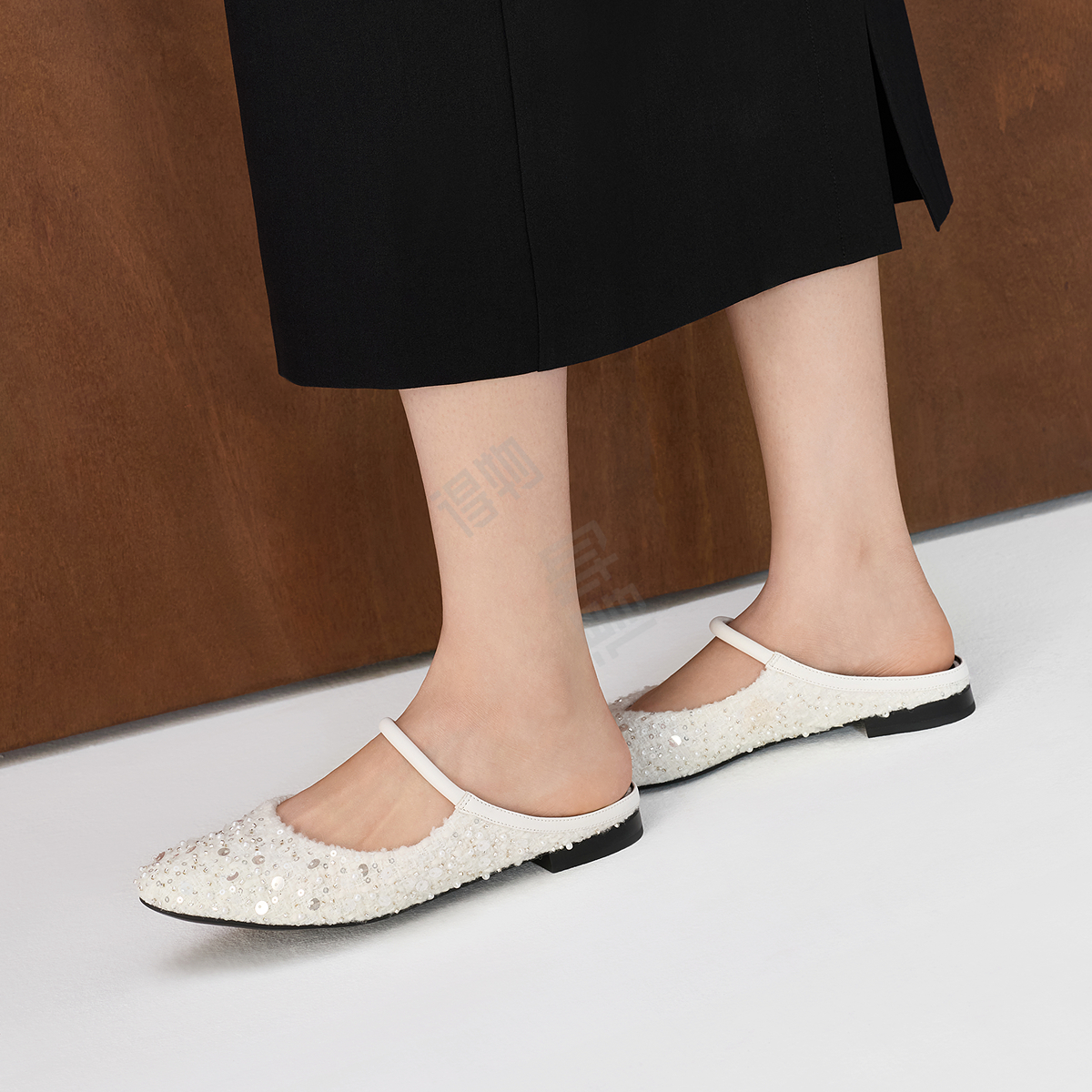 Bu yopiq tufli past, barqaror poshnali, bitta tasmali va yaltiroq bezaklari bilan ajralib turadi. Poyafzal kundalik kiyish uchun qulay kompozitsion materialdan tayyorlangan.