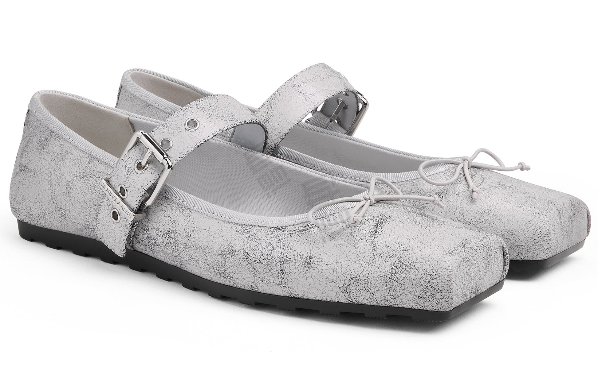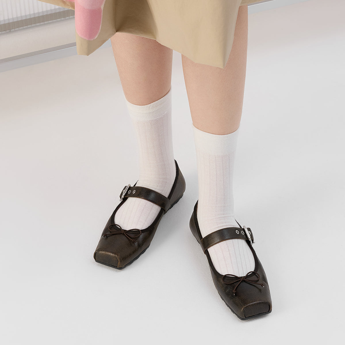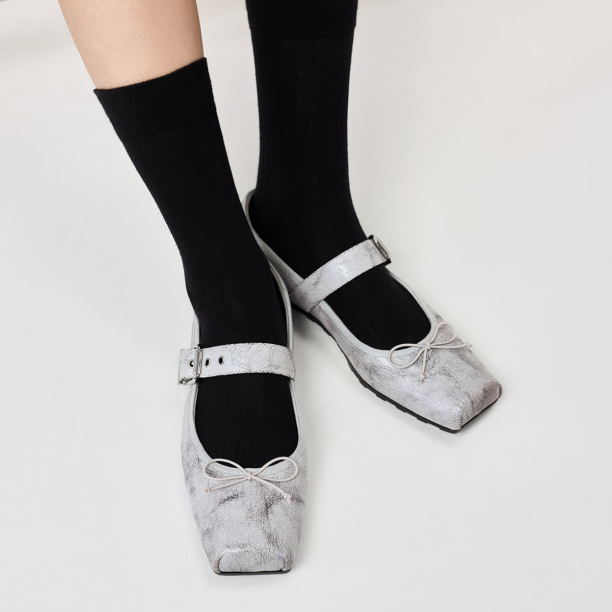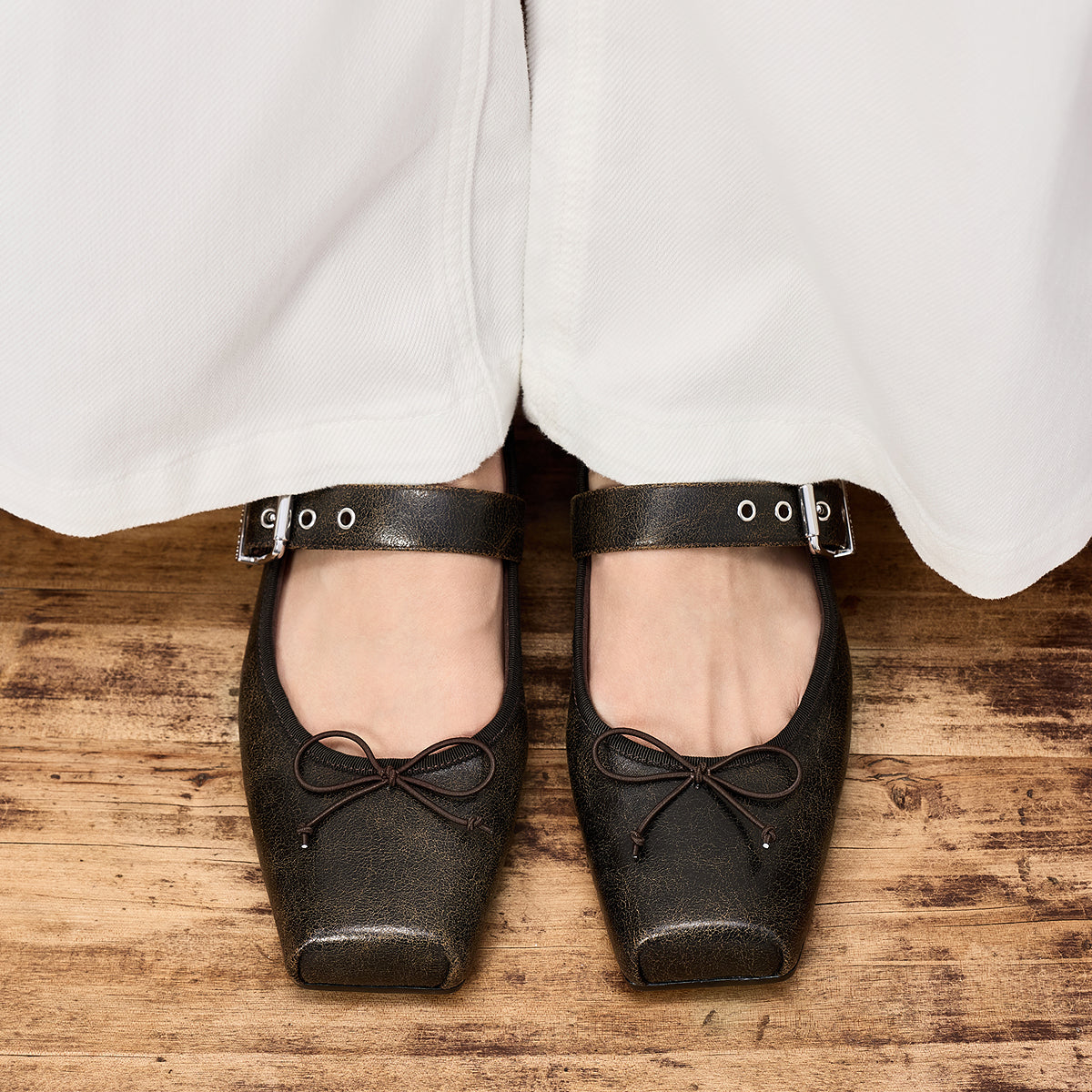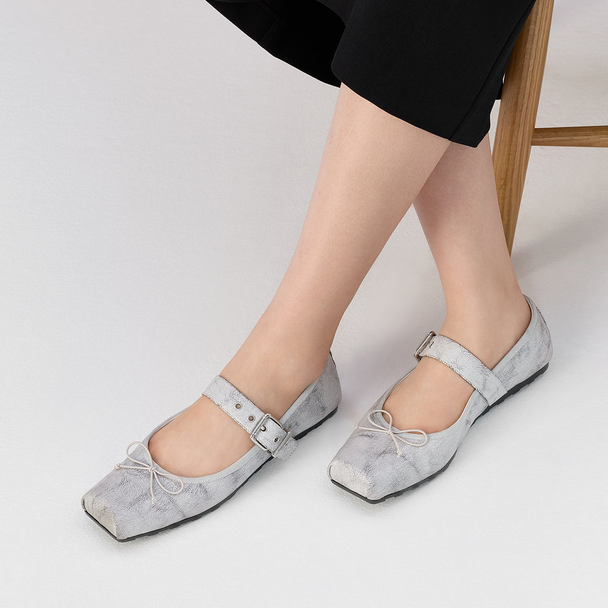 Meri Jeyn matosidan tikilgan bu balet kvartiralari to'rtburchak barmoqli va tokali kamarga ega bo'lib, oddiy, tekis dizaynga ega. Kundalik va ofis kiyimlari uchun juda mos keladi.