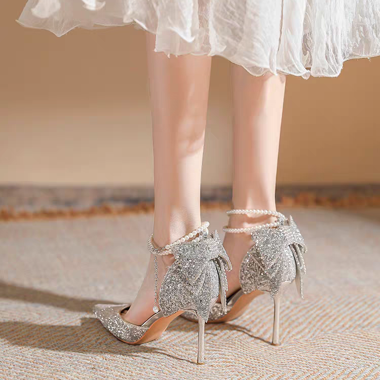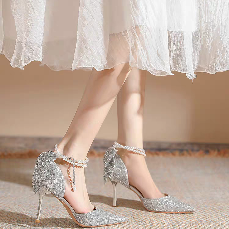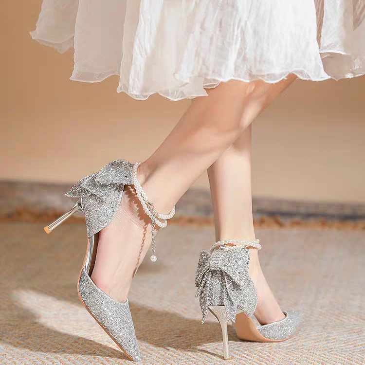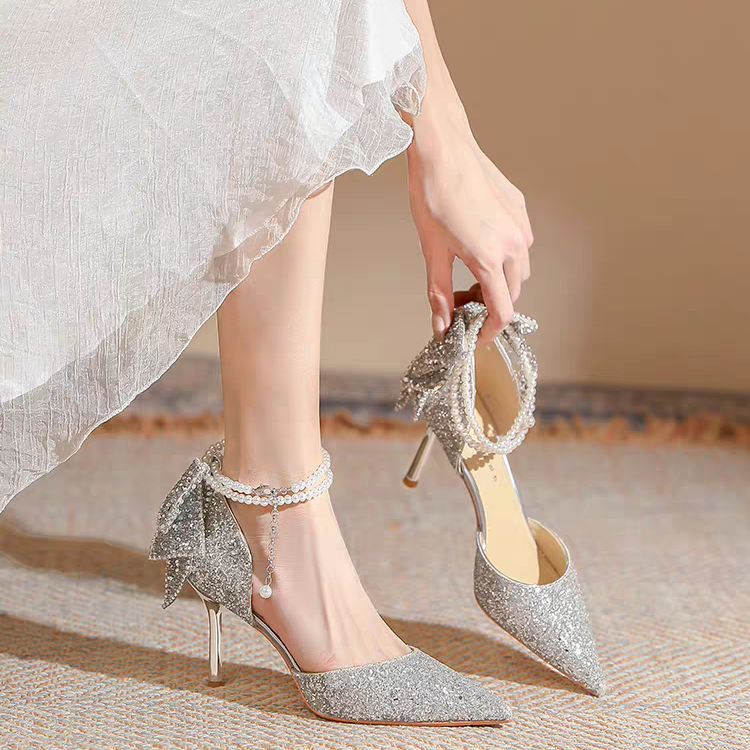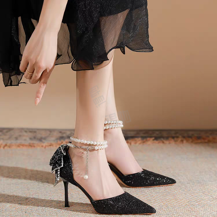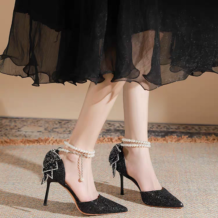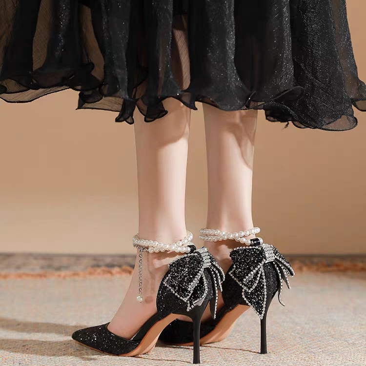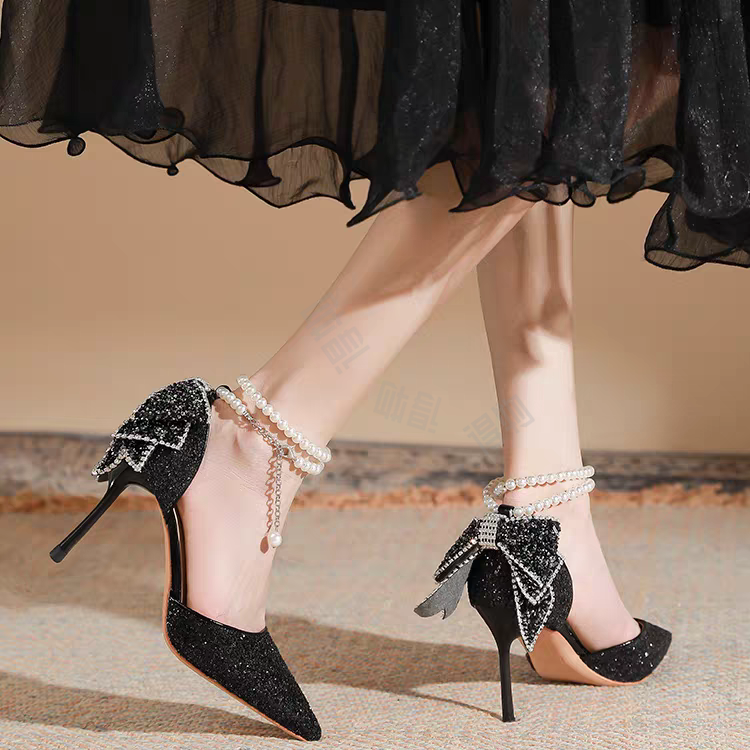Cherry&kalika микрофибра кожа простая мода заостренной головой темперамент элегантный стразами цепь лук удобный универсальный тонкий каблук высокие каблуки 9cm женские