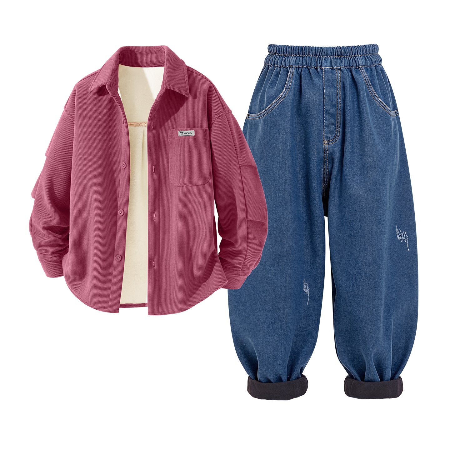 Qizlar uchun mo'ljallangan, korduroy ko'ylak va elastik belga ega izolyatsiyalangan shimlardan iborat issiq bolalar to'plami. Keng va yumshoq material salqin ob-havoda qulaylik va iliqlikni ta'minlaydi.