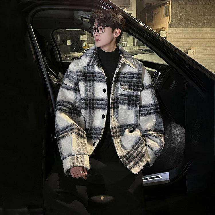 Мужское пальто EDRPIUS в корейском стиле с отложным воротником и однобортной застежкой. Модель с длинными рукавами и прямым силуэтом выполнена из полиэстера и шерстяной ткани с клетчатым узором, сочетает тепло, комфорт и стиль для весны, осени и зимы.