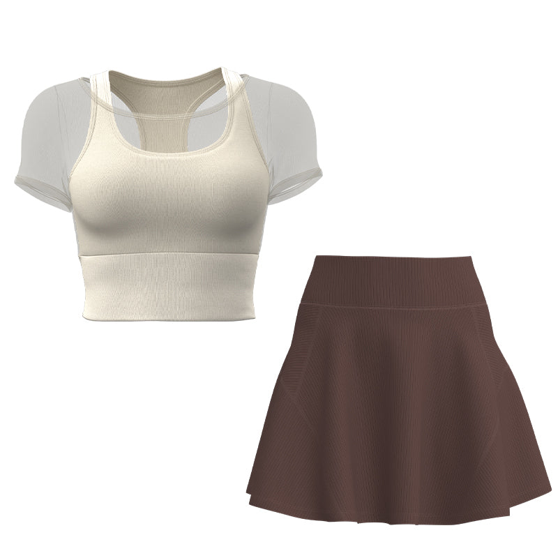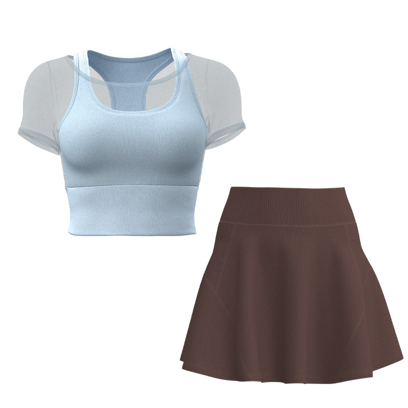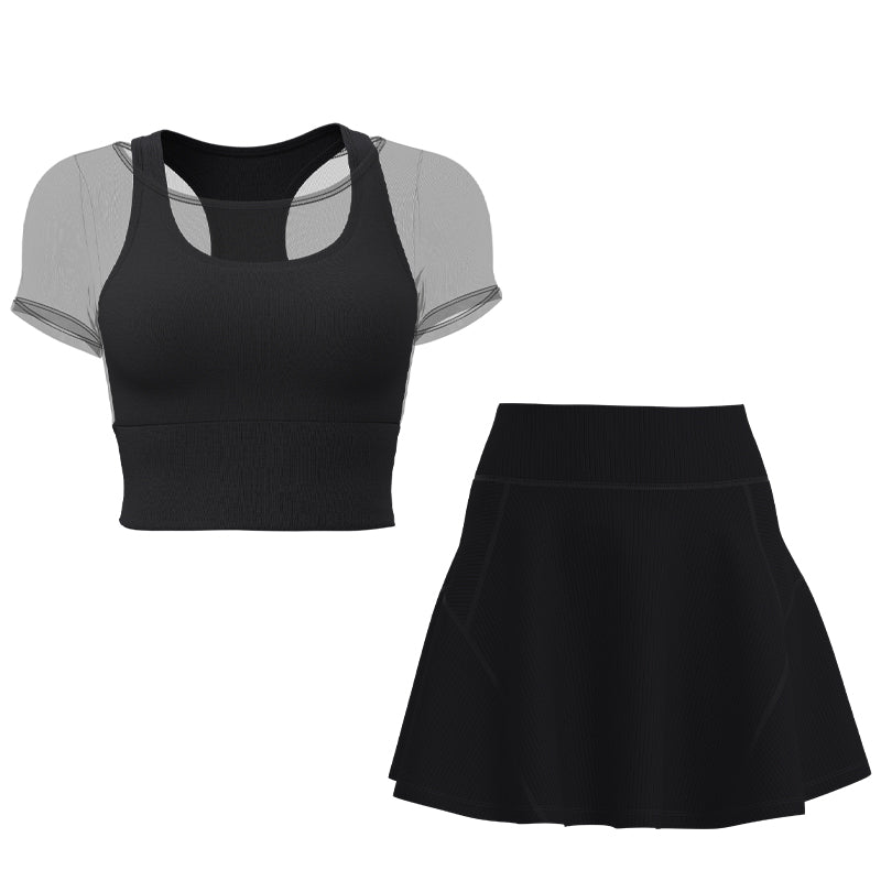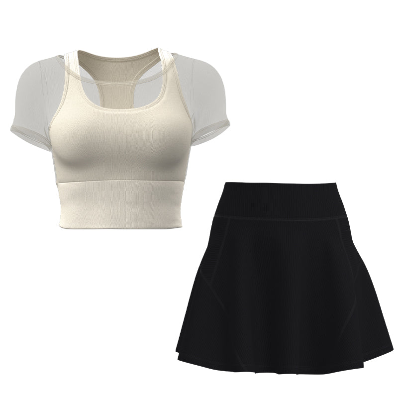Ushbu to'plam kalta qo'llab-quvvatlovchi top va poliester va spandeksdan tayyorlangan mini yubkadan iborat bo'lib, yugurish, fitnes va yoga paytida qulaylik, elastiklik va tez qurishni ta'minlaydi.