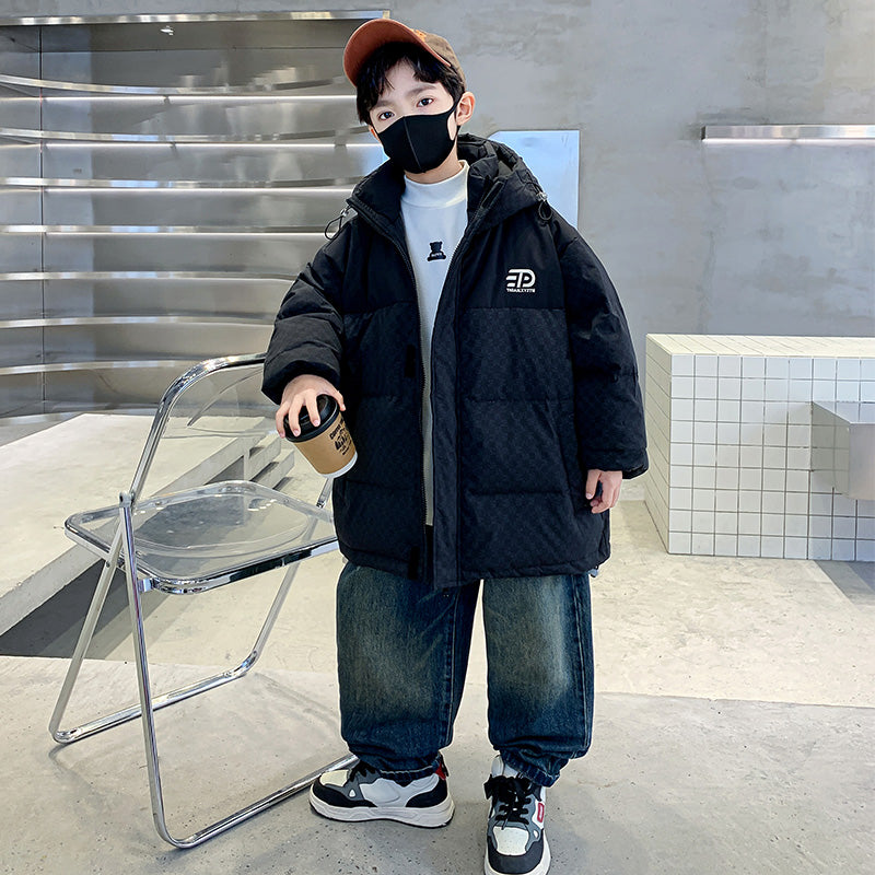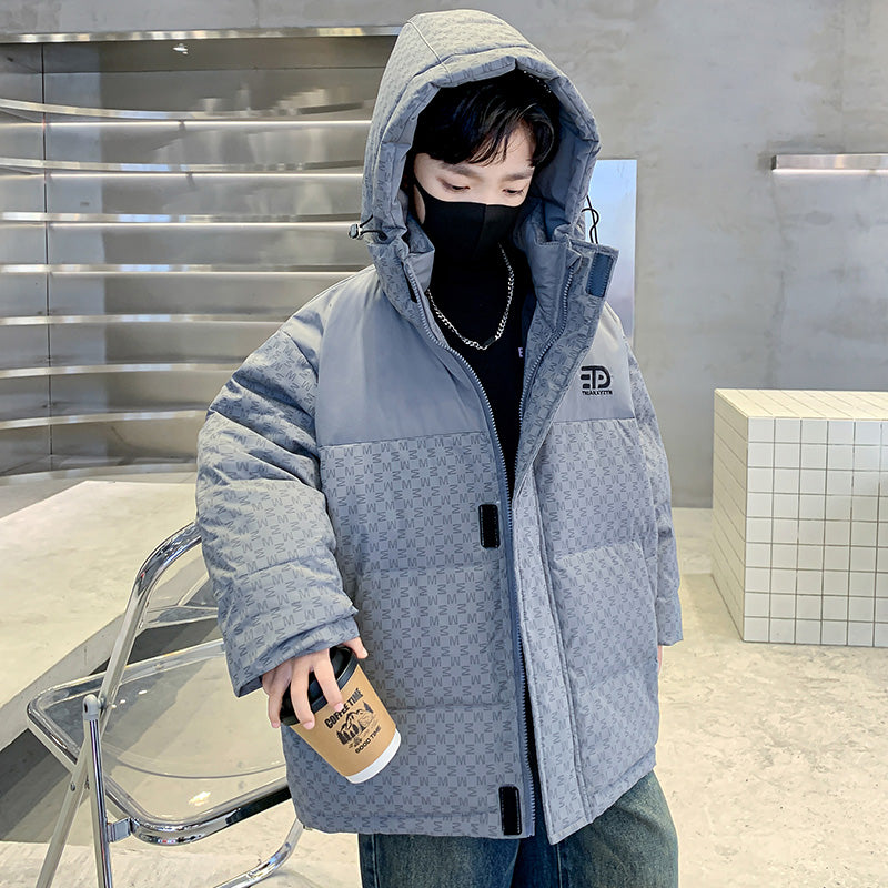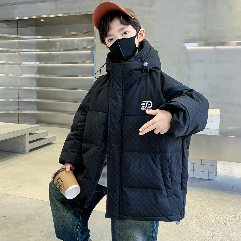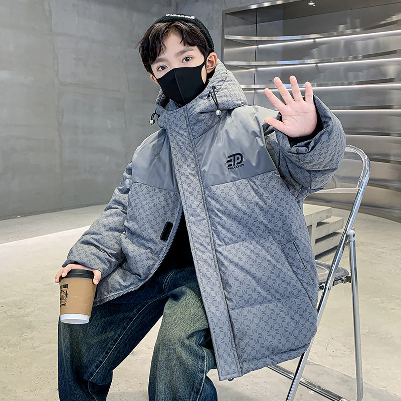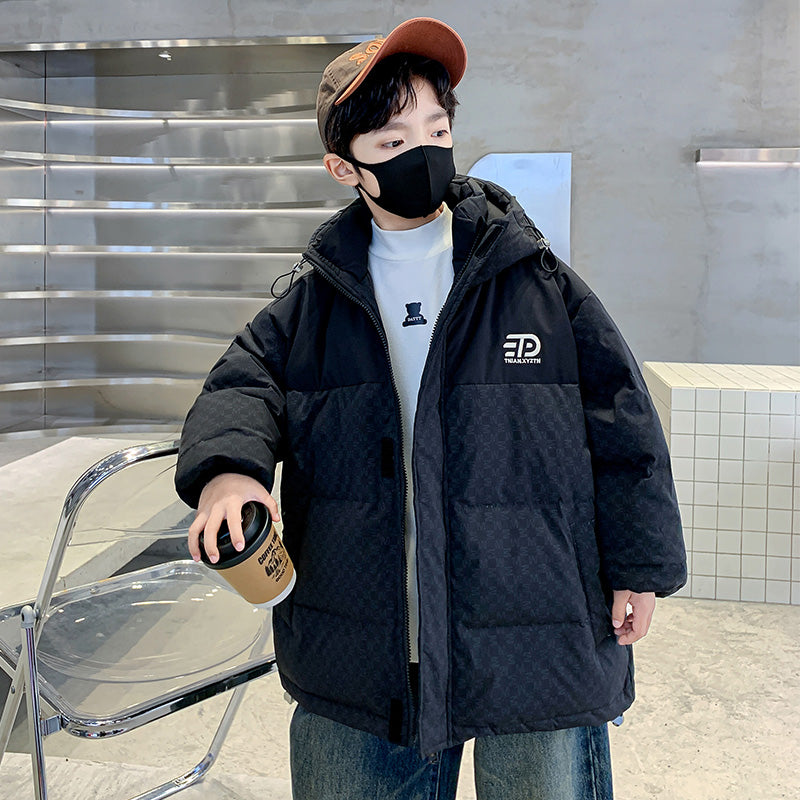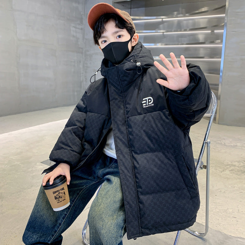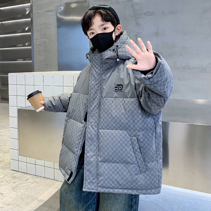 Стильный и качественный пуховик для мальчиков-подростков, украшенный типографским принтом в виде букв. Модель обеспечивает тепло и комфорт, сочетая современный дизайн с практичностью для повседневной носки.
