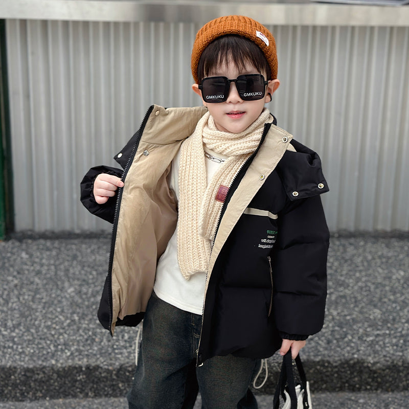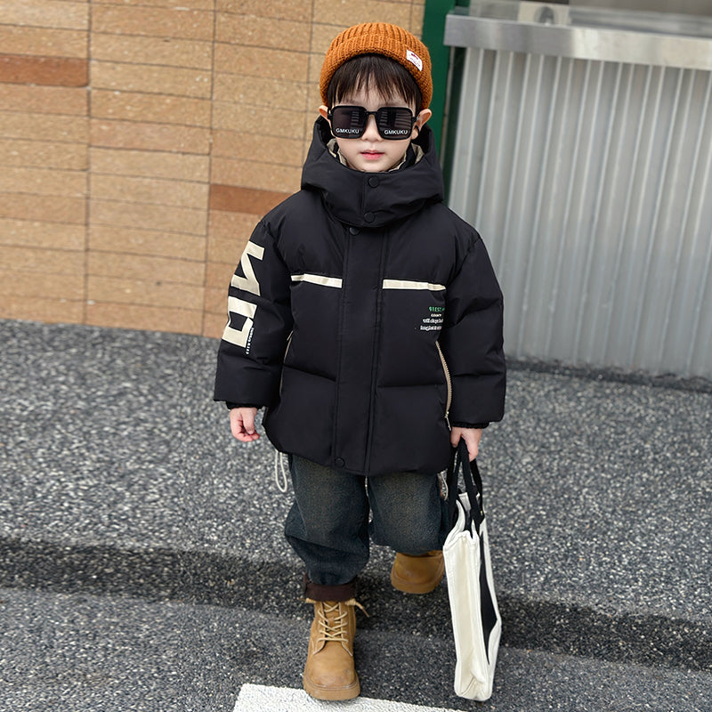 Детский пуховик с капюшоном и минималистичным принтом в виде букв, выполненный из нейлоновой ткани. Модель свободного кроя наполнена белым утиным пухом, обеспечивая тепло и комфорт для повседневного использования.