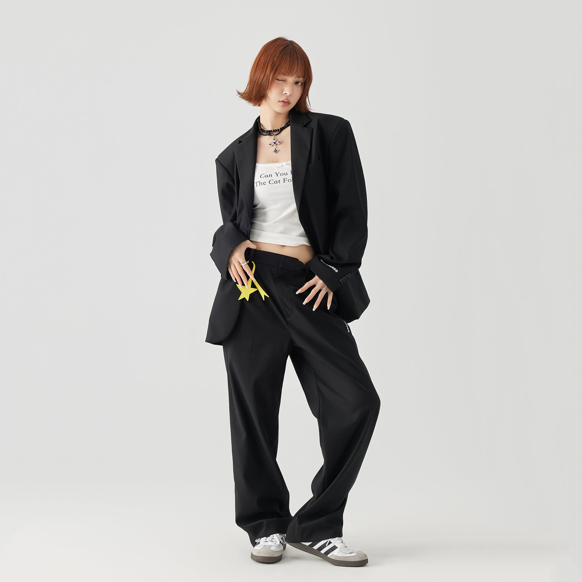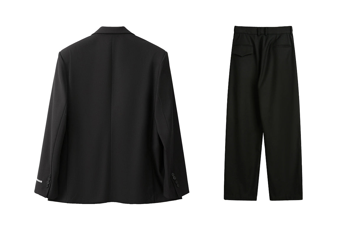 Комплект в стиле кежуал, состоящий из пиджака свободного кроя и брюк с эффектом драпировки. Минималистичный дизайн с вышитой надписью подчеркивает современный и элегантный силуэт.