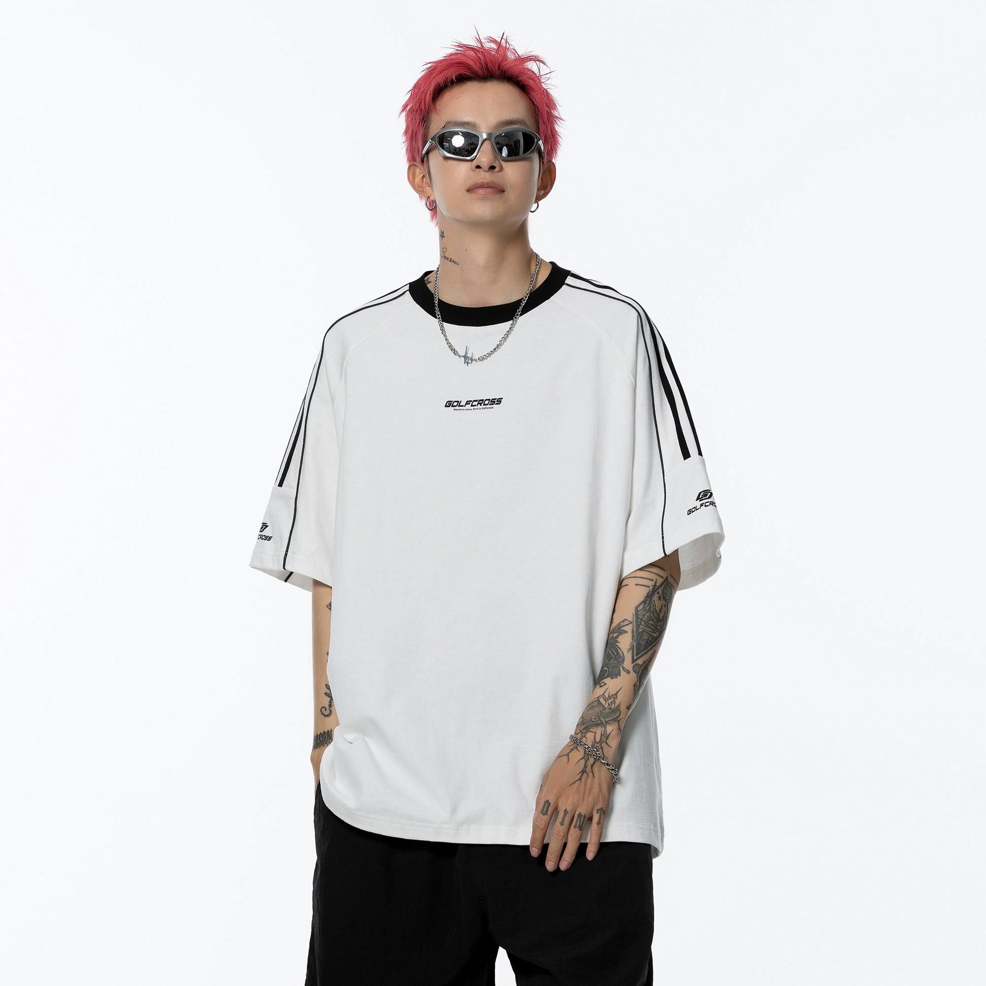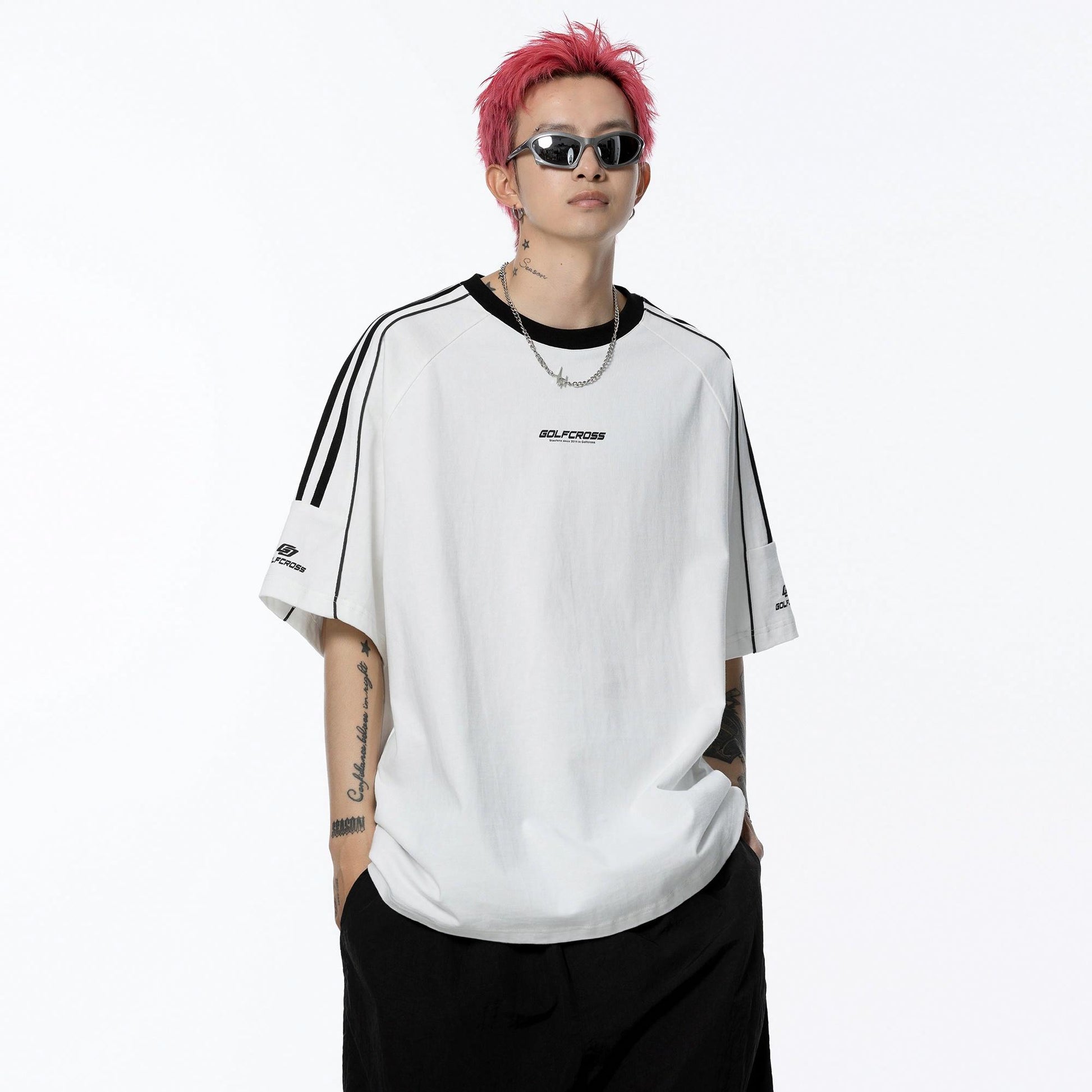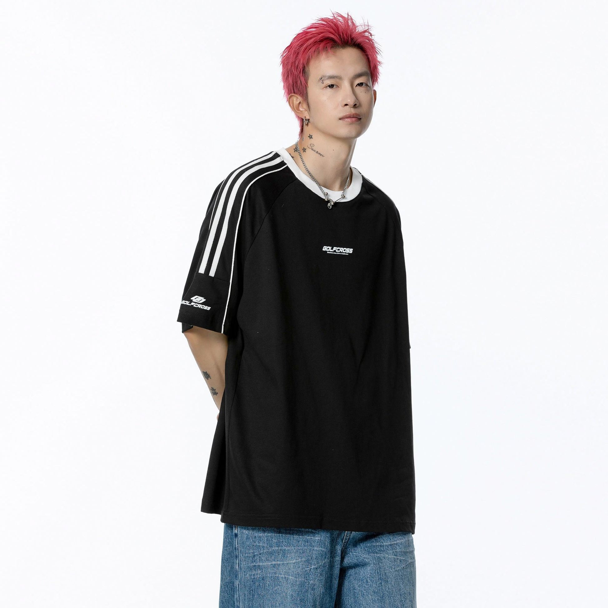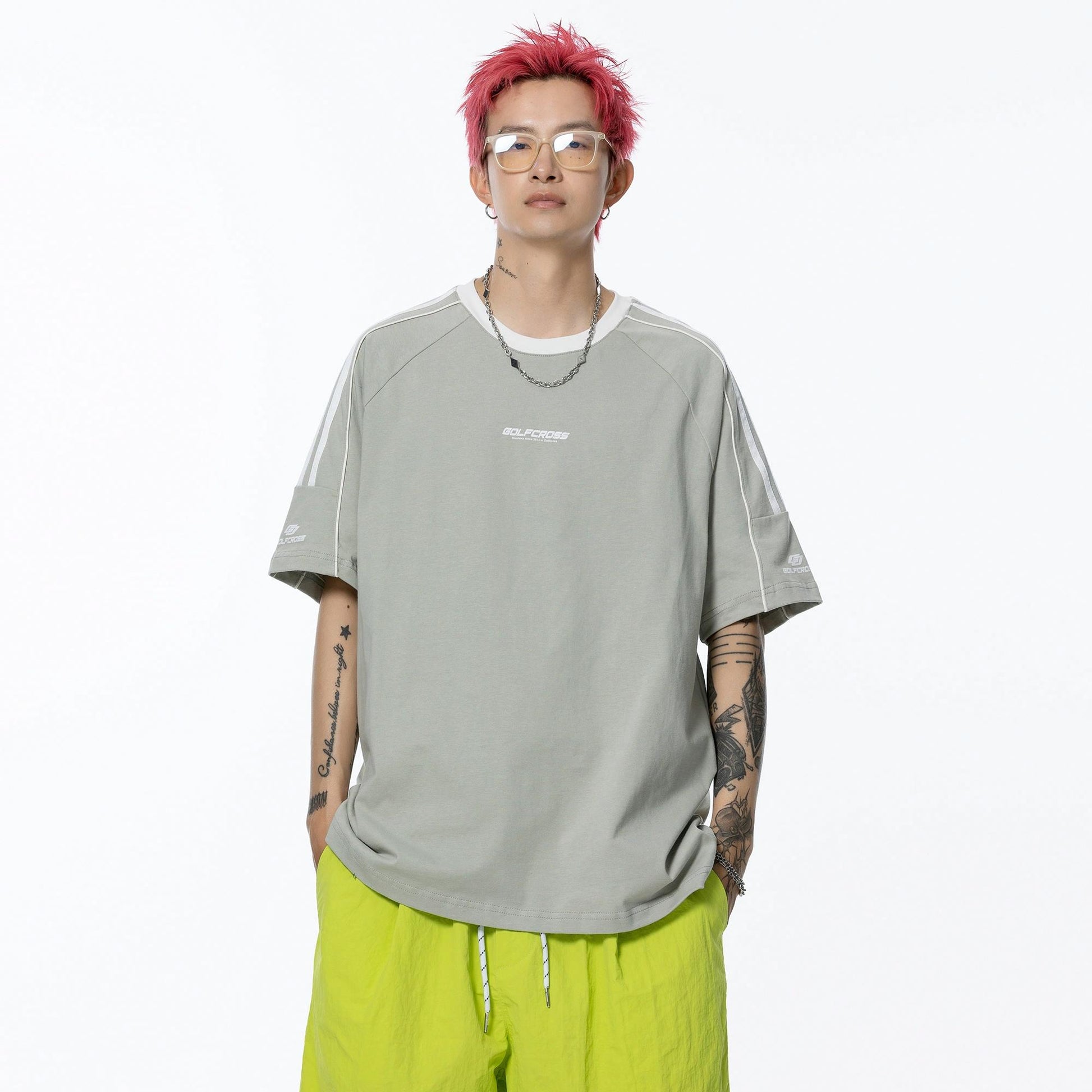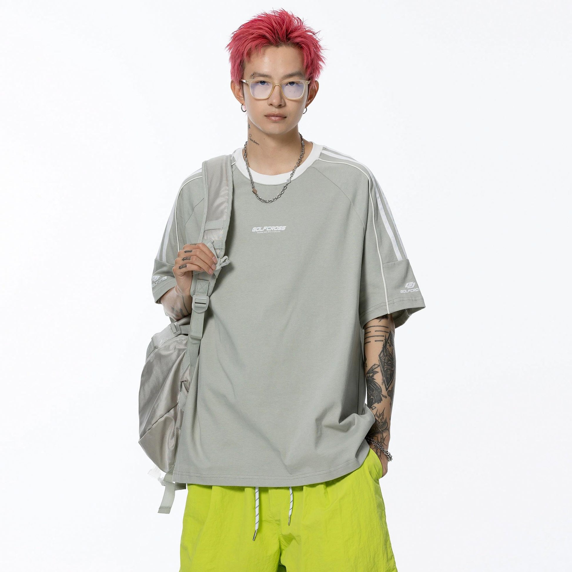 Kollej uslubidagi golfkross rangli to'qnashuv lentasi chiziqli yelkali yengli dumaloq bo'yinli qisqa yengli futbolka bir xil paragrafli erkaklar va ayollar