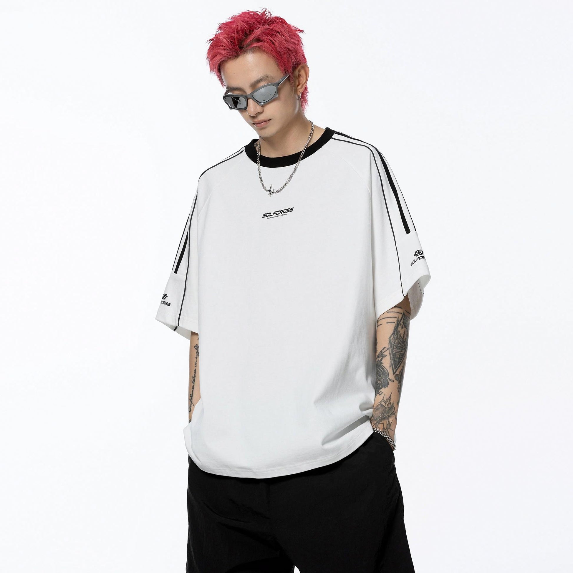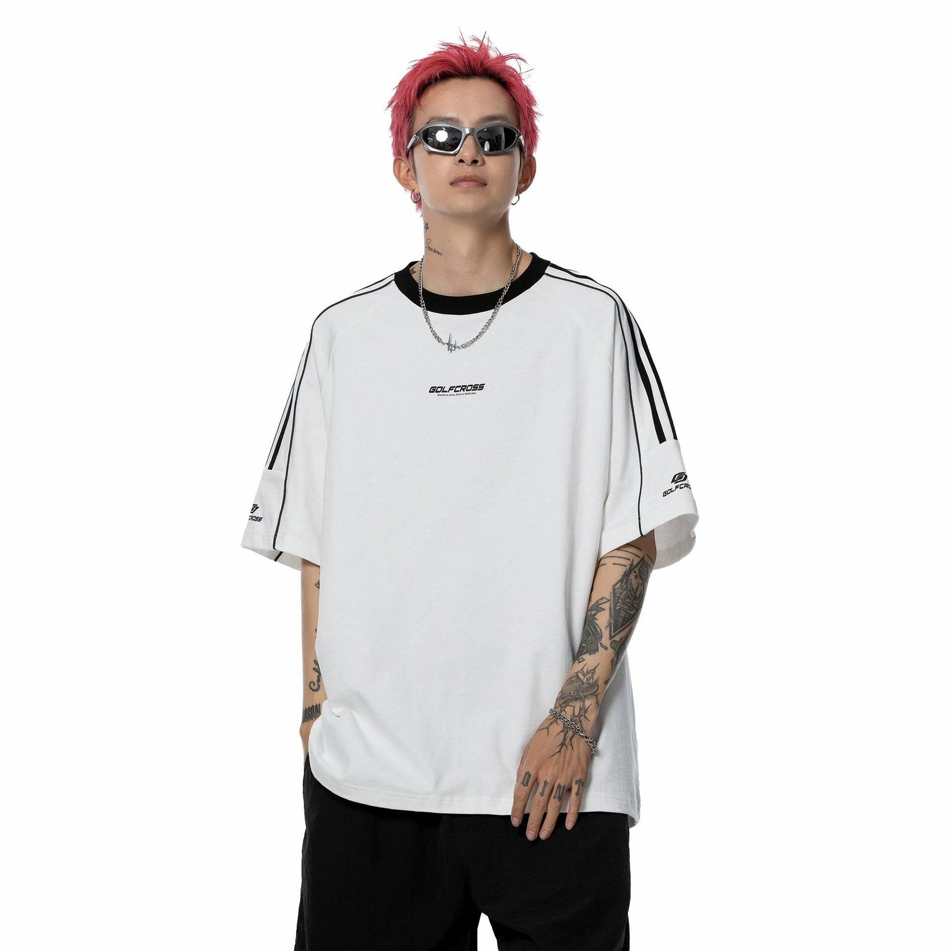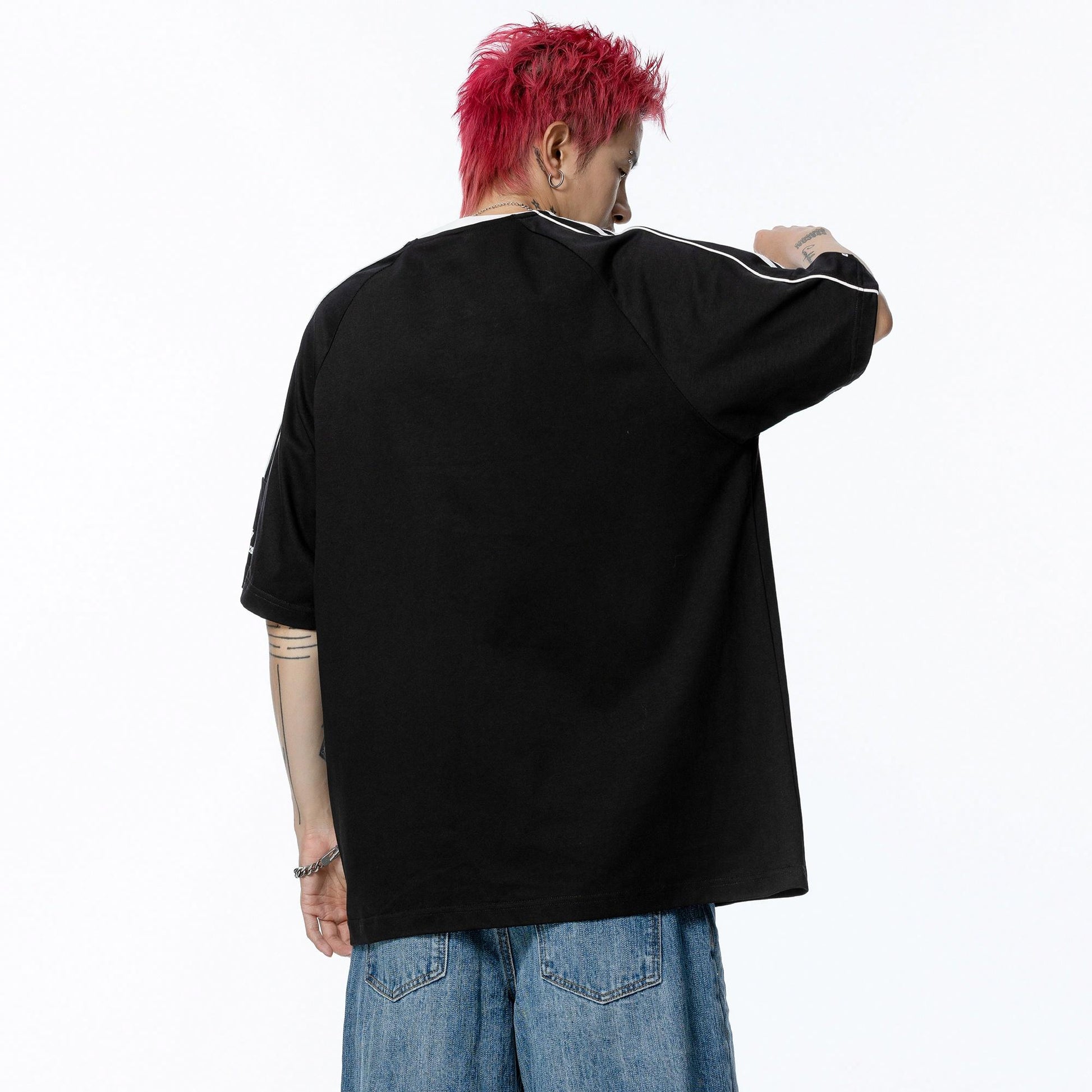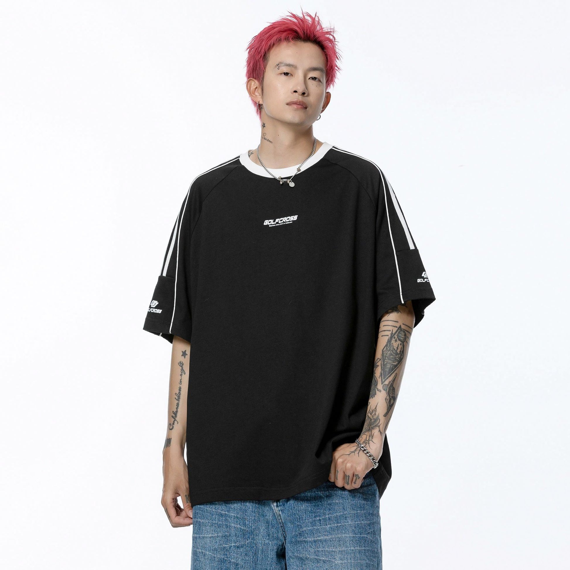 Kollej uslubidagi golfkross rangli to'qnashuv lentasi chiziqli yelkali yengli dumaloq bo'yinli qisqa yengli futbolka bir xil paragrafli erkaklar va ayollar