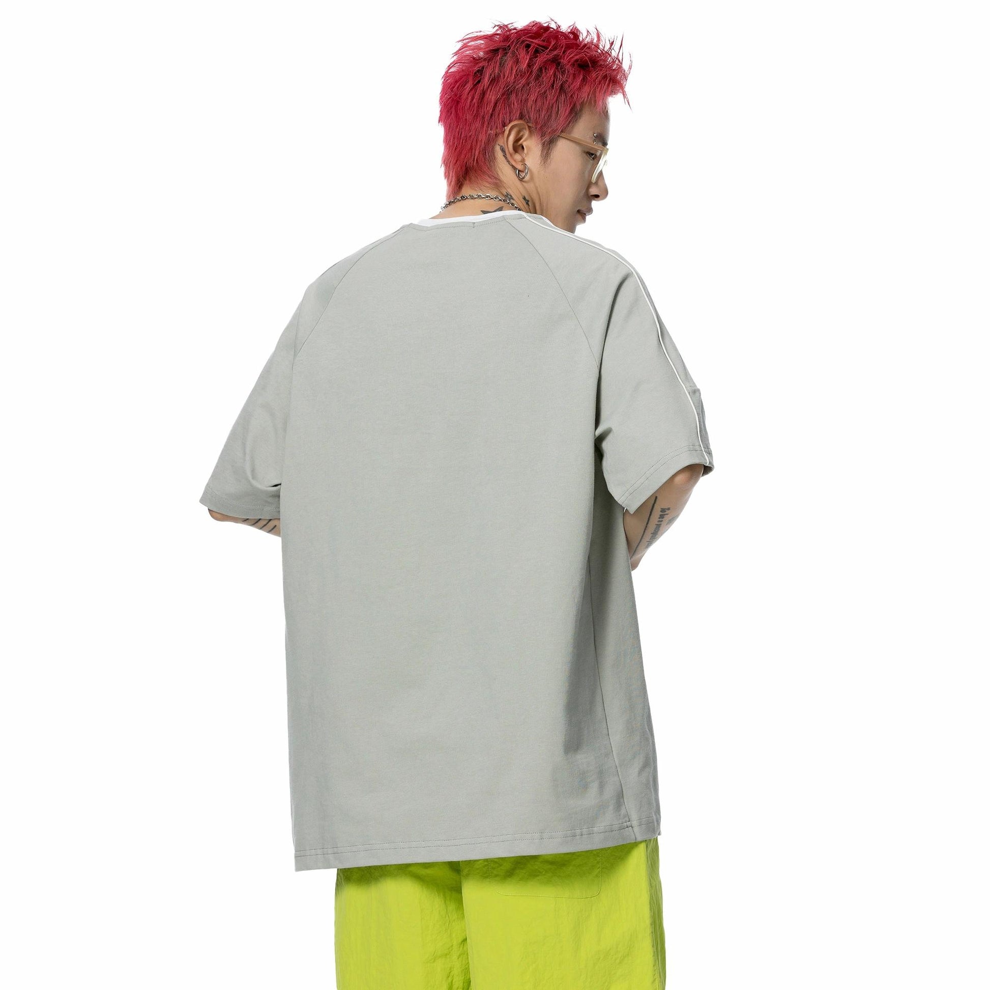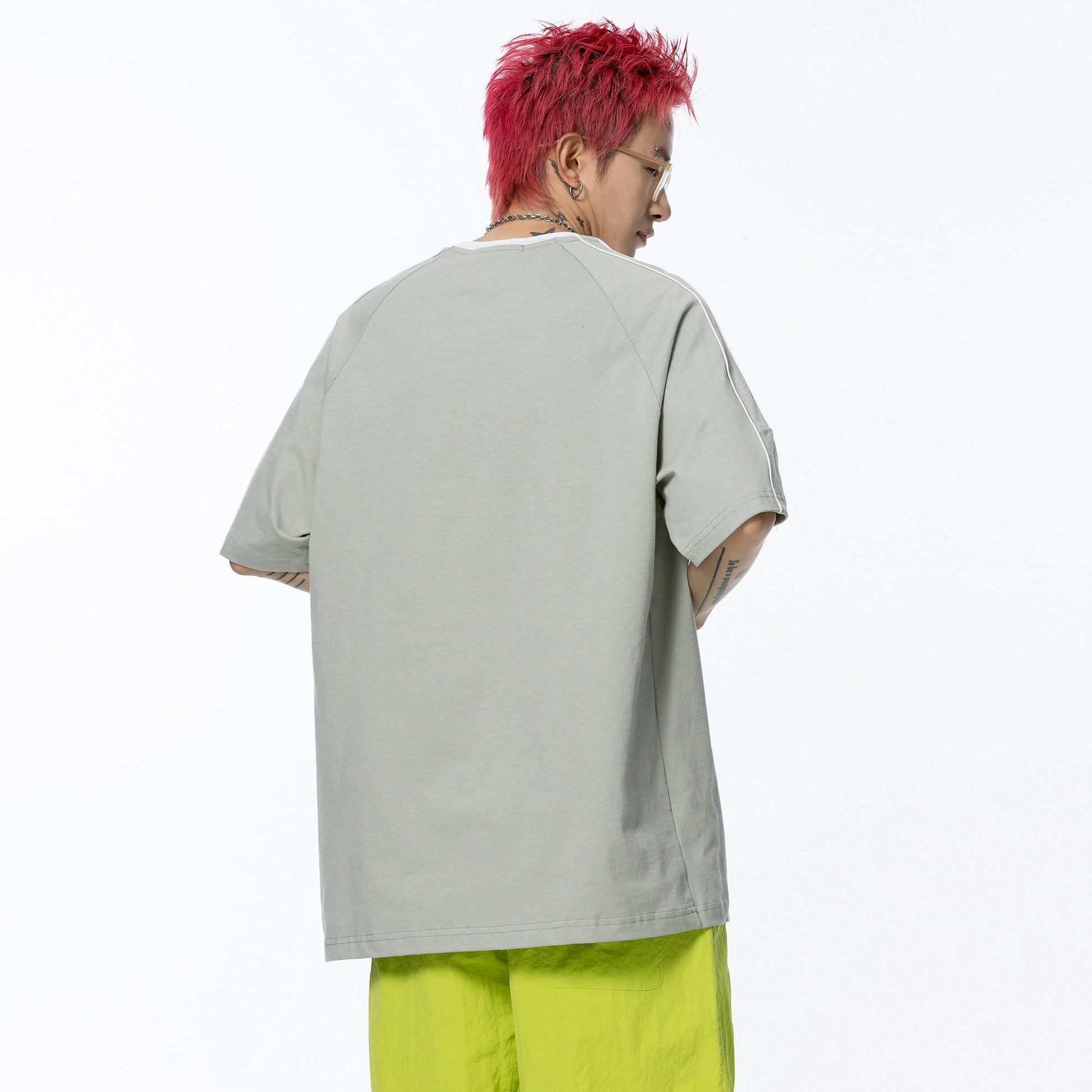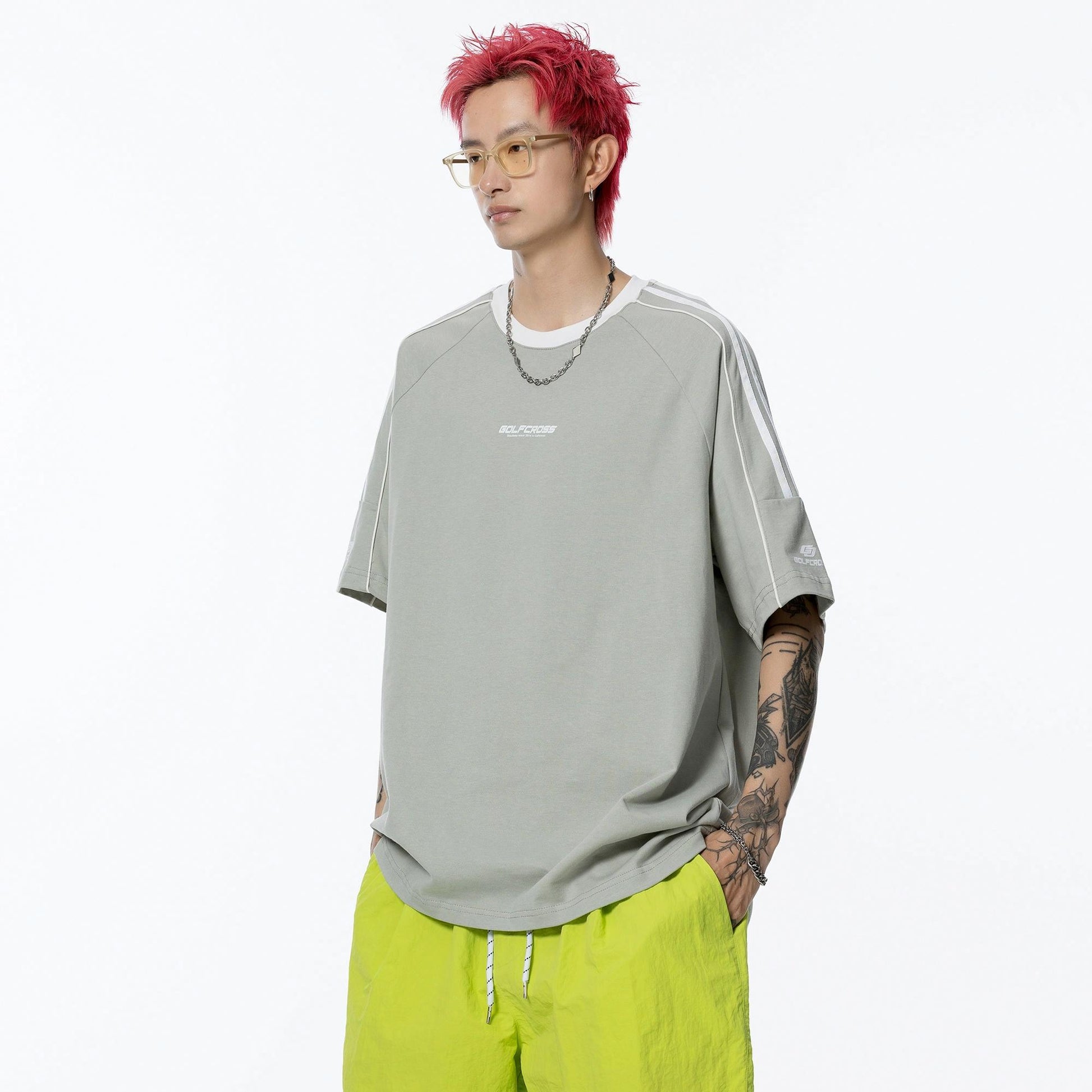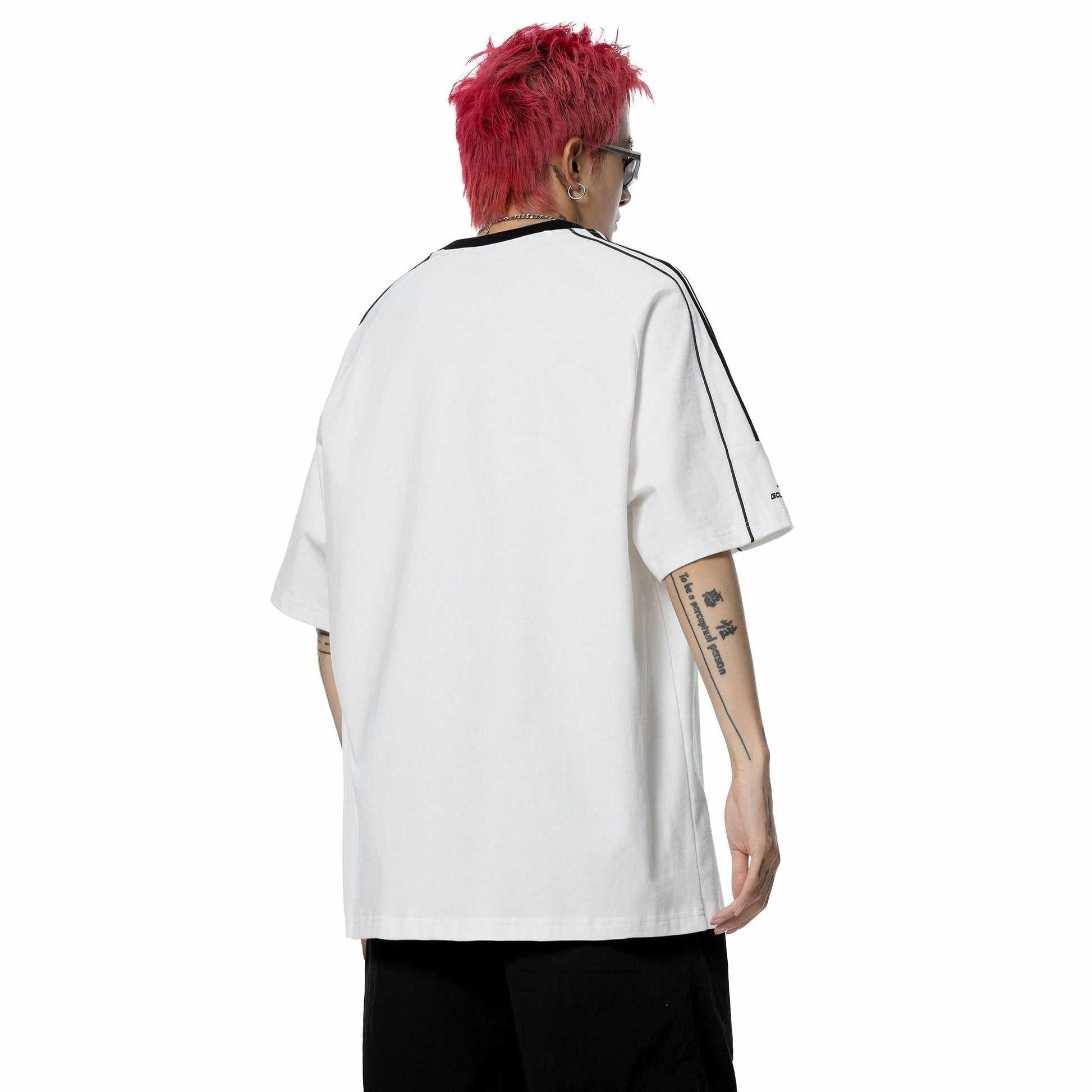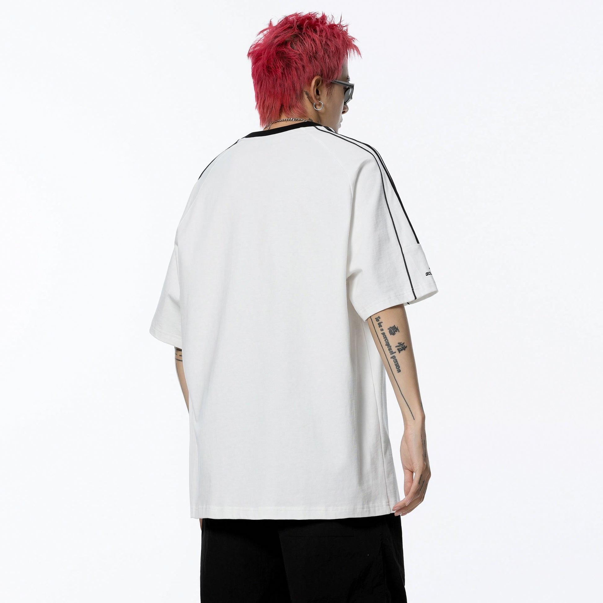 Kollej uslubidagi golfkross rangli to'qnashuv lentasi chiziqli yelkali yengli dumaloq bo'yinli qisqa yengli futbolka bir xil paragrafli erkaklar va ayollar