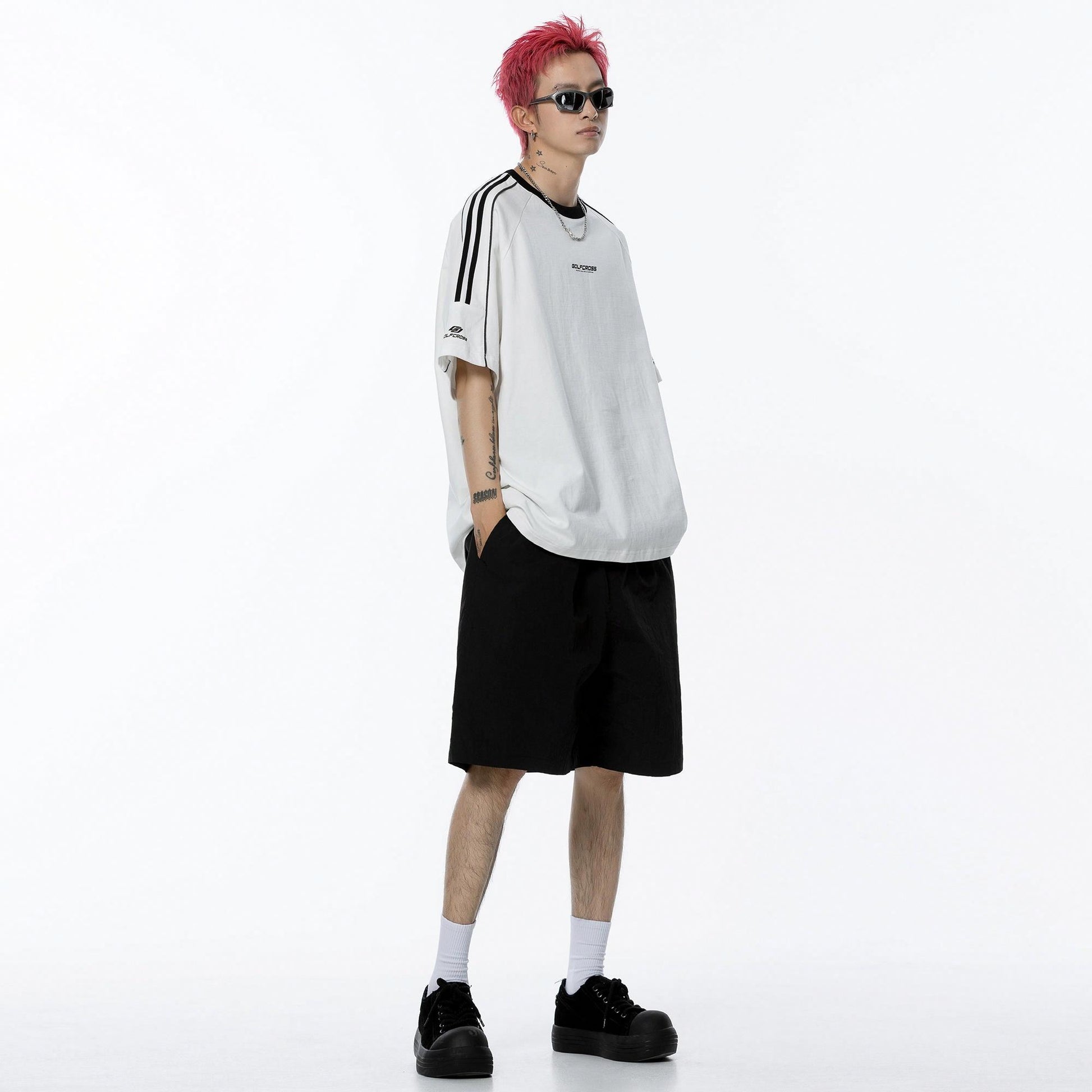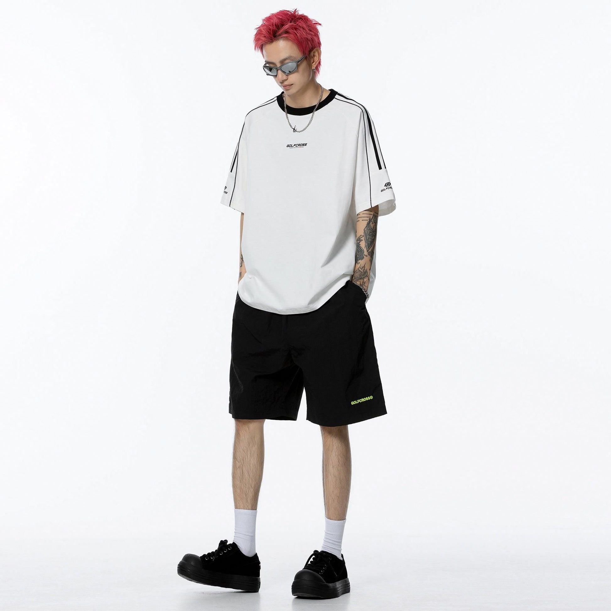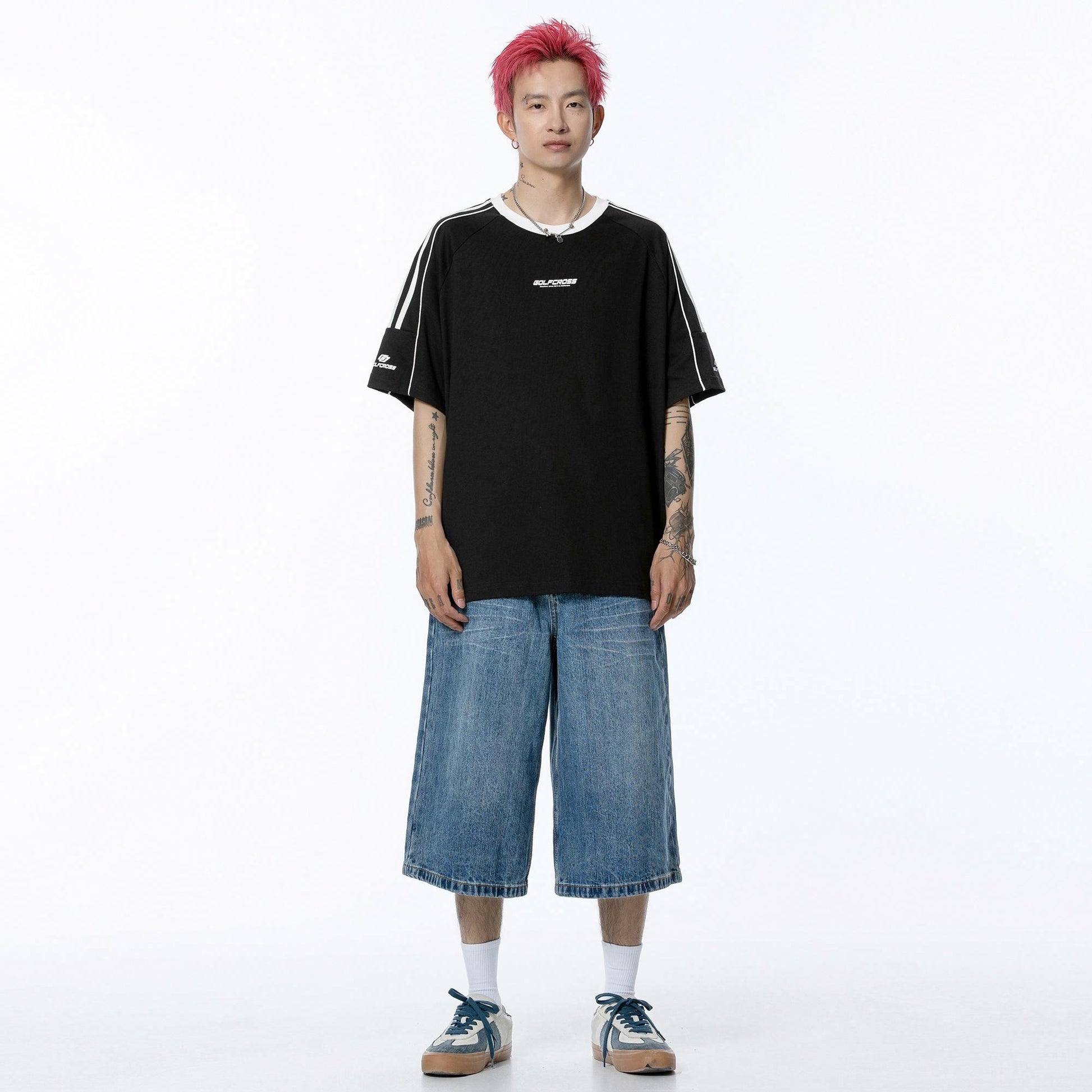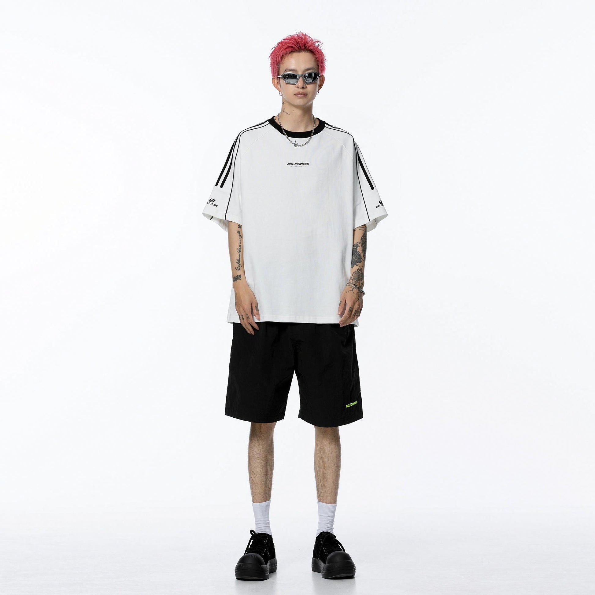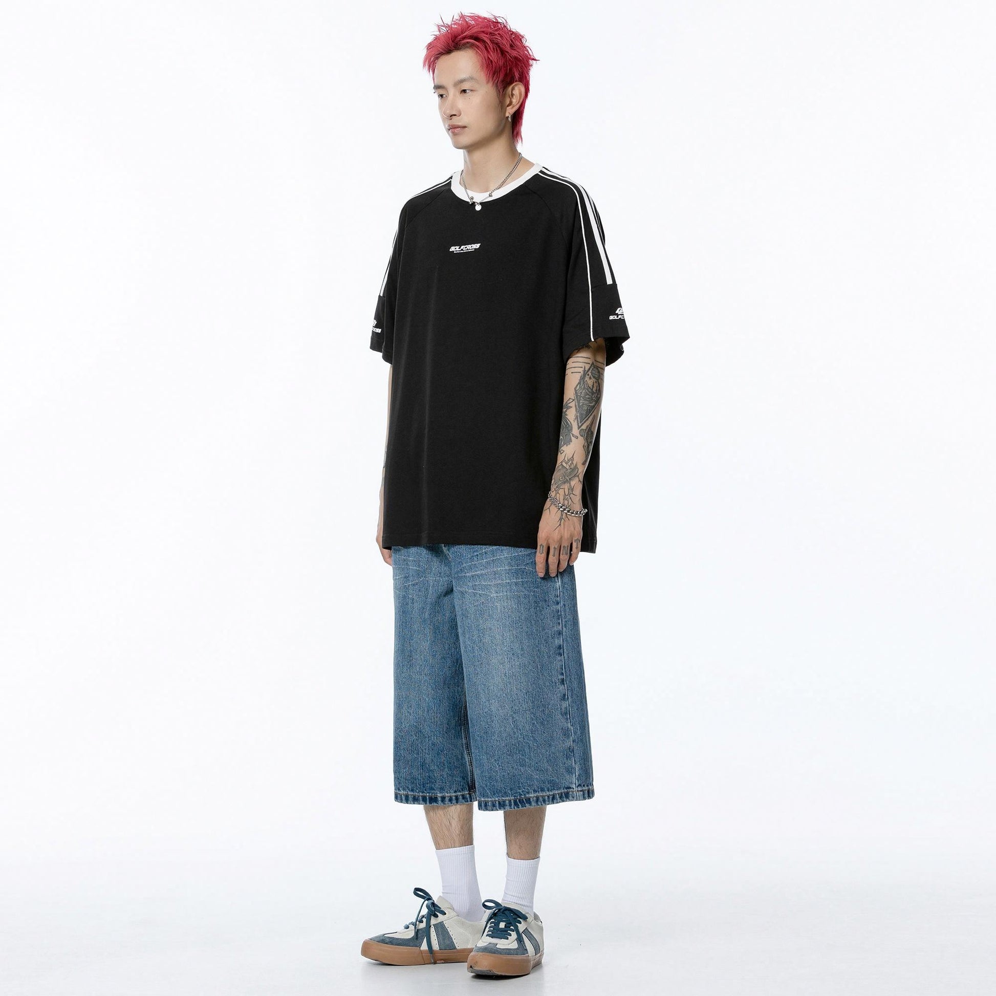 Kollej uslubidagi golfkross rangli to'qnashuv lentasi chiziqli yelkali yengli dumaloq bo'yinli qisqa yengli futbolka bir xil paragrafli erkaklar va ayollar