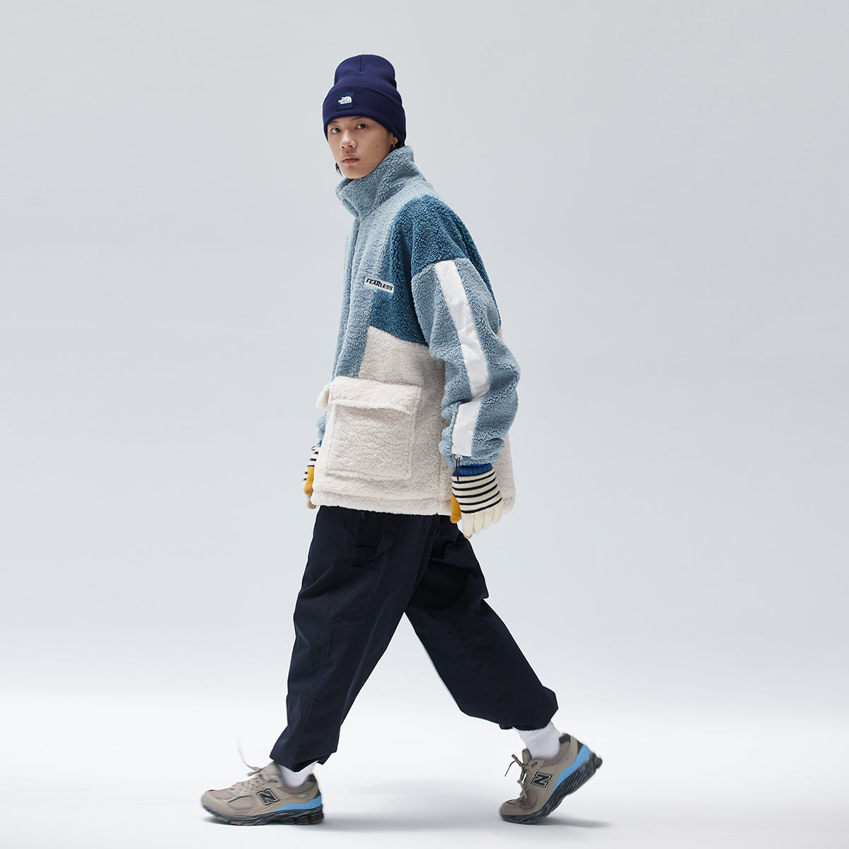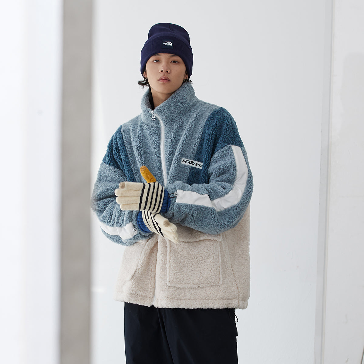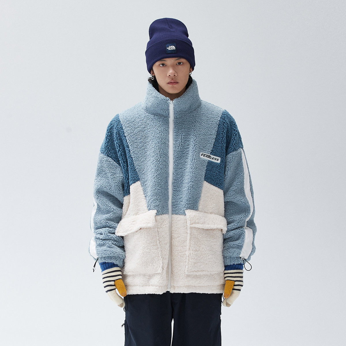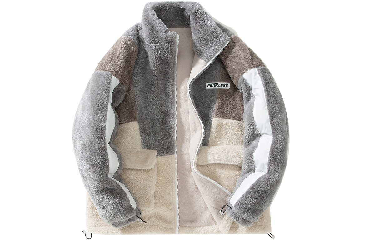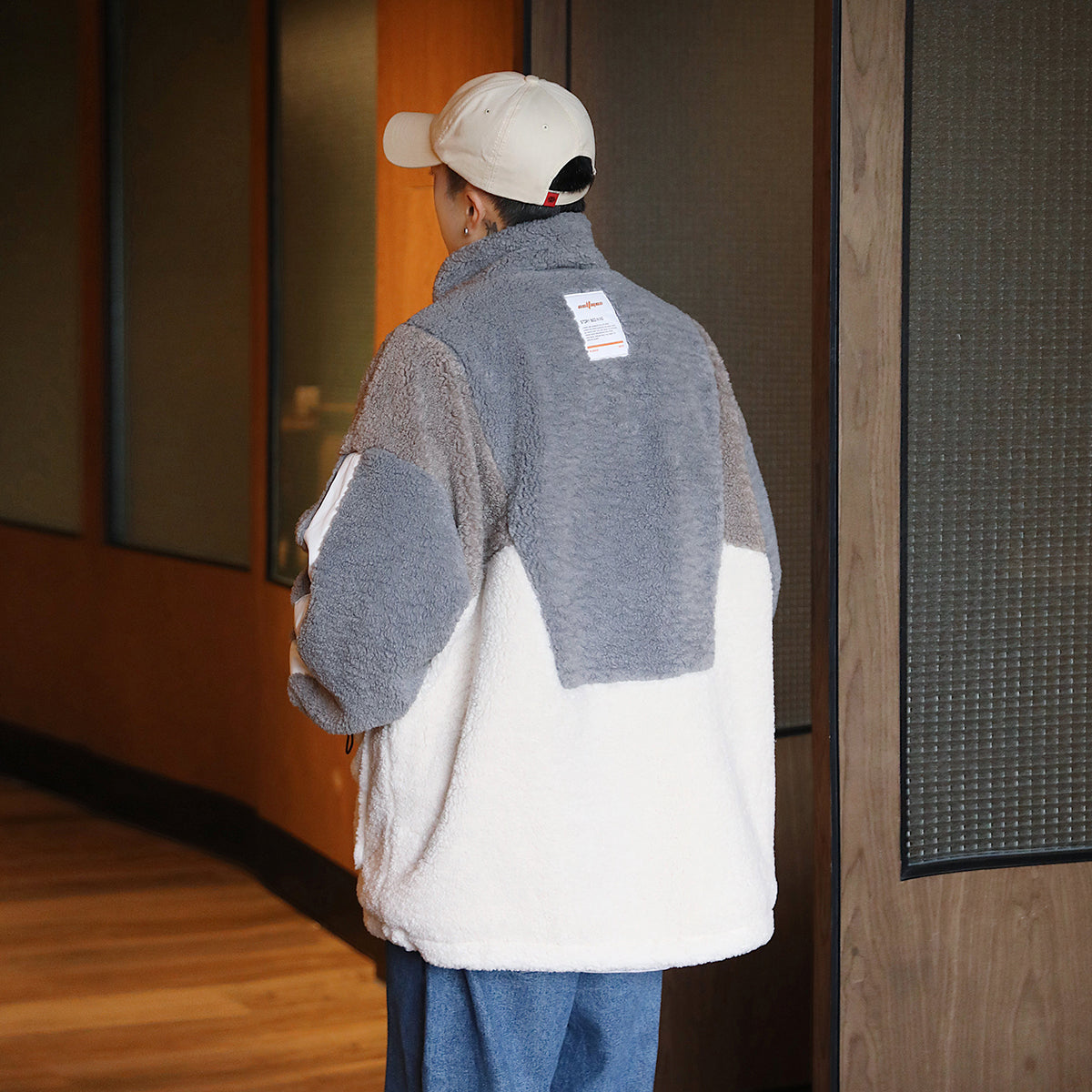 Куртка в стиле рабочей одежды из искусственного меха с контрастными вставками, карманами на молнии и нашивками. Модель свободного кроя обеспечивает тепло и уличный стиль.