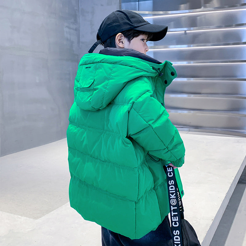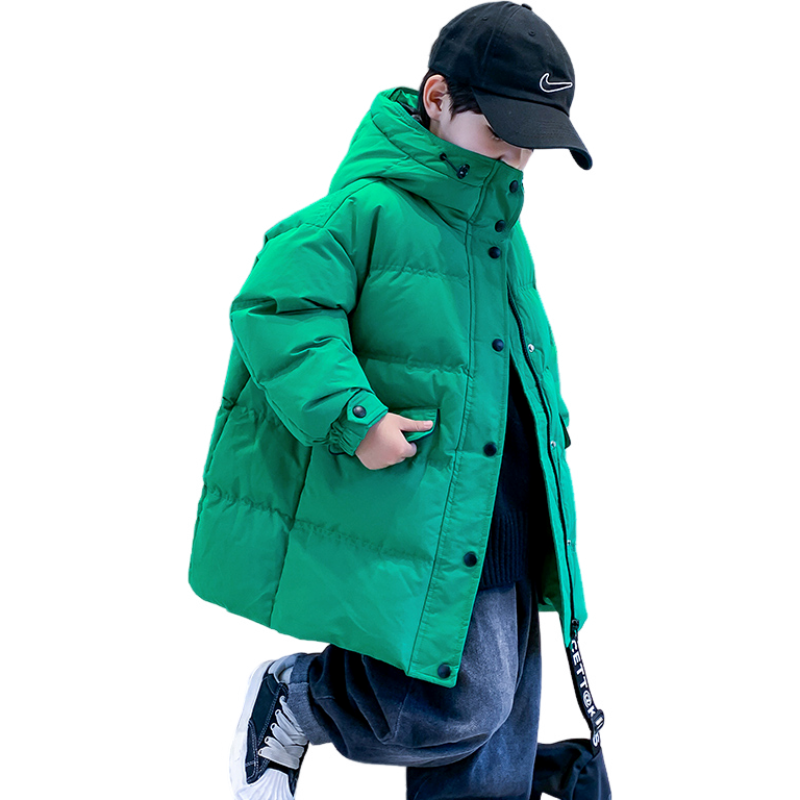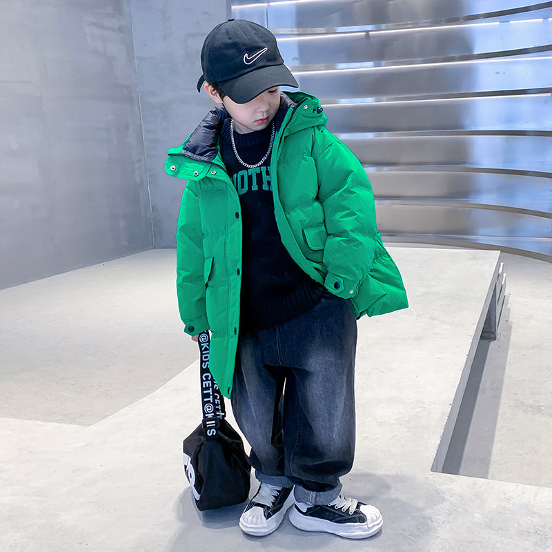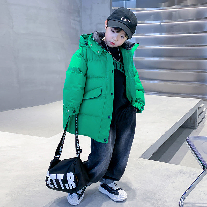 Длинный пуховик для мальчиков с высоким воротником, наполненный белым утиным пухом. Модель свободного кроя с утепленной подкладкой обеспечивает тепло, защиту от ветра и элегантный внешний вид для холодного времени года.
