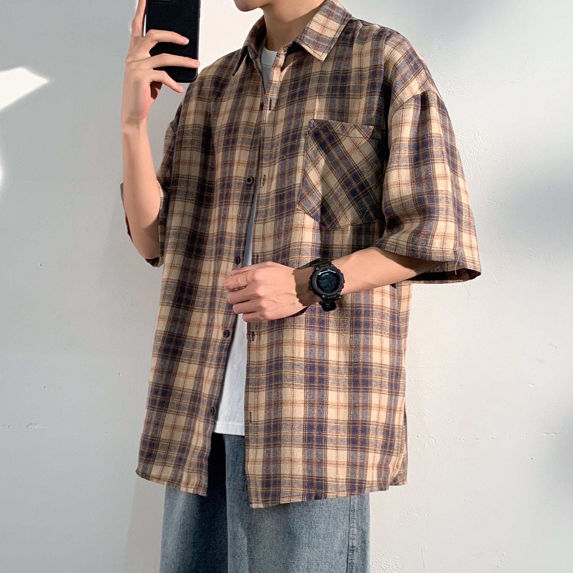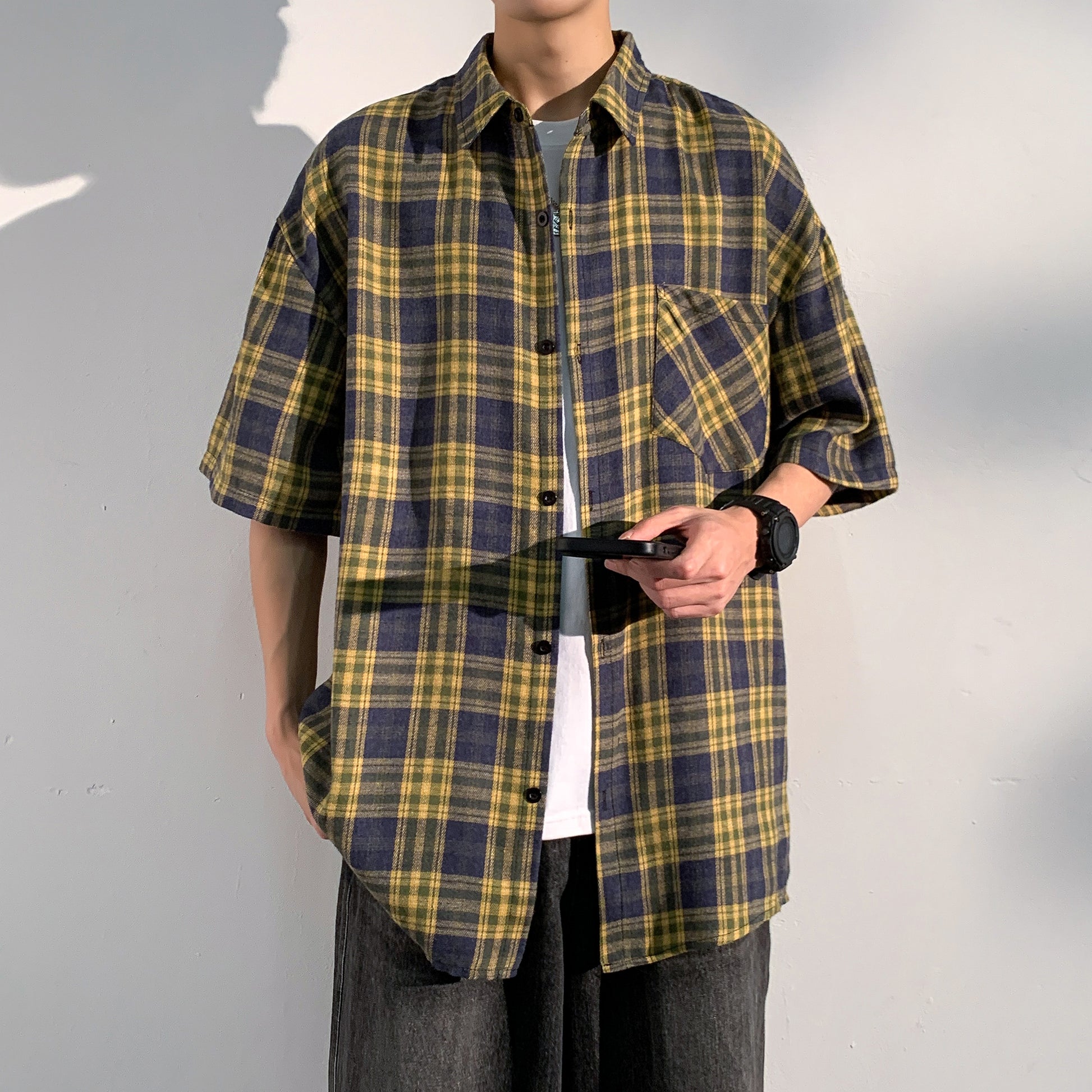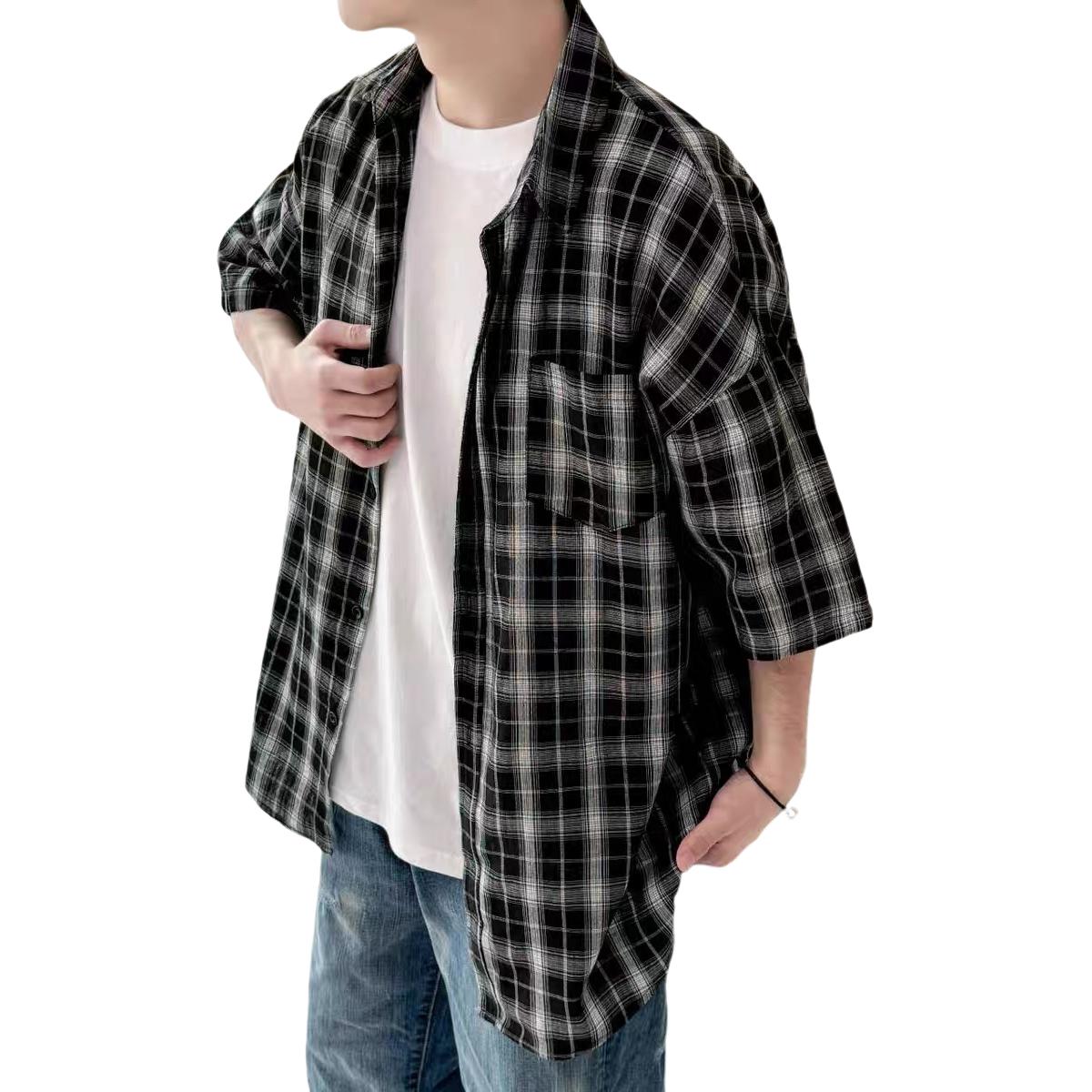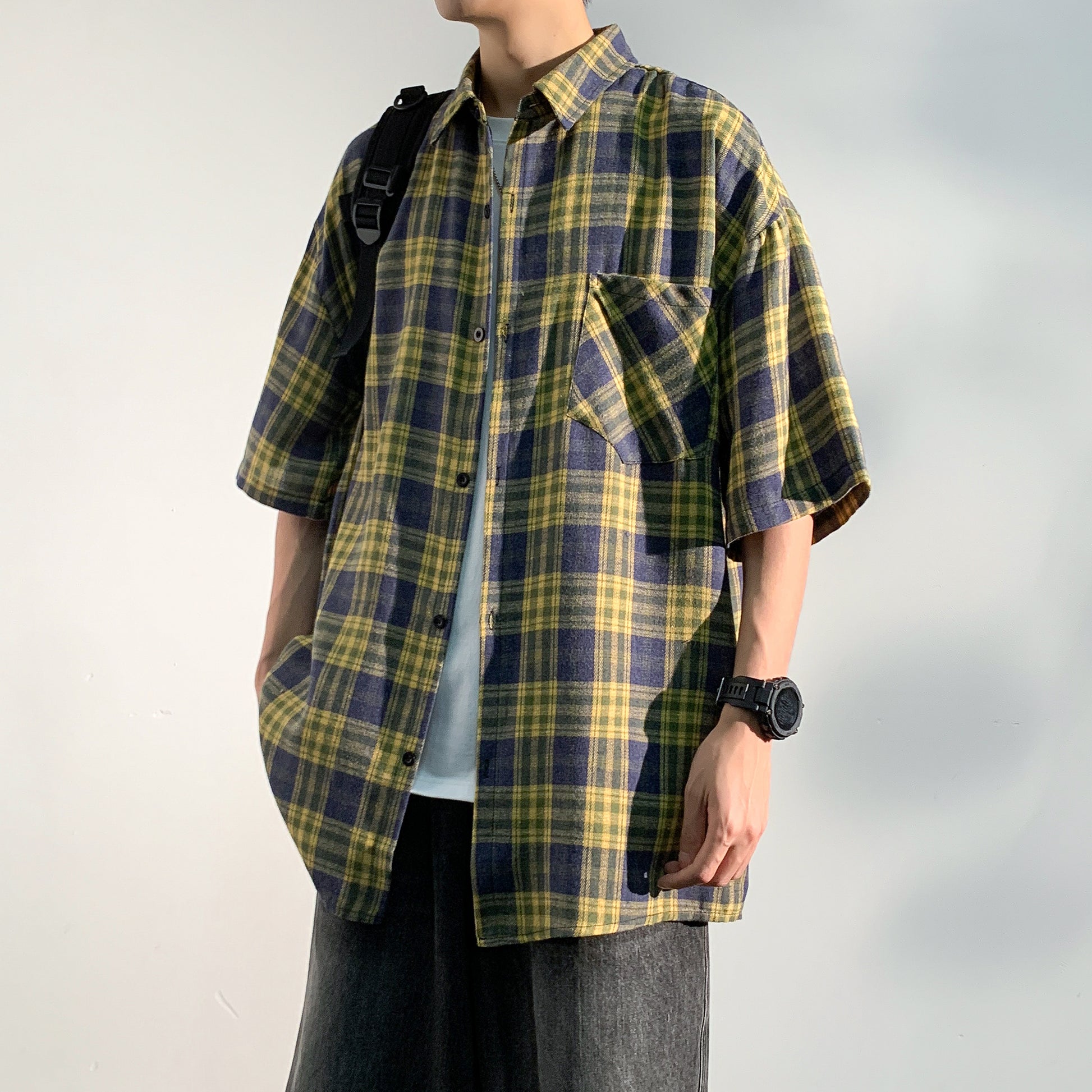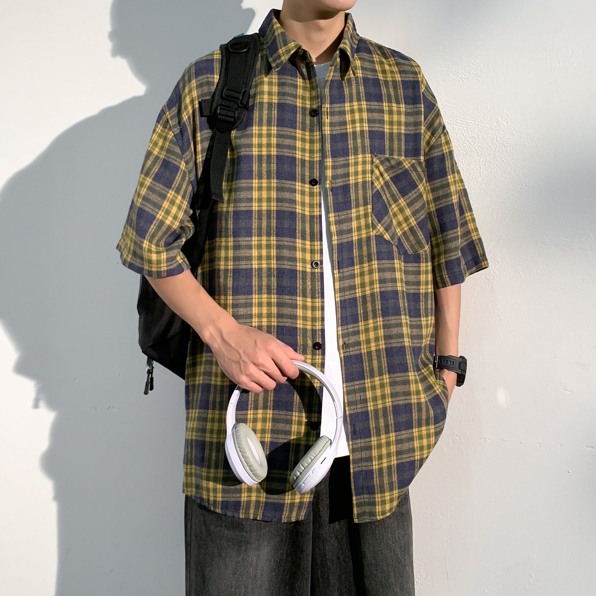 Hvga Amerika retro asosiy modellari plashli birlashma to'qnashuv rangli yarim yengli ko'ylak ko'ylagi ter singdirish nafas oladigan yupqa bo'sh katta o'lchamli talabalar partiyasi qisqa qisma ko'ylak erkaklar va ayollar modellari