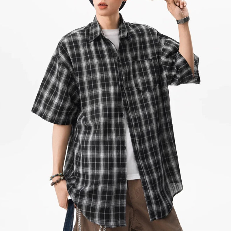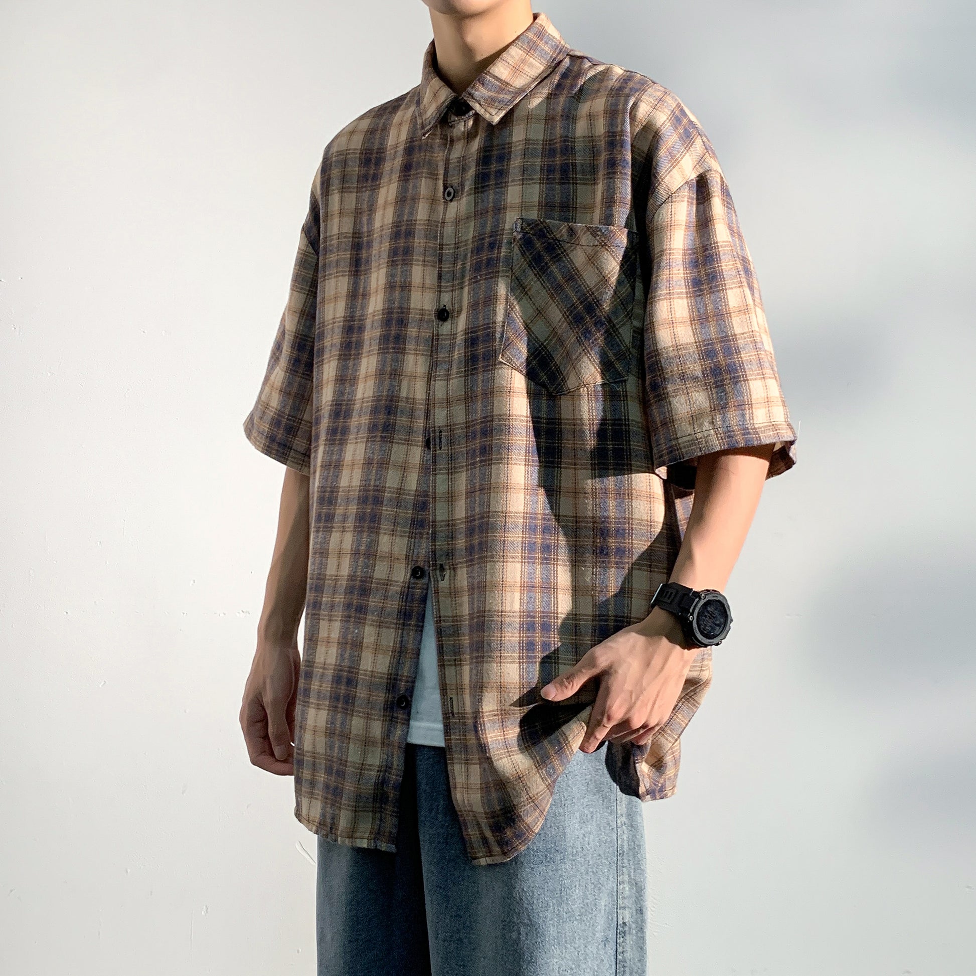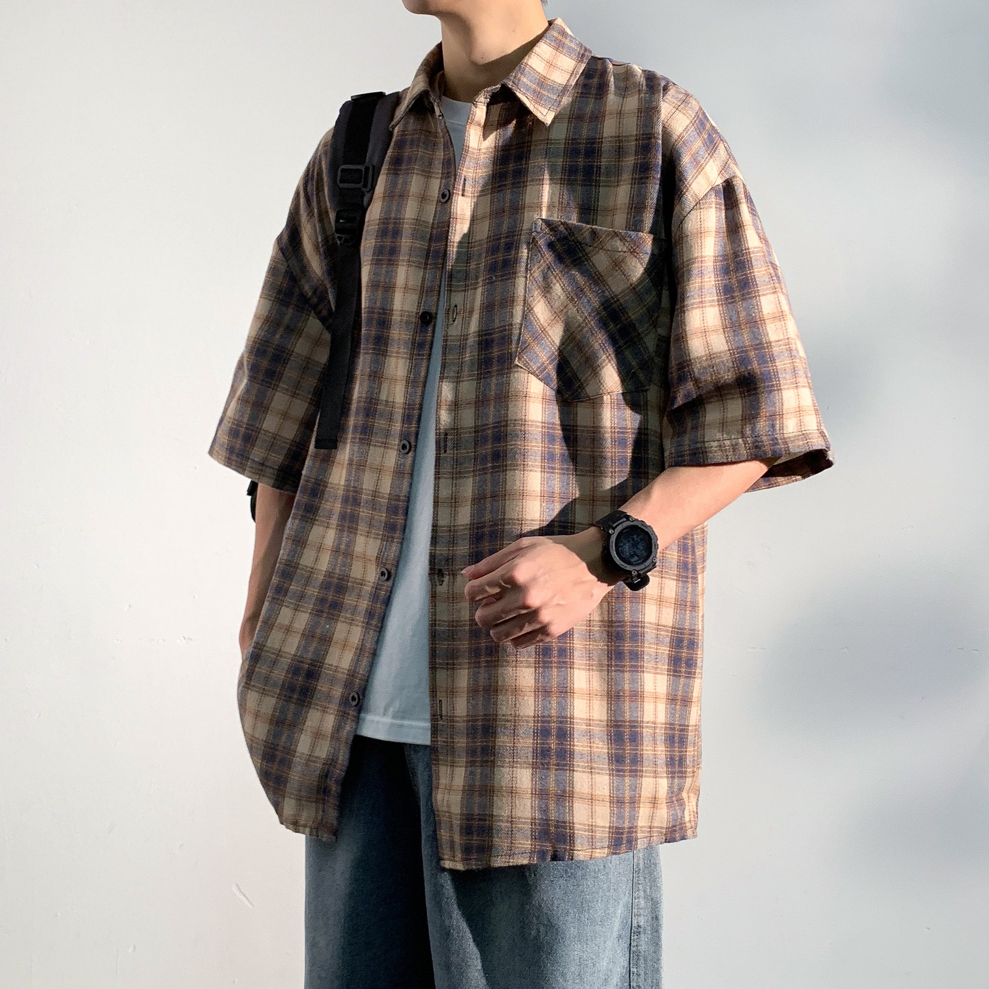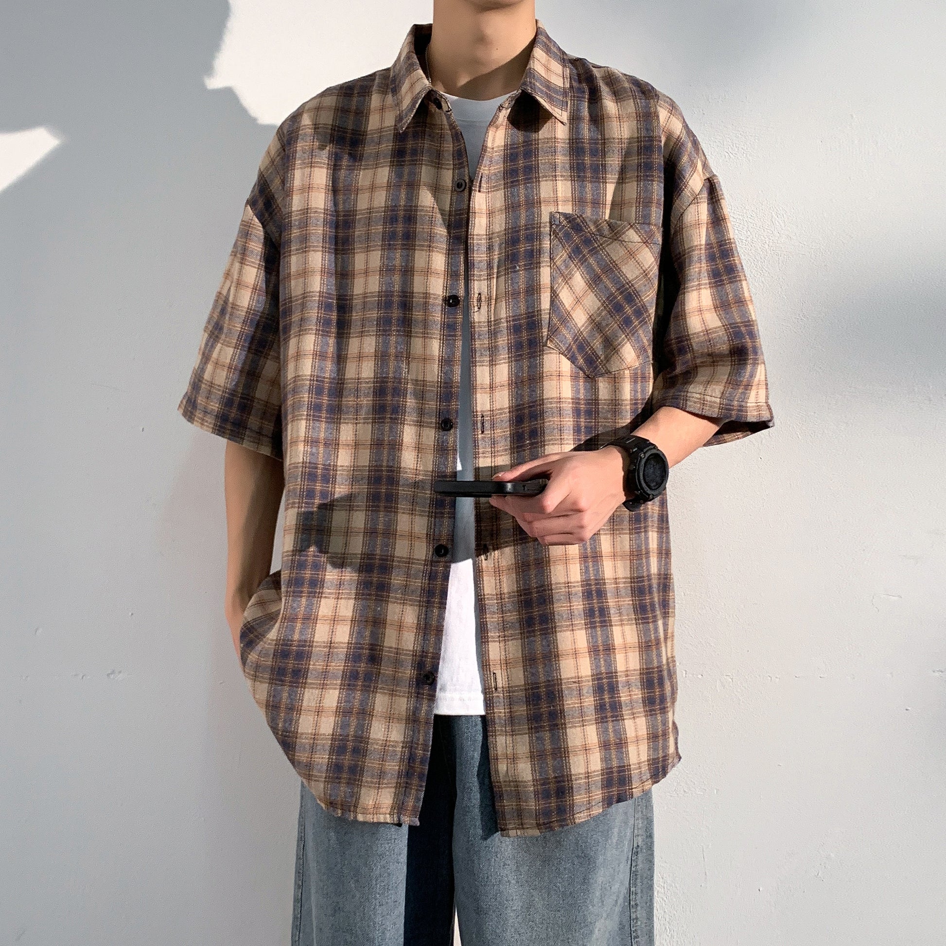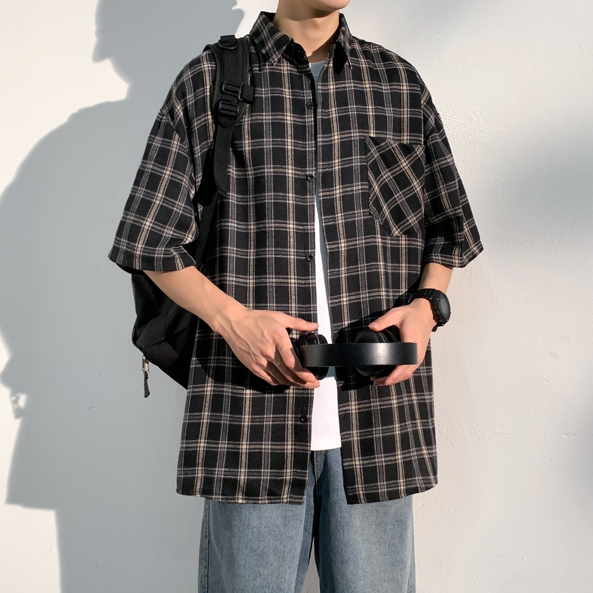 Hvga Amerika retro asosiy modellari plashli birlashma to'qnashuv rangli yarim yengli ko'ylak ko'ylagi ter singdirish nafas oladigan yupqa bo'sh katta o'lchamli talabalar partiyasi qisqa qisma ko'ylak erkaklar va ayollar modellari