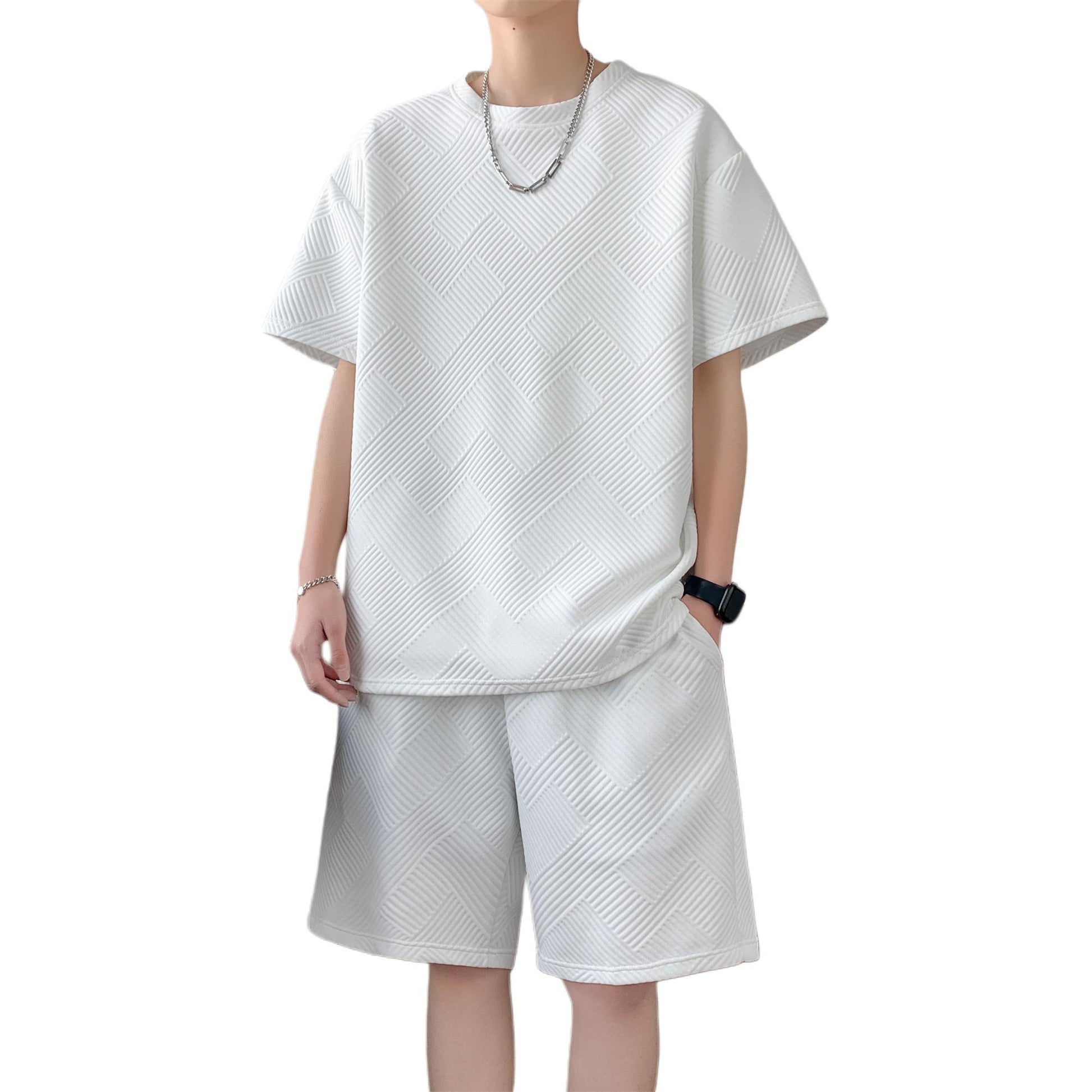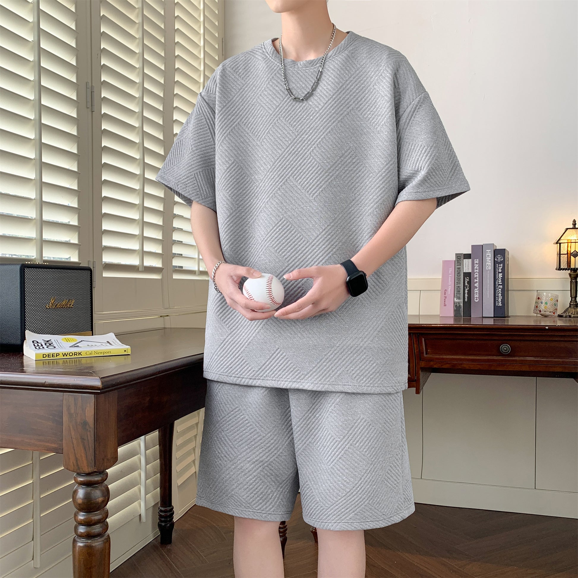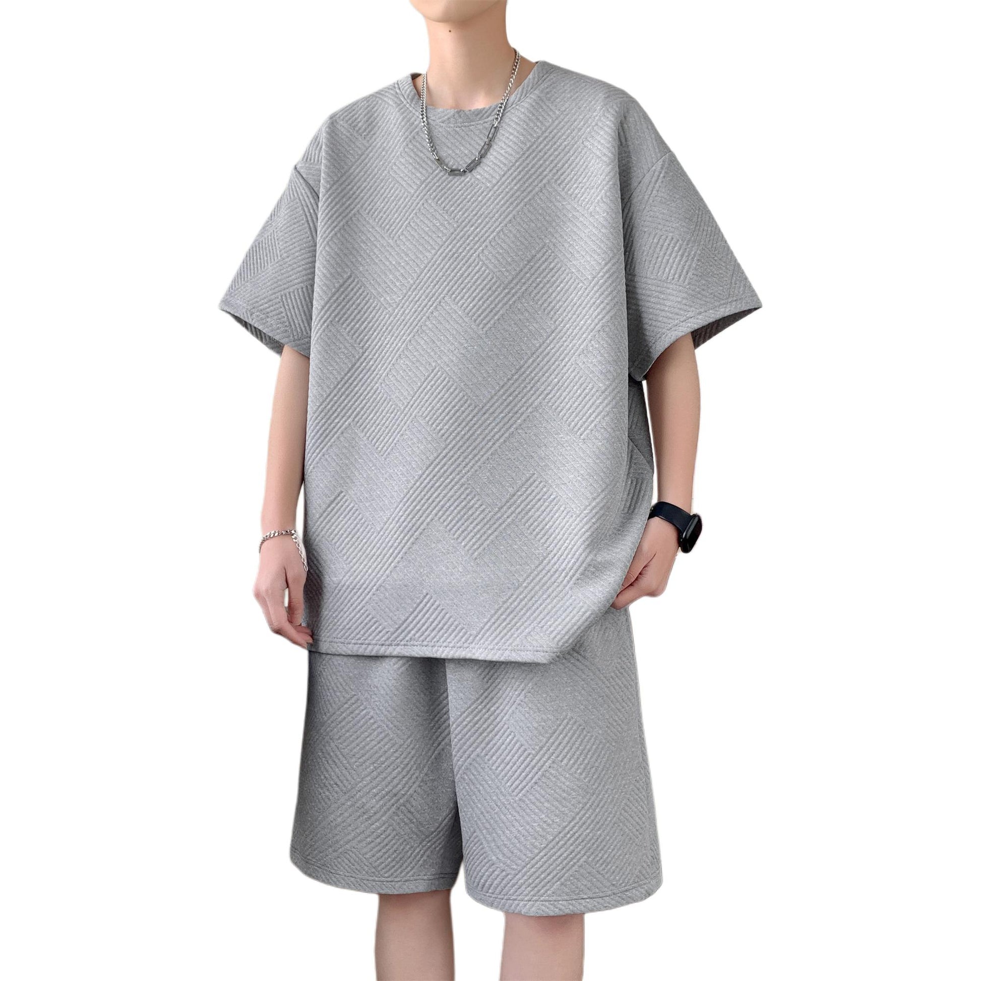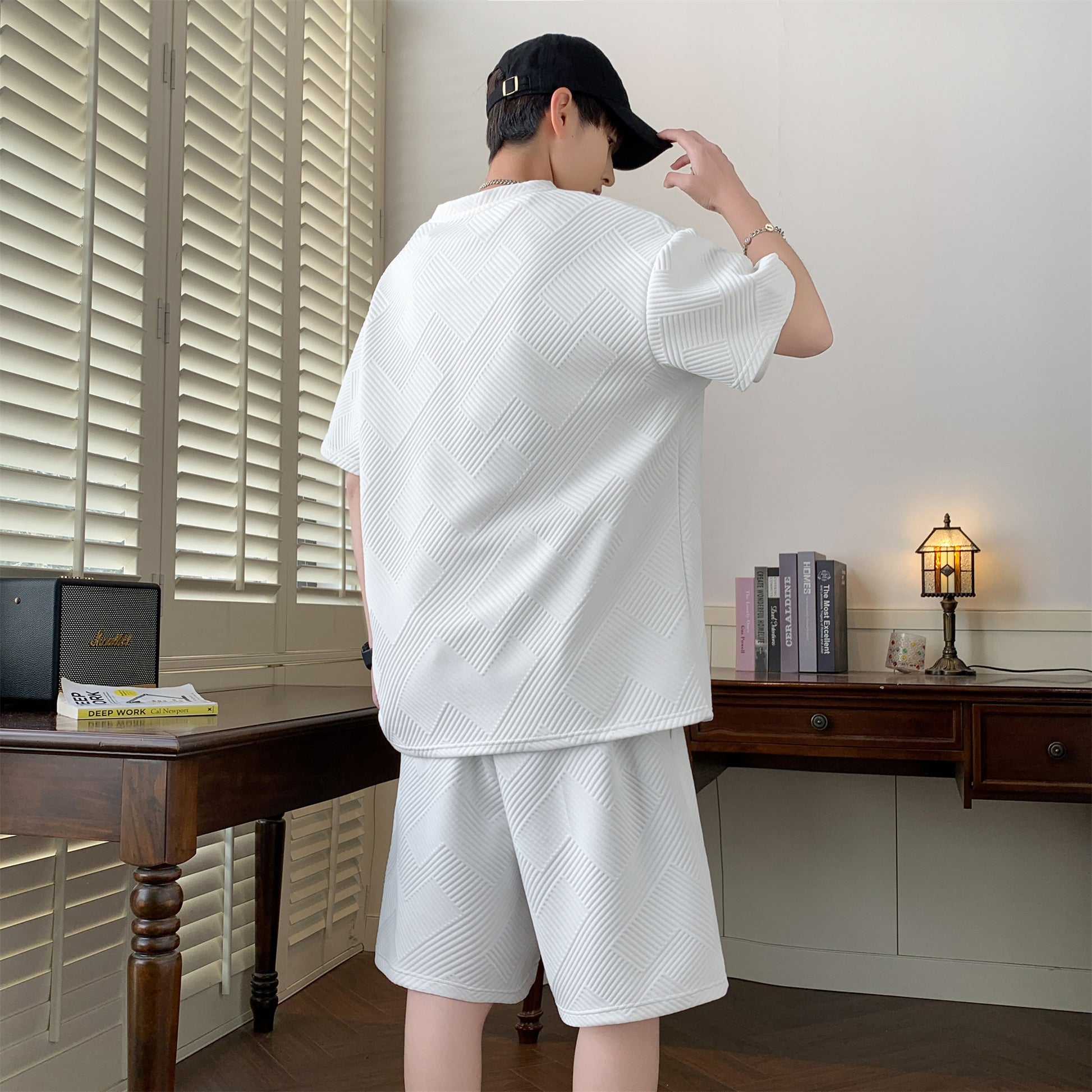 IGOI erkaklar sport kostyumi yapon-Gonkong uslubida. To'plam kalta yengli va tushirilgan yelkali keng, ochiq yoqali futbolka va tizzagacha uzunlikdagi belbog'li shortilardan iborat. Yoz uchun yengil va qulay variant, sport va ochiq havoda o'tkaziladigan mashg'ulotlar uchun ideal.