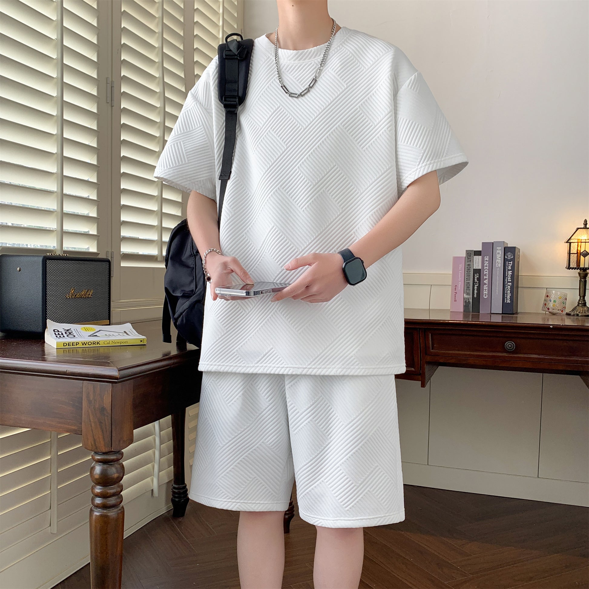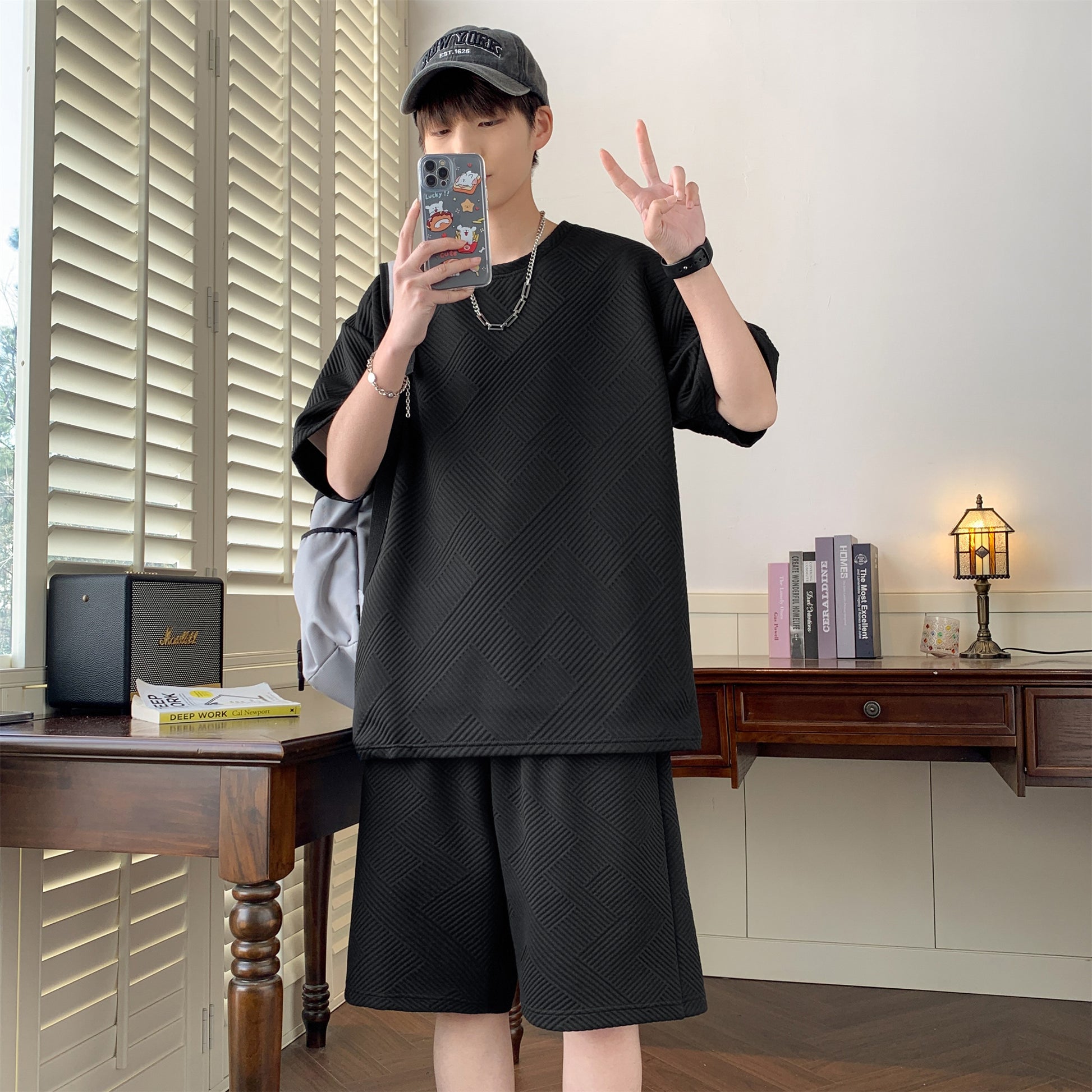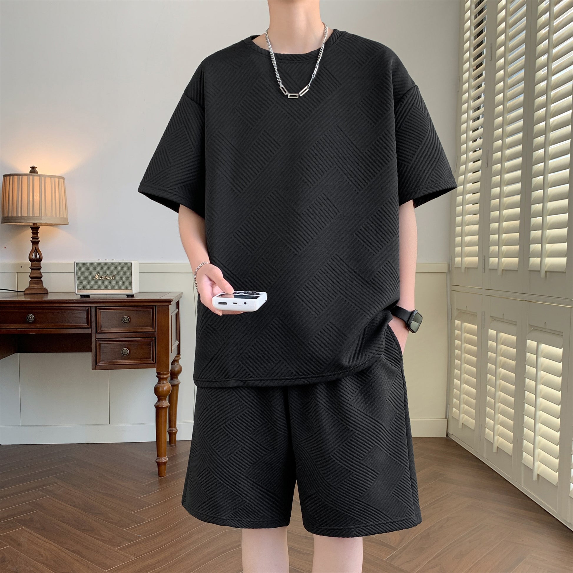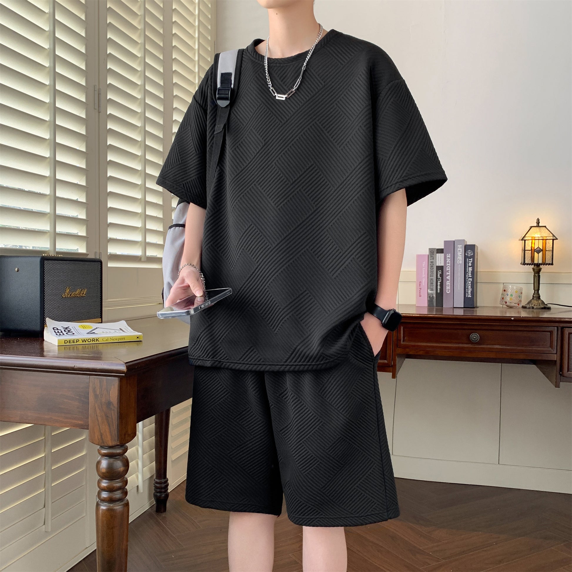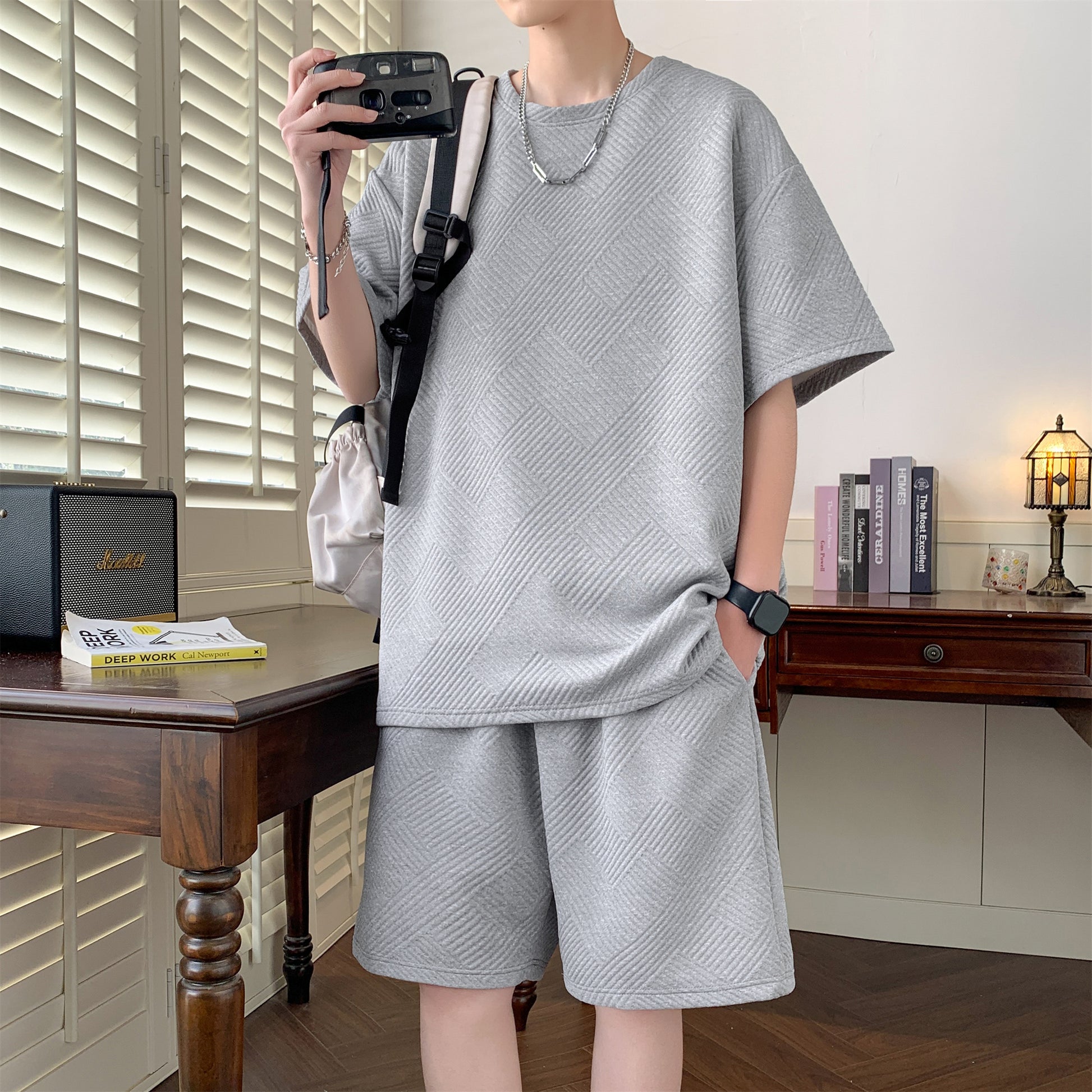 IGOI erkaklar sport kostyumi yapon-Gonkong uslubida. To'plam kalta yengli va tushirilgan yelkali keng, ochiq yoqali futbolka va tizzagacha uzunlikdagi belbog'li shortilardan iborat. Yoz uchun yengil va qulay variant, sport va ochiq havoda o'tkaziladigan mashg'ulotlar uchun ideal.