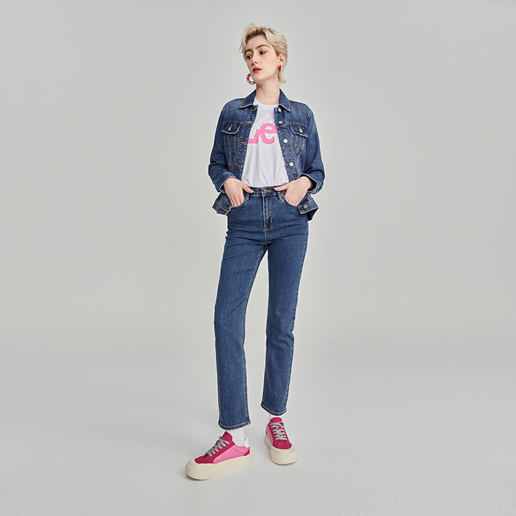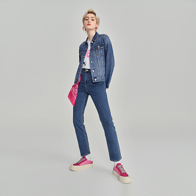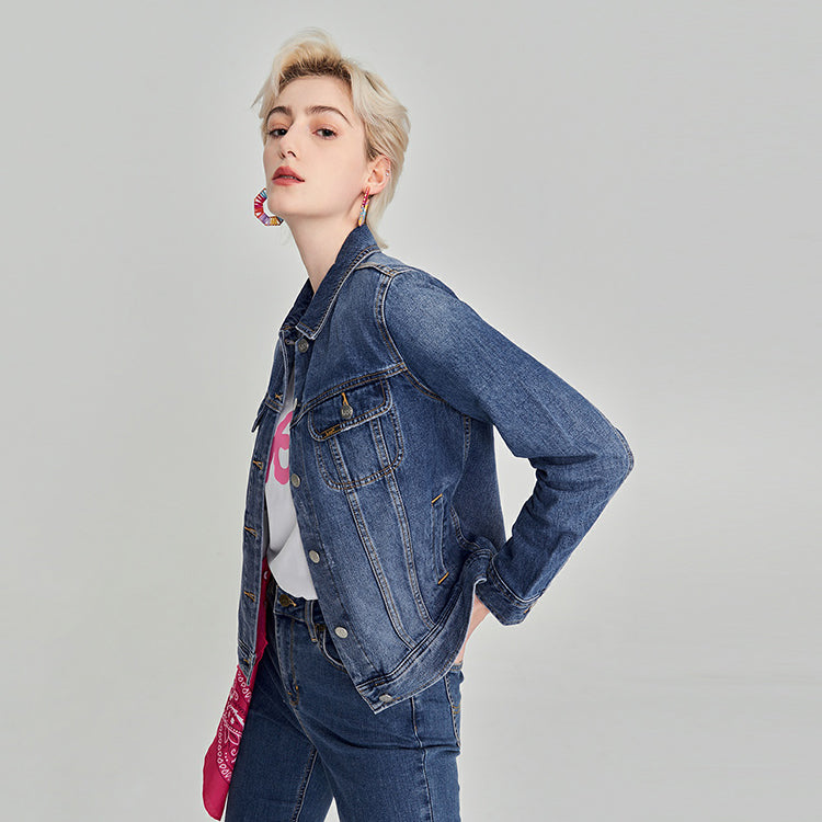 Li vintage lapel bir koʻkrakli uzun yengli qulay jinsi kurtkasi oʻrta koʻk